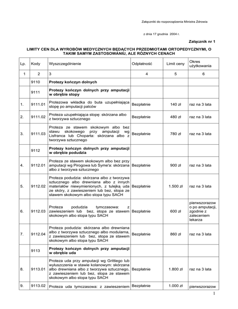 Załączniki do rozporządzenia Ministra Zdrowia z dnia 17 grudnia 2004 r. Załącznik nr 1 LIMITY CEN DLA WYROBÓW MEDYCZNYCH BĘDĄCYCH PRZEDMIOTAMI ORTOPEDYCZNYMI, O TAKIM SAMYM ZASTOSOWANIU, ALE RÓZNYCH CENACH Lp. Kody 1 2 Wyszczególnienie 3 Odpłatność 4 Limit ceny 5 Okres użytkowania 6 9110 Protezy kończyn dolnych 9111 Protezy kończyn dolnych przy amputacji w obrębie stopy 1. 9111.01 Protezowa wkładka do buta uzupełniająca Bezpłatnie stopę po amputacji palców 140 zł raz na 3 lata 2. 9111.02 Proteza uzupełniająca stopę: skórzana albo z tworzywa sztucznego Bezpłatnie 480 zł raz na 3 lata 3. Proteza ze stawem skokowym albo bez stawu skokowego przy amputacji wg 9111.03 Bezpłatnie Lisfranca lub Choparta: skórzana albo z tworzywa sztucznego 780 zł raz na 3 lata 9112 Protezy kończyn dolnych przy amputacji w obrębie podudzia 4. Proteza ze stawem skokowym albo bez przy 9112.01 amputacji wg Pirogowa lub Syme'a: skórzana Bezpłatnie albo z tworzywa sztucznego 900 zł raz na 3 lata 5. Proteza podudzia: skórzana albo z tworzywa sztucznego albo drewniana albo z innych 9112.02 materiałów niewymienionych, z tulejką uda Bezpłatnie ze skóry, z zawieszeniem lub bez, stopa ze stawem skokowym albo stopa typu SACH 1.500 zł raz na 3 lata 6. Proteza podudzia tymczasowa: z 9112.03 zawieszeniem lub bez, stopa ze stawem Bezpłatnie skokowym albo stopa typu SACH 600 zł pierwszorazow o po amputacji, zgodnie z zaleceniem lekarza 7. Proteza podudzia: skórzana albo drewniana albo z tworzywa sztucznego albo modularna, 9112.04 Bezpłatnie z zawieszeniem lub bez, stopa ze stawem skokowym albo stopa typu SACH 860 zł raz na 3 lata 8. Proteza uda przy amputacji wg Grittiego lub wyłuszczenia w stawie kolanowym: skórzana 9113.01 albo drewniana albo z tworzywa sztucznego, Bezpłatnie z zawieszeniem lub bez, stopa ze stawem skokowym albo stopa typu SACH 1.800 zł raz na 3 lata 9. 9113.02 Proteza uda tymczasowa: z zawieszeniem Bezpłatnie 1.000 zł pierwszorazow 9113 Protezy kończyn dolnych przy amputacji w obrębie uda 1 lub bez, stopa ze stawem skokowym albo stopa typu SACH o po amputacji, zgodnie z zaleceniem lekarza 10. Proteza uda: drewniana albo z tworzywa 9113.03 sztucznego, z zawieszeniem lub bez, stopa Bezpłatnie ze stawem skokowym albo stopa typu SACH 1.600 zł raz na 3 lata 11. Proteza uda z lejem kikutowym skórzanym: goleń i kolano drewniane albo goleń i kolano z tworzywa sztucznego albo goleń ze skóry 9113.04 Bezpłatnie albo z drewna albo z tworzywa, z zawieszeniem lub bez, stopa ze stawem skokowym albo stopa typu SACH 1.700 zł raz na 3 lata 12. Proteza uda modularna: z miękkim pokryciem ciałopodobnym albo proteza z innych niewymienionych Bezpłatnie 9113.05 wykonana materiałów, z zawieszeniem lub bez, stopa ze stawem skokowym albo stopa typu SACH 2.800 zł raz na 3 lata 13. 9113.06 Proteza uda szczudłowa 470 zł raz na 3 lata 3.000 zł raz na 3 lata 9114 Bezpłatnie Protezy kończyn dolnych przy pełnej amputacji w obrębie uda (wyłuszczenie w stawie biodrowym) 14. Proteza przy wyłuszczeniu w stawie biodrowym: typ kanadyjski albo 9114.01 Bezpłatnie konwencjonalny, stopa ze stawem skokowym albo stopa typu SACH 15. Proteza tymczasowa przy wyłuszczeniu w 9114.02 stawie biodrowym: stopa ze stawem Bezpłatnie skokowym albo stopa typu SACH 2.600 zł pierwszorazow o po amputacji, zgodnie z zaleceniem lekarza 16. Kosz biodrowy przy obustronnym wyłuszczeniu w stawach biodrowych: 9114.03 Bezpłatnie skórzany albo z tworzywa sztucznego, z uchwytami dla kończyn górnych 1.100 zł raz na 3 lata 17. Protezowe wyrównanie skrótu kończyny 9114.04 dolnej: stopa ze stawem skokowym albo Bezpłatnie stopa typu SACH, z zawieszeniem lub bez 1.200 zł raz na 3 lata 9115 Wyposażenie dodatkowe kończyn dolnych 18. 9115.01 Bezpłatnie 12 Pończocha kikutowa - przy amputacji w sztuk na każdą obrębie stopy kończynę 18 zł raz na 1 rok 19. 9115.02 Pończocha podudzia Bezpłatnie 12 sztuk na każdą kończynę 18 zł raz na 1 rok 20. 9115.03 Pończocha kikutowa - przy amputacji uda Bezpłatnie 12 sztuk na każdą kończynę 17 zł raz na 1 rok 21. Pończocha kikutowa albo majteczki przy jednostronnej pełnej amputacji kończyny Bezpłatnie 12 9115.04 dolnej albo majteczki przy obustronnej pełnej sztuk amputacji kończyn dolnych 30 zł raz na 1 rok kikutowa - do przy protez amputacji 2 9120 Protezy kończyn górnych 22. 9120.01 Proteza kosmetyczna części ręki Bezpłatnie 370 zł raz na 3 lata 23. Proteza kosmetyczna przedramienia: 9120.02 skórzana albo z tworzywa sztucznego, z Bezpłatnie dłonią protezową, z zawieszeniem lub bez 550 zł raz na 3 lata 24. Proteza kosmetyczna przedramienia: z elementów modularnych, z miękkim 9120.03 Bezpłatnie pokryciem ciałopodobnym, z dłonią protezową, z zawieszeniem lub bez 650 zł raz na 3 lata 25. Proteza kosmetyczna przedramienia: 9120.04 skórzana albo z tworzywa sztucznego, z Bezpłatnie tulejką ramienia, z dłonią protezową 650 zł raz na 3 lata 26. Proteza kosmetyczna przedramienia: z elementów modularnych, z tulejką ramienia, 9120.05 Bezpłatnie z miękkim pokryciem ciałopodobnym, z dłonią protezową 850 zł raz na 3 lata 27. Proteza kosmetyczna ramienia: z elementów modularnych, z miękkim pokryciem 9120.06 Bezpłatnie ciałopodobnym, z dłonią protezową, z zawieszeniem lub bez 1.100 zł raz na 3 lata 28. Proteza kosmetyczna ramienia: skórzana albo z tworzywa sztucznego, lej ze skóry 9120.07 Bezpłatnie albo z tworzywa, z dłonią protezową, z zawieszeniem lub bez 950 zł raz na 3 lata 29. Proteza kosmetyczna całej kończyny górnej: ze stawem barkowym albo bez stawu 9120.08 barkowego: skórzana albo z tworzywa Bezpłatnie sztucznego, z dłonią protezową, z zawieszeniem lub bez 1.000 zł raz na 3 lata 30. Proteza kosmetyczna całej kończyny górnej: ze stawem barkowym albo bez stawu 9120.09 barkowego, z elementów modularnych, z Bezpłatnie miękkim pokryciem ciałopodobnym, z dłonią protezową, 
