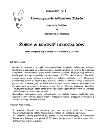Komunikat nr 1 Stowarzyszenie Miłośników Żubrów zaprasza Państwa na Konferencję naukową ŻUBRY W KRAINIE DINOZAURÓW która odbędzie się w dniach 8-9 września 2016 roku Cel Konferencji Będzie to czternaste w cyklu międzynarodowe spotkanie poświęcone żubrowi. Konferencja odbędzie się w Bałtowie (woj. świętokrzyskie) na terenie Bałtowskiego Kompleksu Turystycznego, gdzie oprócz zagrody z żubrami znajduje się pierwszy w Polsce park tematyczny poświęcony dinozaurom. W 2001 roku dr Gerard Gierliński zainspirowany przez jednego z największych polskich geologów – prof. Zbigniewa Kotańskiego odkrył w rejonie tzw. Czarciej Stopki w Bałtowie tropy dinozaurów pochodzące z okresu jury. W 2004 roku na tym terenie otwarto Bałtowski Park Jurajski pod patronatem Stowarzyszenia Delta. Obecnie Bałtowski Kompleks Turystyczny zajmuje obszar ponad 60 ha i prowadzi wspaniały zwierzyniec. Od maja 2011 mieszka tu także stado żubrów. Odwiedziny zwierzyńca (safari schoolbusem) są częścią naszego spotkania, poza głównym celem wymiany doświadczeń i przedyskutowania bieżących problemów z zakresu ochrony i hodowli żubrów. Program Konferencji 7 września (środa) przewidziany jest na przyjazd gości do Ostrowca Świętokrzyskiego do hotelu Accademia ul. 3 Maja 13 i wieczorne spotkanie. W czwartek (8.09) planowane są obrady w sali konferencyjnej w Bałtowskim Zapiecku w Bałtowie, a w piątek (9.09) kontynuacja obrad i safari w zwierzyńcu bałtowskim z wizytą u żubrów. Po konferencji 10. września planujemy także, dla osób zainteresowanych, wycieczkę do fabryki porcelany w Ćmielowie (produkcja od 1838 roku) oraz do kopalni krzemienia pasiastego w Krzemionkach Opatowskich (czynnych już ok. 3900-1600 p.n.e). Uczestnicy konferencji będą zakwaterowani w hotelu Accademia w Ostrowcu Świętokrzyskim przy ul. Alei 3 Maja 13 w pokojach jedno i dwuosobowych. Zapraszamy do podzielenia się wynikami prac i doświadczeniem w formie prezentacji ustnych (ok. 10-15 minut) lub posterów. Oba rodzaje wystąpień prosimy przygotować w wersji elektronicznej. Zachęcamy również do publikacji prac lub referatów w dziewiątym numerze „European Bison Conservation Newsletter”. Publikowane prace - wyłącznie w języku angielskim - będą recenzowane. Szczegóły dotyczące zasad przygotowywania prac znajdują się na stronie Stowarzyszenia Miłośników Żubrów (www.smz.waw.pl) w zakładce WYDAWNICTWA - BIULETYN. Referaty w języku polskim lub angielskim będą publikowane jako materiały konferencyjne wraz ze streszczeniami. Prosimy o przygotowanie streszczeń w dwóch językach o objętości od 1500 do 3000 znaków (w każdym języku) zawierających tytuł, nazwiska autorów i ich afiliację. Szczegółowy program wystąpień zostanie ustalony po zebraniu zgłoszeń i przesłany w kolejnym komunikacie. Terminy Termin przysłania zgłoszeń 30 kwietnia 2016 r. Termin przysłania pełnych prac do publikacji 30 maja 2016 r.(nieprzekraczalny !) Termin przysłania streszczeń (w dwóch językach) 1 lipca 2014 r. Zgłoszenie, prace, streszczenia proszę przesyłać tylko w wersji elektronicznej, na jeden z adresów: [email protected] lub [email protected] Koszt uczestnictwa i miejsce obrad Konferencja odbędzie się w Bałtowskim Zapiecku (Bałtowski Kompleks Turystyczny), Bałtów 169A (noclegi w hotelu Accademia w Ostrowcu Świętokrzyskim, Aleja 3 Maja 13). Koszty konferencji wyniosą około 400,00 zł od osoby nie będącej członkiem SMŻ i 350,00 zł od członka SMŻ i będą obejmowały: - materiały konferencyjne - wyżywienie (kolacja 7 września, wyżywienie 8 i 9 września) - przejazd do Bałtowa. Koszty noclegów pokrywane są oddzielnie i wyniosą ca. 90 – 130 zł od osoby za dobę (płatne w hotelu). Koszty wycieczki do Ćmielowa i Krzemionek Opatowskich pokrywane są także oddzielnie. Koszt zależy od liczby chętnych (wynajęcie mniejszego lub większego autokaru). Wysokość opłaty będzie podana po wstępnym zgłoszeniu chętnych (do 30 kwietnia) a osoby rezerwujące miejsce będą proszone o dokonanie wpłat do 1 lipca 2016 roku. Uprzejmie prosimy o dokonanie wpłat uczestnictwa do 1 lipca 2016 r. Po 1 lipca koszty będą o 10% wyższe. Wpłaty kosztów uczestnictwa na konto: Bank Rachunek nr: Właściciel: PEKAO SA IX o-Wa 56 1240 1125 1111 0010 0872 7386 Stowarzyszenie Miłośników Żubrów Ciszewskiego 8, 02-786 Warszawa Z dopisaniem „Konferencja” i nazwiskiem uczestnika Organizatorzy będą się starać o obniżenie kosztów uczestnictwa. Kontakt Opieka merytoryczna Prof. dr hab. Wanda Olech Katedra Genetyki i Ogólnej Hodowli Zwierząt SGGW kom. 0-605-095-501, tel (22) 593-65-78, fax. (22) 593-65-76; e-mail – [email protected] Sprawy organizacyjne dr Magdalena Matuszewska Stowarzyszenie Miłośników Żubrów ul. Ciszewskiego 8 pok. 42, 02-786 Warszawa kom. 0-691-159-089, Tel. (22) 593-65-80; e-mail: [email protected] Bardzo prosimy o przesłanie zgłoszenia udziału na załączonym formularzu do końca kwietnia 2016 roku. Serdecznie zapraszamy! Konferencja ŻUBRY W KRAINIE DINOZAURÓW 8-9 Proszę wysłać do: WRZEŚNIA 2016 ROK KARTA ZGŁOSZENIA UCZESTNICTWA [email protected] lub [email protected] Imię i nazwisko Instytucja: telefon: Tel kom. e-mail: Czy Pan/Pani chce wygłosić prezentację 10-15 min.: TAK NIE Czy Pan/Pani chce przedstawić poster: TAK NIE Czy Pan/Pani chce opublikować pełny tekst wystąpienia materiałach konferencyjnych: TAK NIE Czy chce Pan/Pani opublikować pracę naukową w EB Newsletter 2016: TAK NIE Czy Pan/Pani zgłasza chęć wzięcia udziału w wycieczce do Ćmielowa i Krzemionek w dniu 10.09.2016 r. TAK NIE Czy Pan/Pani zainteresowany jest noclegiem 10/11.09 TAK NIE Tytuł pracy: Proszę o 7/8 IX 2016 8/9 IX 2016 9/10 IX 2016 zarezerwowanie TAK / NIE TAK / NIE TAK / NIE noclegów: Inne dodatkowe informacje: (np. rodzaj diety). Prosimy o sugestie dotyczące współmieszkańca. DANE DO FAKTURY: Instytucja
