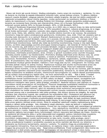 Rak - zabójca numer dwa Słowo rak brzmi jak wyrok śmierci. Według onkologów, mamy wręcz do czynienia z epidemią. Co roku na świecie na chorobę tę zapada kilkanaście milionów ludzi, ponad połowa umiera. To główny zabójca naszych czasów — ustępuje jedynie chorobom układu krążenia. Ale jest też dobra wiadomość: w większości przypadków rakowi można zapobiec. Liczba zachorowań na nowotwory złośliwe w Polsce należy do najwyższych w Europie. Według Polskiej Unii Onkologii, odsetek pacjentów podejmujących leczenie we wczesnej fazie choroby jest czterokrotnie niższy niż w Europie Zachodniej i USA, a odsetek wyleczeń wynosi jedynie 30% (w Europie — 40%, w USA — 50%). Z danych Światowej Organizacji Zdrowia wynika, że w 2002 roku w naszym kraju na raka zachorowało prawie 90 tys. ludzi, zmarło ponad 85 tys. To 25% wszystkich zgonów1. Lekarze prognozują, że w ciągu 20 lat liczba zachorowań i zgonów z powodu raka ulegnie podwojeniu. To choroba ściśle związana ze stylem życia. Dieta, leki, alkohol, tytoń, stres to bardzo istotne czynniki w jej rozwoju. Na powstanie nowotworu mają też wpływ predyspozycje genetyczne, środowisko, rasa, wiek. Choć rak uważany jest za chorobę ludzi starszych2, to w samych Stanach Zjednoczonych co roku z powodu raka umiera 1,5 tys. dzieci poniżej 16 roku życia3 — więcej niż z powodu chorób zakaźnych. Co inicjuje raka? Rak rozwija się z pojedynczej komórki, która pod wpływem czynnika inicjującego (karcynogen) ulega transformacji nowotworowej. Jednak aby stała się komórką nowotworową, muszą w niej zajść dalsze zmiany, za które odpowiadają czynniki promujące (kokarcynogeny). Jak twierdzi dr Vernon W. Foster4, rak nie rozwinie się, jeśli któryś z tych procesów — inicjacji i promocji — nie będzie miał miejsca. Do czynników środowiskowych mogących działać jako inicjator lub promotor raka należą: promieniowanie (ultrafioletowe, rentgenowskie, cieplne), karcynogeny chemiczne (dym tytoniowy, napoje alkoholowe, chemikalia przemysłowe), stres. Zmiany w genach wywołane przez czynniki inicjujące zachodzą zwykle szybko i są nieodwracalne. Promotory działają natomiast przez dłuższy czas, np. przez lata, i skutkom ich działania można zapobiec, a nawet je odwrócić. Promotorami są m.in. tłuszcze spożywcze, fenobarbital, hormony, aflatoksyny, sacharyna, azbest, węglowodory, syntetyczne estrogeny, stres. W powstawaniu raka nie można też pominąć roli wirusów5. Działanie czynników inicjujących może spowodować mutacje genów — niektóre z nich mogą stać się tzw. onkogenami. Do rozwoju raka potrzeba jednak więcej niż jednej mutacji. Pojedyncza mutacja jest zwykle wychwytywana przez siły obronne organizmu i rozmnażanie nieprawidłowych komórek ustaje. Poza tym większość mutacji powoduje śmierć komórki, a nie jej transformację nowotworową. Rak się też nie rozwinie, jeśli nie będzie miało miejsca zjawisko nazywane przez naukowców podatnością. Oznacza to, że nawet jeśli dana osoba będzie wystawiona na działanie wirusów, chemicznych karcynogenów czy małych dawek promieniowania, ale jej system immunologiczny będzie silny, nie musi zachorować na raka. Rak a dieta Z badań wynika, że 70-90% przypadków raka u ludzi jest uwarunkowanych czynnikami środowiskowymi, a profilaktyka chorób nowotworowych w 35-56% zależy od diety6. Nadmiar kalorii, szczególnie tych skoncentrowanych, które zawiera tłuszcz, przyczynia się do dramatycznego wzrostu zagrożenia niektórymi rodzajami raka (piersi, jelita grubego, prostaty)7. Nadmiar tłuszczu jest zdaniem dr. Fostera czynnikiem raczej promującym niż inicjującym. Tłuszcze zwiększają wydzielanie niektórych hormonów w organizmie, co może ułatwić rozwój raka. Groźny może się też okazać nadmiar tłuszczów wielonienasyconych (oleje roślinne), gdyż ich oksydacja może wytworzyć karcynogenne wolne rodniki. Choć cholesterol nie został uznany za bezpośredni czynnik rozwoju nowotworów złośliwych, to może odgrywać pewną rolę w powstawaniu raka jelita grubego. Gdy tłuszcz dociera do żołądka, do wątroby wysyłany jest chemiczny sygnał, aby zwiększyło się wydzielanie żółci. Cholesterol jest głównym jej składnikiem. We florze bakteryjnej osób spożywających mięso dominują bakterie przekształcające cholesterol w karcynogen o budowie przypominającej estrogen. Jeśli dodać do tego zwolniony pasaż jelitowy u ludzi stosujących ubogoresztkową dietę mięsną, to karcynogen będzie oddziaływał na ścianę jelita przez godziny zamiast przez minuty. Może to wyjaśniać zależność między ciężkostrawną dietą mięsną a rakiem jelita grubego. Gdy cholesterol ulega utlenieniu, staje się jednym z najbardziej niebezpiecznych karcynogenów w pożywieniu. Proces ten ma miejsce wtedy, gdy zawierające go pokarmy są wystawione na działanie wysokiej temperatury. Inny rakotwórczy mechanizm związany z tłuszczem dotyczy pieczeni z rusztu. Kapiące na rozgrzany węgiel krople tłuszczu parują, tworząc gaz zawierający benzopiren (główny karcynogen dymu tytoniowego), którym nasycane jest piekące się mięso. Ocenia się, że zjedzenie pół kilograma steku z grilla odpowiada pod względem wpływu rakotwórczego wypaleniu dwustu papierosów. Naukowcy podejrzewają też, że nadmiar białka w pożywieniu może być czynnikiem zwiększającym ryzyko zachorowania na raka nerki, trzustki, jelita grubego, piersi i endometrium. Należy również pamiętać, że zwiększyło się spożycie produktów wysoko przetworzonych. W celu przedłużenia trwałości z produktów usuwane są cenne wartości jak błonnik czy witaminy, a dodawane są chemiczne konserwanty, azotyny i azotany. Te ostatnie mogą się przekształcać w karcynogenne nitrozaminy. Poza tym dowiedziono, że wędzone mięso i ryby zawierają węglowodory mogące się przyczynić do rozwoju raka. Najprosts