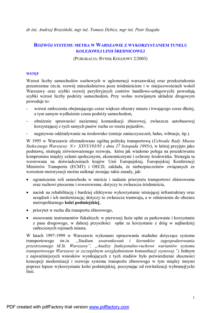 dr inż. Andrzej Brzeziński, mgr inż. Tomasz Dybicz, mgr inż. Piotr Szagała ROZWÓJ SYSTEMU METRA W WARSZAWIE Z WYKORZYSTANIEM TUNELU KOLEJOWEJ LINII ŚREDNICOWEJ (PUBLIKACJA: RYNEK KOLEJOWY 2/2003) WSTĘP Wzrost liczby samochodów osobowych w aglomeracji warszawskiej oraz przekształcenia przestrzenne (m.in. rozwój mieszkalnictwa poza śródmieściem i w miejscowościach wokół Warszawy oraz szybki rozwój peryferyjnych centrów handlowo-usługowych) powodują szybki wzrost liczby podróży samochodem. Przy wolno rozwijanym układzie drogowym powoduje to: - wzrost zatłoczenia obejmującego coraz większe obszary miasta i trwającego coraz dłużej, a tym samym wydłużenie czasu podróży samochodem, - obniżenie sprawności naziemnej komunikacji zbiorowej, zwłaszcza autobusowej korzystającej z tych samych pasów ruchu co reszta pojazdów, - negatywne oddziaływanie na środowisko (emisje zanieczyszczeń, hałas, wibracje, itp.). W 1995 w Warszawie sformułowano ogólną politykę transportową (Uchwała Rady Miasta Stołecznego Warszawy N r XXVI/193/95 z dnia 27 listopada 1995r), w której przyjęto jako podstawę, strategię zrównoważonego rozwoju, która jak wiadomo polega na poszukiwaniu kompromisu między celami społecznymi, ekonomicznymi i ochrony środowiska. Strategia ta wzorowana na doświadczeniach krajów Unii Europejskiej, Europejskiej Konferencji Ministrów Transportu (ECMT) i OECD, zakłada, że niebezpieczeństw związanych ze wzrostem motoryzacji można uniknąć stosując takie zasady, jak: • ograniczenie roli samochodu w mieście i nadanie priorytetu transportowi zbiorowemu oraz ruchowi pieszemu i rowerowemu; dotyczy to zwłaszcza śródmieścia, • nacisk na rehabilitację i bardziej efektywne wykorzystanie istniejącej infrastruktury oraz urządzeń i ich modernizację; dotyczy to zwłaszcza tramwaju, a w odniesieniu do obszaru metropolitarnego kolei podmiejskiej, • priorytet w ruchu dla transportu zbiorowego, • stosowanie instrumentów fiskalnych: w pierwszej fazie opłat za parkowanie i korzystanie z pasa drogowego, w dalszej przyszłości opłat za korzystanie z dróg w najbardziej zatłoczonych rejonach miasta. W latach 1997-1999 w Warszawie wykonano opracowania studialne dotyczące systemu transportowego (m.in. „Studium uwarunkowań i kierunków zagospodarowania przestrzennego M.St. Warszawy”, „Analizy funkcjonalno-ruchowe wariantów systemu transportowego Warszawy ze szczególnym uwzględnieniem komunikacji szynowej.”) Jednym z najważniejszych wniosków wynikających z tych studiów było potwierdzenie słuszności koncepcji modernizacji i rozwoju systemu transportu zbiorowego w tym między innymi poprzez lepsze wykorzystanie kolei podmiejskiej, poczynając od rewitalizacji wybranej(ych) linii. 1 PDF created with pdfFactory trial version www.pdffactory.com METRO W TUNELU LINII ŚREDNICOWEJ Analiza obecnych obciążeń komunikacji zbiorowej w Warszawie (np. tramwaju w Al. Jerozolimskich) oraz wyniki dotychczas wykonywanych prognoz przewozów pasażerskich (tramwaj, metro, kolej) wskazują na pilną konieczność, sprawnego szybkiego i cechującego się dużą przepustowością, szynowego środka transportu zbiorowego uruchomienia wzdłuż osi transportowej wschód-zachód. Władze miasta od lat planują realizację II i III linii metra. Ich przebieg i sposób realizacji był wielokrotnie analizowany, w tym m.in. w opracowaniu „Studium techniczne II i III linii metra warszawskiego”. Wnioski z tego opracowania posłużyły do ustalenia przebiegu; - II linii metra: z Bemowa wzdłuż ciągu Kasprzaka-Świętokrzyska przez Dworzec Wileński na Bródno (19 stacji) i - III linii metra: z centrum Pragi na Gocław (7 stacji). We wszystkich dotychczas analizowanych wariantach rozwoju systemu metra zakładano konieczność budowy nowych linii od podstaw, w tym przy założeniu drążenia tunelu, szczególnie kosztownego na odcinkach śródmiejskich (np. na II linii, odcinek Rondo Daszyńskiego-Dw. Wileński). W rezultacie biorąc pod uwagę wysokie koszty budowy (w tunelu średnio 230 mln zł/km i odkrywkowo – 120mln zł) oraz ograniczone środki finansowe będące w dyspozycji Warszawy szanse powodzenia realizacji tych koncepcji należy uznać za niewielkie. Rozważaną obecnie możliwość budowy II linii metra w oparciu o koncepcję partnerstwa publiczno-prywatnego należy uznać także za bardzo dyskusyjną. Spodziewane wysokie koszty budowy tunelu i zakupu taboru będą bowiem skutkować bardzo wysokimi ratami spłat zaciągniętych pożyczek. Na długie lata będzie to osłabiać zdolność Miasta do finansowania innych zadań w zakresie transportu zbiorowego (modernizacji tramwaju, wymiany taboru autobusowego i kolejowego, rewitalizacji kolei, itp.) Stąd też słuszne wydaje się poszukiwanie alternatywnych rozwiązań, które umożliwiałyby (nie wykluczając w dalszej przyszłości realizacji II linii metra pod ul. Świętokrzyską) uruchomienie linii metra na kierunku wschód-zachód w stosunkowo krótkim czasie (np. 3 lat) przy znaczącym ograniczeniu środków inwestycyjnych wydawanych na ten cel. Rozwiązanie takie jest możliwe dzięki adaptacji do tego celu kolejowego tunelu średnicowego (pod Al. Jerozolimskimi) wykorzystywanego obecnie przez pociągi aglomeracyjne. Rozwiązanie to obejmuje: - wprowadzenie do tunelu średnicowego pociągów metra, kursujących wahadłowo pomiędzy stacjami Wschodnia i Zachodnia, - wycofanie z tunelu średnicowego pociągów podmiejskich, - skoordynowanie ruchu pociągów metra z ruchem pociągów aglomeracyjnych z Otwocka, Grodziska, Mińska Mazwieckiego, Sochaczewa i Piaseczna – przesiadka pasażerów z pociągów aglomeracyjnych do metra na dwóch stacjach krańcowych: Wschodnia i Zachodnia. CHARAKTERYSTYKA KONCEPCJI W proponowanej koncepcji metra w tunelu średnicowym zakłada się możliwość etapowego dochodzenia do rozwiązania docelowego. Przyjmując jako warunki podstawowe konie