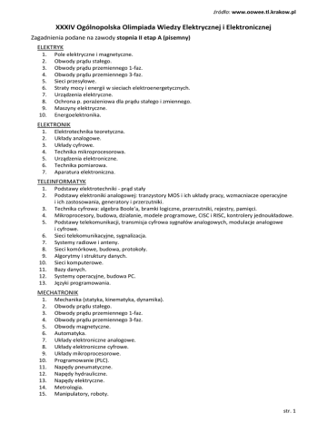 źródło: www.oowee.tl.krakow.pl XXXIV Ogólnopolska Olimpiada Wiedzy Elektrycznej i Elektronicznej Zagadnienia podane na zawody stopnia II etap A (pisemny) ELEKTRYK 1. 2. 3. 4. 5. 6. 7. 8. 9. 10. Pole elektryczne i magnetyczne. Obwody prądu stałego. Obwody prądu przemiennego 1-faz. Obwody prądu przemiennego 3-faz. Sieci przesyłowe. Straty mocy i energii w sieciach elektroenergetycznych. Urządzenia elektryczne. Ochrona p. porażeniowa dla prądu stałego i zmiennego. Maszyny elektryczne. Energoelektronika. ELEKTRONIK 1. 2. 3. 4. 5. 6. 7. Elektrotechnika teoretyczna. Układy analogowe. Układy cyfrowe. Technika mikroprocesorowa. Urządzenia elektroniczne. Technika pomiarowa. Aparatura elektroniczna. TELEINFORMATYK 1. 2. 3. 4. 5. 6. 7. 8. 9. 10. 11. 12. 13. Podstawy elektrotechniki - prąd stały Podstawy elektroniki analogowej: tranzystory MOS i ich układy pracy, wzmacniacze operacyjne i ich zastosowania, generatory i przerzutniki. Technika cyfrowa: algebra Boole'a, bramki logiczne, przerzutniki, rejestry, pamięci. Mikroprocesory, budowa, działanie, modele programowe, CISC i RISC, kontrolery jednoukładowe. Podstawy telekomunikacji, transmisja cyfrowa sygnałów analogowych, modulacje analogowe i cyfrowe. Sieci telekomunikacyjne, sygnalizacja. Systemy radiowe i anteny. Sieci komórkowe, budowa, protokoły. Algorytmy i struktury danych. Sieci komputerowe. Bazy danych. Systemy operacyjne, budowa PC. Języki programowania. MECHATRONIK 1. 2. 3. 4. 5. 6. 7. 8. 9. 10. 11. 12. 13. 14. 15. Mechanika (statyka, kinematyka, dynamika). Obwody prądu stałego. Obwody prądu przemiennego 1-faz. Obwody prądu przemiennego 3-faz. Obwody magnetyczne. Automatyka. Układy elektroniczne analogowe. Układy elektroniczne cyfrowe. Układy mikroprocesorowe. Programowanie (PLC). Napędy pneumatyczne. Napędy hydrauliczne. Napędy elektryczne. Metrologia. Manipulatory, roboty. str. 1 źródło: www.oowee.tl.krakow.pl Zagadnienia podane na zawody stopnia II etap B (praktyczny) ELEKTRYK 1. 2. 3. 4. 5. Maszyny wirujące prądu stałego - badanie i pomiary. Maszyny wirujące prądu zmiennego - badanie i pomiary. Transformatory - badanie i pomiary. Układy sterowania przekaźnikowo-stycznikowe. Układy zabezpieczeń i sygnalizacji. ELEKTRONIK 1. 2. Pomiary w układach analogowych, wyznaczanie parametrów elektrycznych. Tworzenie i uruchamianie programów w asemblerze ( w oparciu o system mikroprocesorowy DSM-51 firmy MicroMade wersja 3). TELEINFORMATYK 1. 2. 3. 4. 5. 6. Instalacja i konfiguracja systemów operacyjnych Windows z technologią NT. Udostępnianie zasobów dla grup roboczych (pliki, drukarki, połączenia sieciowe). Instalacja i konfiguracja interfejsów sieciowych. Zasady zabezpieczania usług sieciowych. Tworzenie stron internetowych, technologie: HTML, PHP, XML, JSP. Systemy baz danych i zarządzanie nimi: MSSQL, PostgresSQL, MySQL. MECHATRONIK 1. 2. Programowanie sterownika PLC firmy Fatek typ FBs, program narzędziowy WinProladder (dostępny w pełnej wersji z symulatorem na stronie firmy Multiprojekt), połączonego z obiektami sterowania, elementami sensoryki, elektromechaniki i sygnalizacji. Napisany na sterownik program powinien realizować zadany cykl pracy układu. Dodatkowe zadanie to analiza prawności działania układu i diagnostyka jego elementów. Układy sterowania przekaźnikowego lub elektropneumatycznego z elementami logiki, sensoryki i sygnalizacji. Zadaniem uczestników będzie zaprojektowanie, montaż i przetestowanie działania układu realizującego określony cykl pracy. UWAGA Część praktyczna odbywać będzie się na stanowiskach laboratoryjnych, gdzie uczestnicy powinni wykazać się wiedzą i umiejętnościami praktycznymi w zakresie doboru elementów, montażu, diagnostyki, programowania i uruchamiania układów sterowania. str. 2