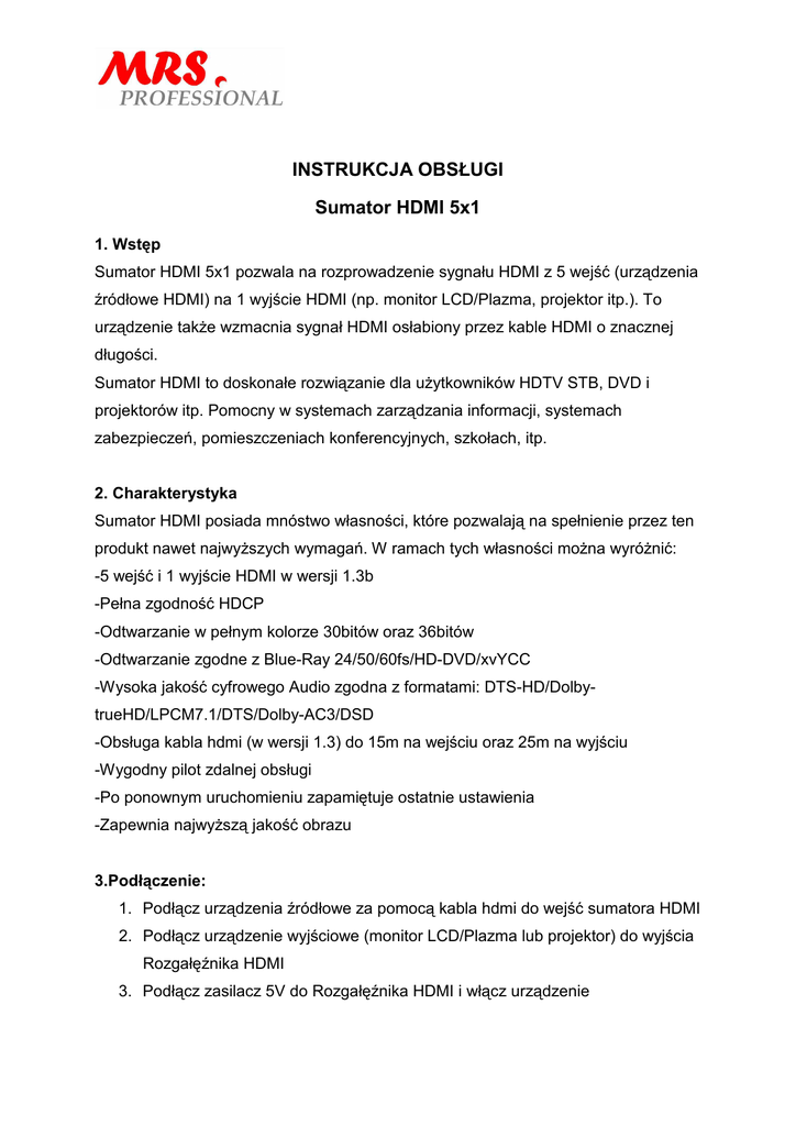 INSTRUKCJA OBSŁUGI Sumator HDMI 5x1 1. Wstęp Sumator HDMI 5x1 pozwala na rozprowadzenie sygnału HDMI z 5 wejść (urządzenia źródłowe HDMI) na 1 wyjście HDMI (np. monitor LCD/Plazma, projektor itp.). To urządzenie takŜe wzmacnia sygnał HDMI osłabiony przez kable HDMI o znacznej długości. Sumator HDMI to doskonałe rozwiązanie dla uŜytkowników HDTV STB, DVD i projektorów itp. Pomocny w systemach zarządzania informacji, systemach zabezpieczeń, pomieszczeniach konferencyjnych, szkołach, itp. 2. Charakterystyka Sumator HDMI posiada mnóstwo własności, które pozwalają na spełnienie przez ten produkt nawet najwyŜszych wymagań. W ramach tych własności moŜna wyróŜnić: -5 wejść i 1 wyjście HDMI w wersji 1.3b -Pełna zgodność HDCP -Odtwarzanie w pełnym kolorze 30bitów oraz 36bitów -Odtwarzanie zgodne z Blue-Ray 24/50/60fs/HD-DVD/xvYCC -Wysoka jakość cyfrowego Audio zgodna z formatami: DTS-HD/DolbytrueHD/LPCM7.1/DTS/Dolby-AC3/DSD -Obsługa kabla hdmi (w wersji 1.3) do 15m na wejściu oraz 25m na wyjściu -Wygodny pilot zdalnej obsługi -Po ponownym uruchomieniu zapamiętuje ostatnie ustawienia -Zapewnia najwyŜszą jakość obrazu 3.Podłączenie: 1. Podłącz urządzenia źródłowe za pomocą kabla hdmi do wejść sumatora HDMI 2. Podłącz urządzenie wyjściowe (monitor LCD/Plazma lub projektor) do wyjścia Rozgałęźnika HDMI 3. Podłącz zasilacz 5V do Rozgałęźnika HDMI i włącz urządzenie 4. Specyfikacja Wersja HDMI HDMI 1.3 Zgodność HDCP HDCP1.2 Obsługiwane Rozdzielczości HDMI Obsługiwane formaty koloru video Obsługiwane formaty Audio Wzmocnienie Sygnał TMDS na wejściu/wyjściu 24/50/60fs/1080p/1080i/720p/576p/576i/480p/480i 24bit/deep color 30bit,36bit DTS-HD/Dolby-trueHD/LPCM7.1/DTS/DolbyAC3/DSD 7.5 Gbps/250MHz 0.5~1.5V p-p(TTL) Sygnał DDC na wejściu/wyjściu 5V p-p(TTL) Długość kabla na wejściu ≤15m AWG26 HDMI 1.3 Długość kabla na wyjściu ≤25m AWG26 HDMI 1.3 Temperatura pracy -15° do +55° Wilgotność pracy 5% do 90% RH Zewnętrzny zasilacz DC5V/1A Maksymalne natęŜenie pracy 650mA Wymiary 115x160x24mm Waga 190g 5. Zawartość opakowania Przed uŜytkowaniem upewnij się, Ŝe posiadasz kompletny zestaw: 1) Sumator HDMI 2) Zasilacz 5V DC 3) instrukcja obsługi 4)Pilot