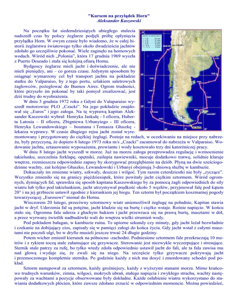 "Kursem na przylądek Horn" Aleksander Kaszowski Na początku lat siedemdziesiątych ubiegłego stulecia nadszedł czas by polscy żeglarze podjęli próbę opłynięcia przylądka Horn. W owym czasie było wiadomo, że w całej historii żeglarstwa światowego tylko około dwadzieścia jachtów zdołało go szczęśliwie pokonać. Wiele zaginęło na hornowych wodach. Wśród nich „Polonia”, która 17 grudnia 1969 wyszła z Puerto Deseado i stała się kolejną ofiarą Hornu. Bydgoscy żeglarze mieli jacht i doświadczenie, ale nie mieli pieniędzy, ani – co gorsza czasu. Jedynym sposobem by osiągnąć wymarzony cel był transport jachtu na pokładzie statku do Valparaiso, by z tego portu, szlakiem saletrowych żaglowców, pożeglować do Buenos Aires. Ogrom trudności, które przyszło im pokonać by taki pomysł zrealizować, jest dziś trudny do wyobrażenia. W dniu 3 grudnia 1972 roku z Gdyni do Valaparaiso wyszedł motorowiec PLO „Czacki”. Na jego pokładzie znajdował się „Euros” i jego załoga. Na tę wyprawą kapitan Aleksander Kaszowski wybrał: Henryka Jaskułę - I oficera, Huberta Latosia – II oficera, Zbigniewa Urbanyiego - III oficera, Henryka Lewandowskiego – bosmana i Tomasza Głuszkę lekarza wyprawy. W czasie długiego rejsu jacht został wyremontowany i przygotowany do ciężkiej żeglugi. Postoje na redach, w oczekiwaniu na miejsce przy nabrzeżu, były przyczyną, że dopiero 6 lutego 1973 roku m/s „Czacki” zacumował do nabrzeża w Valparaiso. Wodowanie jachtu, sztauowanie wyposażenia, prowiantu i wody kosztowało trzy dni katorżniczej pracy. W dniu 8 lutego jacht wyszedł w morze. Już na morzu załoga przeprowadza regulację i wzmocnienie takielunku, uszczelnia forklapę, opętniki, zaślepia nawiewniki, mocuje dodatkowo tratwę, solidnie klaruje wnętrze, rozmieszcza odpowiednio zapasy by skorygować przegłębienie na dziób. Płyną na dwie sześciogodzinne wachty, zaś kolejno Głuszko, Lewandowski i Urbanyi obejmują 3-dniową służbę w kambuzie. Dokuczały im zmienne wiatry, szkwały, deszcze i wilgoć. Tym razem czterdziestki nie były „ryczące”. Wszystko zmieniło się na granicy pięćdziesiątek, które powitały jacht ciężkim sztormem. Wśród ogromnych, dymiących fal, sprawdza się sposób kapitana Kaszowskiego by za pomocą żagli odpowiednich do siły wiatru lub tylko pod takielunkiem, jacht utrzymywał prędkość około 5 węzłów, przyjmował falę pod kątem 20° i na jej grzbiecie ustawił zgodnie z kierunkiem jej biegu. Ten sztorm był początkiem koszmarnej pogody towarzyszącej „Eurosowi” niemal do Hornu. Wieczorem 20 lutego, przeciwny sztormowy wiatr uniemożliwił żeglugę na południe, Kapitan stawia jacht w dryf. Uderzenia fal są potężne, jacht kładzie się na burtę i ciężko wstaje. Rośnie napięcie. W końcu stało się. Ogromna fala uderza z głuchym hukiem i jacht przewraca się na prawą burtę, masztami w dół, a przez wyrwany świetlik nadbudówki wali do wnętrza wielki strumień wody. Pod pokładem bałagan, w kambuzie ruina. Te upiorne sekundy czy minuty, gdy jacht leżał bezwładnie i czekanie na dobijający cios, zapisały się w pamięci załogi do końca życia. Gdy jacht wstał z całymi masztami nie poczuli ulgi, bo w dryfie musieli jeszcze trwać 24 długie godziny. Potem wicher zmienił kierunek na północno -zachodni. Podniesione sztormem fale przekraczają 10 metrów i z rykiem toczą stale załamujące się grzywacze. Sterowanie jest niezwykle wyczerpujące i stresujące. Sternik stale patrzy za rufę, bo tylko wtedy zdoła odpowiednio ustawił jacht do fali, ale ta fala zawisa mu nad głową i wydaje się, że zwali się na niego. Na szczęście tylko grzywacze pokrywają jacht i przemoczonego kompletnie sternika. Po godzinie każdy z nich ma dosyć i zmordowany schodzi pod pokład. Sztorm następował za sztormem, każdy groźniejszy, każdy z wyższymi stanami morza. Mimo krańcowo trudnych warunków, zimna, wilgoci, mokrych ubrań, stałego napięcia i zwykłego strachu, wachty następowały za wachtami a pozycje obserwowane były dokładne. Każde osłabienie wiatru wykorzystano do stawiania dodatkowych płócien, które zawsze zdołano zrzucić w odpowiednim momencie. Można powiedzieć, że życie na jachcie płynęło normalnie. Ale czy normalnym jest, że na trzydniową służbę w kambuzie, gdzie warunki pracy były krańcowo trudne, czekało się z utęsknieniem? W dniach 24 i 25 lutego szalał sztorm, który w szkwałach osiągał siłę huraganu. Na morzu kłębiły góry wodne, często wyższe od grotmasztu. Dymiące grzywacze o trzymetrowej średnicy pokrywały jacht od dziobu do rufy. Pył wodny siekł jak piaskiem po twarzach, zaś widzialność nie przekraczała 100 metrów. Drugiego dnia wieczorem pękła linka sterowa. Przez trzy godziny jacht dryfował wśród rozszalałego oceanu, przez trzy godziny fale przewalały się nad jachtem, nim skuleni w kokpicie żeglarze zgrabiałymi rękoma zdołali założyć oporną stalówkę. Gdy skończyli i jacht wyszedł z dryfu rozpoczął się dzień 26 lutego. Do Hornu zostało zaledwie 250 mil. Zaczęli wierzyć, że nic gorszego już stać się nie może. Wtedy z gradowym szkwałem uderzył huragan. Nad ranem na wiatromierzu zabrakło skali. Prędkość wiatru musiała więc przekroczyć 45 m/sek. Skrzyżowane monstrualne fale nabiegały z trzech kierunków. Niektóre załamywały się nad jachtem inne uderzały w burtę kładąc „Eurosa” masztami na wodzie, na grzbietach niektórych jacht długie chwile pędził pokryty pianą od dziobu do rufy. Takich fal jeszcze nie widzieli, te największe przekraczały 25 metrów. Zapewne ten sztormowy pejzaż był piękny. Tylko, kto miał go podziwiać. Czy kapitan czuwający od wielu dni? Czy załoga, wczepiona w mokre koje, licząca czas do wyjścia na wachtę Czy kuk miotany na wszystkie strony w kambuzie? Czy może sternik, przypięty pasem, wpatrujący s