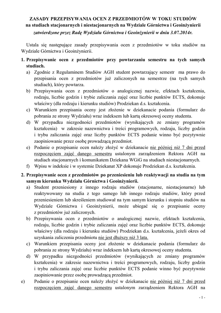 ZASADY PRZEPISYWANIA OCEN Z PRZEDMIOTÓW W TOKU STUDIÓW na studiach stacjonarnych i niestacjonarnych na Wydziale Górnictwa i GeoinŜynierii zatwierdzone przez Radę Wydziału Górnictwa i GeoinŜynierii w dniu 3.07.2014r. Ustala się następujące zasady przepisywania ocen z przedmiotów w toku studiów na Wydziale Górnictwa i GeoinŜynierii. 1. Przepisywanie ocen z przedmiotów przy powtarzaniu semestru na tych samych studiach. a) Zgodnie z Regulaminem Studiów AGH student powtarzający semestr ma prawo do przepisania ocen z przedmiotów juŜ zaliczonych na semestrze (na tych samych studiach), który powtarza. b) Przepisywania ocen z przedmiotów o analogicznej nazwie, efektach kształcenia, rodzaju, liczbie godzin i trybie zaliczania zajęć oraz liczbie punktów ECTS, dokonuje właściwy (dla rodzaju i kierunku studiów) Prodziekan d.s. kształcenia. c) Warunkiem przepisania oceny jest złoŜenie w dziekanacie podania (formularz do pobrania ze strony Wydziału) wraz indeksem lub kartą okresowej oceny studenta. d) W przypadku niezgodności przedmiotów (wynikających ze zmiany programów kształcenia) w zakresie nazewnictwa i treści programowych, rodzaju, liczby godzin i trybu zaliczania zajęć oraz liczby punktów ECTS podanie winno być pozytywnie zaopiniowanie przez osobę prowadzącą przedmiot. e) Podanie o przepisanie ocen naleŜy złoŜyć w dziekanacie nie później niŜ 7 dni przed rozpoczęciem zajęć danego semestru ustalonym zarządzeniem Rektora AGH na studiach stacjonarnych i komunikatem Dziekana WGiG na studiach niestacjonarnych. f) Wpisu w indeksie i w systemie Dziekanat XP dokonuje Prodziekan d.s. kształcenia. 2. Przepisywanie ocen z przedmiotów po przeniesieniu lub reaktywacji na studia na tym samym kierunku Wydziału Górnictwa i GeoinŜynierii. a) Student przeniesiony z innego rodzaju studiów (stacjonarne, niestacjonarne) lub reaktywowany na studia z tego samego lub innego rodzaju studiów, który przed przeniesieniem lub skreśleniem studiował na tym samym kierunku i stopniu studiów na Wydziale Górnictwa i GeoinŜynierii, moŜe ubiegać się o przepisanie oceny z przedmiotów juŜ zaliczonych. b) Przepisywania ocen z przedmiotów o analogicznej nazwie, efektach kształcenia, rodzaju, liczbie godzin i trybie zaliczania zajęć oraz liczbie punktów ECTS, dokonuje właściwy (dla rodzaju i kierunku studiów) Prodziekan d.s. kształcenia, jeŜeli okres od uzyskania zaliczenia przedmiotu nie jest dłuŜszy niŜ 3 lata. c) Warunkiem przepisania oceny jest złoŜenie w dziekanacie podania (formularz do pobrania ze strony Wydziału) wraz indeksem lub kartą okresowej oceny studenta. d) W przypadku niezgodności przedmiotów (wynikających ze zmiany programów kształcenia) w zakresie nazewnictwa i treści programowych, rodzaju, liczby godzin i trybu zaliczania zajęć oraz liczbie punktów ECTS podanie winno być pozytywnie zaopiniowanie przez osobę prowadzącą przedmiot. e) Podanie o przepisanie ocen naleŜy złoŜyć w dziekanacie nie później niŜ 7 dni przed rozpoczęciem zajęć danego semestru ustalonym zarządzeniem Rektora AGH na -1- studiach stacjonarnych i komunikatem Dziekana WGiG na studiach niestacjonarnych. Podanie złoŜone po tym terminie zostanie rozpatrzone negatywnie. f) W przypadku pozytywnej decyzji Prodziekan d.s. kształcenia dokonuje wpisu w indeksie i w systemie Dziekanat XP. g) Po uzyskaniu pozytywnej decyzji Prodziekana student jest zobowiązany poinformować o uzyskanej zgodzie osobę prowadzącą przedmiot. h) W przypadku niezłoŜenia podania, w tym jeŜeli okres od uzyskania zaliczenia przedmiotu jest dłuŜszy niŜ 3 lata, lub w przypadku negatywnej decyzji wynikającej ze złoŜenia podania po terminie, student moŜe ubiegać się o przepisanie oceny przez prowadzącego przedmiot na zasadach zawartych w punkcie 3b,d,e,f. 3. Przepisywanie ocen z przedmiotów zaliczonych na innej Uczelni, innym Wydziale, innym kierunku i innym stopniu studiów. a) Student moŜe ubiegać się o przepisanie oceny z przedmiotu juŜ zaliczonego na innej Uczelni, innym Wydziale, innym kierunku i stopniu studiów, przy czym w przypadku tego samego kierunku ocena z przedmiotu zaliczonego na I stopniu studiów nie moŜe być przepisana na II stopniu studiów. b) Przepisywania ocen z przedmiotów dokonuje osoba prowadząca przedmiot, jeŜeli spełnione są łącznie następujące warunki: − student zaliczył na dotychczasowych studiach przedmiot o tej samej lub analogicznej nazwie oraz zbieŜnych treściach programowych i efektach kształcenia, − rodzaj zajęć, liczba godzin i tryb zaliczenia przedmiotu były wystarczające do uzyskania zakładanych efektów kształcenia dla przedmiotu realizowanego, − liczba punktów ECTS z przedmiotu juŜ zaliczonego była nie mniejsza niŜ z przedmiotu realizowanego. c) W przypadku zaliczenia przedmiotu na innej Uczelni czy Wydziale student, na Ŝyczenie osoby prowadzącej przedmiot, zobowiązany jest do przedstawienia Syllabusa lub opisu tego przedmiotu wraz z punktami ECTS. d) Osoba prowadząca przedmiot moŜe uzaleŜnić decyzję o przepisaniu oceny od przeprowadzenia sprawdzianu zaliczeniowego z tego przedmiotu. e) Studenci ubiegający się o przepisanie oceny uzyskanej w dotychczasowym toku studiów zobowiązani są do zgłoszenia się do prowadzącego przedmiot w celu uzyskania zgody na przepisanie oceny na początku semestru, jednak nie później niŜ w ciągu 3 tygodni od rozpoczęcia zajęć z tego przedmiotu. f) Student, któremu prowadzący nie wyraził zgody na przepisanie oceny powinien niezwłocznie przystąpić do zajęć z tego przedmiotu. 4. W sytuacjach nieujętych w niniejszych zasadach oraz w indywidualnych przypadkach ostateczną decyzję co do trybu i rozstrzygnięcia w sprawie przepisywania ocen z przedmiotów juŜ zaliczonych przez studenta w toku studiów podejmuje Prodziekan d.s. kształcenia. Zasady przepisywania ocen z przedmiotów w toku studiów obowiązują od roku akademickieg