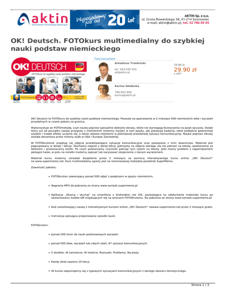 OK! Deutsch. FOTOkurs multimedialny do szybkiej nauki podstaw niemieckiego Twój konsultant Arkadiusz Trzebiński tel. 503 030 555 [email protected] NOWOŚĆ W OFERCIE 29.90 zł 29.90 zł z VAT Karina Gładecka 796 603 606 [email protected] OK! Deutsch to FOTOkurs do szybkiej nauki podstaw niemieckiego. Pozwala na opanowanie w 2 miesiące 500 niemieckich słów i wyrażeń przydatnych w czasie pobytu za granicą. Wykorzystuje on FOTOmetodę, czyli naukę poprzez specjalnie dobrane obrazy, które nie wymagają tłumaczenia na język ojczysty. Dzięki temu już od początku swojej przygody z niemieckim możemy myśleć w tym języku. Jak pokazują badania, takie podejście gwarantuje szybkie i trwałe efekty uczenia się, a także ułatwia mówienie w późniejszej prawdziwej sytuacji komunikacyjnej. Nauka poprzez obrazy została doceniona przez miliony osób w USA i Europie Zachodniej. W FOTObrulionie znajdują się zdjęcia przedstawiające sytuacje komunikacyjne oraz powiązane z nimi słownictwo. Materiał jest pogrupowany w działy i lekcje. Słuchamy nagrań z danej lekcji, patrzymy na zdjęcia starając się nie patrzeć na teksty, powtarzamy za lektorem i przewracamy kartki. Po czym powtarzamy czynność patrząc tym razem na teksty. Jeśli mamy problem z zapamiętaniem jakiegoś hasła, w polu na notatki możemy zapisać lub narysować skojarzenie z danym wyrażeniem. Materiał kursu możemy utrwalać bezpłatnie przez 2 miesiące za pomocą interaktywnego kursu na www.supermemo.net. Kurs multimedialny oparty jest na renomowanej metodzie powtórek SuperMemo. online „OK! Deutsch” Zawartość pakietu: FOTObrulion zawierający ponad 500 zdjęć z podpisami w języku niemieckim. Nagrania MP3 do pobrania ze strony www.seriaok.supermemo.pl Aplikacja „Skanuj i słuchaj” na smartfona z Androidem lub iOS, pozwalająca na odsłuchanie materiału kursu po zeskanowaniu kodów QR znajdujących się na stronach FOTObrulionu. Do pobrania ze strony www.seriaok.supermemo.pl Kod umożliwiający naukę z interaktywnym kursem online „OK! Deutsch” nawww.supermemo.net przez 2 miesiące gratis. Instrukcja opisująca proponowany sposób nauki. FOTObrulion: ponad 200 stron do nauki podstawowych wyrażeń. ponad 500 słów, wyrażeń lub całych zdań, 67 sytuacji komunikacyjnych. 5 działów: W samolocie, W mieście, Rozrywki, Problemy, Na plaży Każdy dział zawiera 10 lekcji. W kursie zapoznajemy się z typowymi sytuacjami komunikacyjnymi z danego obszaru tematycznego. Strona 1 / 3 W dziale I „W samolocie” przechodzimy przez odprawę na lotnisku, w samolocie wysłuchujemy komunikatu stewardessy i pilota, zamawiamy przekąskę, poznajemy współpasażera, zgłaszamy zaginięcie walizki, itd. W dziale II „W mieście” pytamy o drogę do hotelu, jedziemy autobusem i taksówką, rezerwujemy pokój, idziemy do restauracji, itd. W dziale III „Rozrywki” mówimy o swoich zainteresowaniach, proponujemy znajomemu/znajomej wspólne wyjście, idziemy do muzeum, jedziemy na wyprawę rowerową, robimy piknik, itd. W dziale IV „Problemy” kupujemy lekarstwa, płacimy mandat, jedziemy na stację benzynową i do warsztatu, zgłaszamy kradzież, itd. W dziale V „Na plaży” pakujemy się, idziemy na plażę, nurkujemy, jedziemy na wycieczkę na pustynię, itd. Słownictwo obejmuje podstawowe wyrażenia obejmujące takie tematy jak: przedmioty codziennego użytku, jedzenie i napoje, narodowości, zawody, rodzina, miejsca, środki transportu, ubrania, kosmetyki, liczby, kolory, pieniądze, wyposażenie pokoju hotelowego, sporty, dni tygodnia, części ciała, choroby i samopoczucie, opis osoby, pogoda. Na każdej stronie FOTObrulionu znajduje się ikonka symbolizująca dany dział, informacja o numerze lekcji, 2 lub 3 zdjęcia z podpisami, kod QR do zeskanowania i wysłuchania nagrania oraz miejsce na notatki. Nagrania MP3: Pozwalają osłuchać się z uczonym materiałem oraz prezentują poprawną wymowę. Strona 2 / 3 Zostały wykonane przez profesjonalnych lektorów niemieckich. Aplikacja „Skanuj i słuchaj” (na smarfony z iOS lub Androidem) Umożliwia odsłuchanie nagrań z FOTObrulionu po zeskanowaniu kodu QR znajdującego się na danej stronie lub w spisie treści. Szczegóły i darmowa aplikacja są do pobrania na stroniewww.seriaok.supermemo.pl Kurs online Pakiet zawiera kod umożliwiający bezpłatną naukę przez 2 miesiące z kursem online „OK! Deutsch” dostępnym na portalu e-learningowym www.supermemo.net Kurs online zawiera sam materiał z FOTObrulionu, wzbogacony o ćwiczenia podsumowujące. Wykorzystana w kursie metoda inteligentnych powtórek SuperMemo sprawia, że powtarzamy w pierwszej kolejności materiał, którego nie opanowaliśmy, co dodatkowo wzmacnia proces zapamiętywania. Wymagania sprzętowe: Dla aplikacji „Skanuj i słuchaj” – iPhone/iPod z kamerą (iOS4 lub nowszy) lub smartfon z Androidem w wersji 2.1 – 4.0 posiadający kamerę z opcją autofokus. Dla nagrań MP3 – dowolny odtwarzacz MP3. Strona 3 / 3 Powered by TCPDF (www.tcpdf.org)