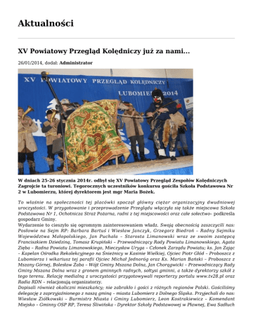 Aktualności XV Powiatowy Przegląd Kolędniczy już za nami... 26/01/2014, dodał: Administrator W dniach 25-26 stycznia 2014r. odbył się XV Powiatowy Przegląd Zespołów Kolędniczych Zagrojcie ta turoniowi. Tegorocznych uczestników konkursu gościła Szkoła Podstawowa Nr 2 w Lubomierzu, której dyrektorem jest mgr Maria Bożek. To właśnie na społeczności tej placówki spoczął główny ciężar organizacyjny dwudniowej uroczystości. W przygotowanie i przeprowadzenie Przeglądu włączyła się także miejscowa Szkoła Podstawowa Nr 1, Ochotnicza Straż Pożarna, radni z tej miejscowości oraz całe sołectwo– podkreśla gospodarz Gminy. Wydarzenie to cieszyło się ogromnym zainteresowaniem władz. Swoją obecnością zaszczycili nas: Posłowie na Sejm RP: Barbara Bartuś i Wiesław Janczyk, Grzegorz Biedroń – Radny Sejmiku Województwa Małopolskiego, Jan Puchała – Starosta Limanowski wraz ze swoim zastępcą Franciszkiem Dziedziną, Tomasz Krupiński – Przewodniczący Rady Powiatu Limanowskiego, Agata Zięba – Radna Powiatu Limanowskiego, Mieczysław Uryga – Członek Zarządu Powiatu; ks. Jan Zając – Kapelan Ośrodka Rekolekcyjnego na Śnieżnicy w Kasinie Wielkiej, Ojciec Piotr Głód – Proboszcz z Lubomierza i wikariusz tej parafii Ojciec Michał Jednoróg oraz Ks. Marian Bański – Proboszcz z Mszany Górnej, Bolesław Żaba – Wójt Gminy Mszana Dolna, Jan Chorągwicki – Przewodniczący Rady Gminy Mszana Dolna wraz z gronem gminnych radnych, sołtysi gminni, a także dyrektorzy szkół z tego terenu. Relację medialną z uroczystości przygotowywali reporterzy portalu www.tv28.pl oraz Radia RDN – relacjonują organizatorzy. Dopisali również okoliczni mieszkańcy; nie zabrakło i gości z różnych regionów Polski. Gościliśmy delegację z zaprzyjaźnionego z naszą gminą – miasta Lubomierz z Dolnego Śląska. Przyjechali do nas: Wiesław Ziółkowski – Burmistrz Miasta i Gminy Lubomierz, Leon Kostrakiewicz – Komendant Miejsko – Gminny OSP RP, Teresa Śliwińska - Dyrektor Szkoły Podstawowej w Pławnej, Ewa Sadłuch – Radna Gminy i Miasta Lubomierz, Andrzej Górski – Wicedyrektor Szkoły Podstawowej w Lubomierzu i Edward Korecki – Kierownik Internatu Zespołu Szkół w Lubomierzu. Przez dwa konkursowe dni mogliśmy podziwiać występy 28 grup, które w piękny sposób podtrzymują kulturę i tradycję naszego regionu. To dzięki nim młode pokolenia chociaż przez chwilę mogły obcować z dawnymi, często zapomnianymi już, obyczajami. Przegląd bowiem to nie tylko kolędy, ale także stroje, gwara, przedmioty codziennego użytku i świadomość różnorodności tradycji kolędniczych w tym samym regionie. Najliczniejszą widownię zgromadził występ rodzimej grupy kolędniczej „Żywa szopka”, która swoim pełnym humoru występem doprowadzała do łez rozbawionych widzów. Szczególnym punktem dwudniowej uroczystości był moment, w którym Starosta Jan Puchała, w imieniu zaprzyjaźnionego z Powiatem Limanowskim Powiatu Kłodzkiego, wręczył Bolesławowi Żabie, Wójtowi Gminy Mszana Dolna, odznakę i tytuł „Honorowego Parlamentarzysty” nadany mu przez Hrabstwo Kłodzkie. W czasie oczekiwania na werdykt jury z programem artystycznym wystąpili: Zespół Regionalny „Lubomirskie Echo” ze Szkoły Podstawowej Nr 1 w Lubomierzu, rodzina Pajdzików z koncertem kolęd i pastorałek oraz Chór Parafialny z Lubomierza. Komisja w składzie: 1. mgr Aleksandra Bogucka – etnomuzykolog; 2. mgr Benedykt Kafel - etnograf; 3. dr hab. Stanisław Węglarz - etnolog po długich obradach przyznała następujące nagrody i wyróżnienia: A. w kategorii dziecięcej (od 7 do lat 13) - trzy równorzędne I miejsca i nagrody pieniężne w wysokości po 300 zł otrzymały grupy kolędnicze: „Z szopką” z Jaworznej, „Z gwiazdą” z Raby Niżnej, „ Z gwiazdą” ze Szczyrzyca; - trzy równorzędne II miejsca i nagrody pieniężne w wysokości po 200 zł, otrzymały grupy kolędnicze „Z szopką” z Męciny, „Z gwiazdą” z Siekierczyny, „Z gwiazdą” z Krasnych – Lasocic; - trzy równorzędne III miejsca i nagrody pieniężne w wysokości po 100 zł otrzymały grupy kolędnicze „Z gwiazdą” z Olszówki, „Z żywą szopką” z Lubomierza, „Z gwiazdą” z Zalesia. B. w kategorii młodzieżowej (od 14 do lat 17) - dwa I miejsca przyznano grupom kolędniczym: „Z gwiazdą” z Kasiny Wielkiej” i „Pasterze” z Sadku – Kostrzy. Grupa z Kasiny Wielkiej otrzymała nagrodę pieniężną w wysokości 300 zł, grupa z Sadku – Kostrzy otrzymała nagrodę ufundowaną przez ks. Jana Zająca, w postaci jednodniowego pobytu w Ośrodku na Śnieżnicy; - trzy równorzędne II miejsca i nagrody pieniężne w wysokości po 200 zł otrzymały grupy kolędnicze „Z żywą szopką” z Kamienicy, „Z turoniem” z Pasierbca, „Z szopką lalkową” z Ujanowic; - dwa równorzędne III miejsca wraz z nagrodami pieniężnymi w wysokości po 100 zł otrzymały grupy kolędnicze „Herody” z Męciny, „Z gwiazdą” z Kamienicy. Ponadto na Ogólnopolski Przegląd Grup Kolędniczych „Pastuszkowe kolędowanie” w Podegrodziu komisja zakwalifikowała laureatów I miejsc w kategorii dziecięcej i młodzieżowej, tj. pięć grup kolędniczych: „Z szopką” z Jaworznej, „Z gwiazdą” z Raby Niżnej, „Z gwiazdą” ze Szczyrzyca, „Z gwiazdą” z Kasiny Wielkiej, „Pasterze” z Sadku – Kostrzy. C. w kategorii dorosłych: - dwa równorzędne I miejsca i nagrody pieniężne w wysokości po 500 zł otrzymały grupy kolędnicze „Z gwiazdą” z Mszany Górnej i „Z gwiazdą i turoniem” z Kasiny Wielkiej. Pozaregulaminową nagrodę w postaci pucharu ufundowanego przez burmistrza Lubomierza (Dolny Śląsk) Wiesława Ziółkowskiego otrzymała grupa kolędnicza „Z gwiazdą i turoniem” z Kasiny Wielkiej; - dwa równorzędne II miejsca i nagrody pieniężne po 400 zł otrzymały grupy kolędnicze: „Z gwiaz
