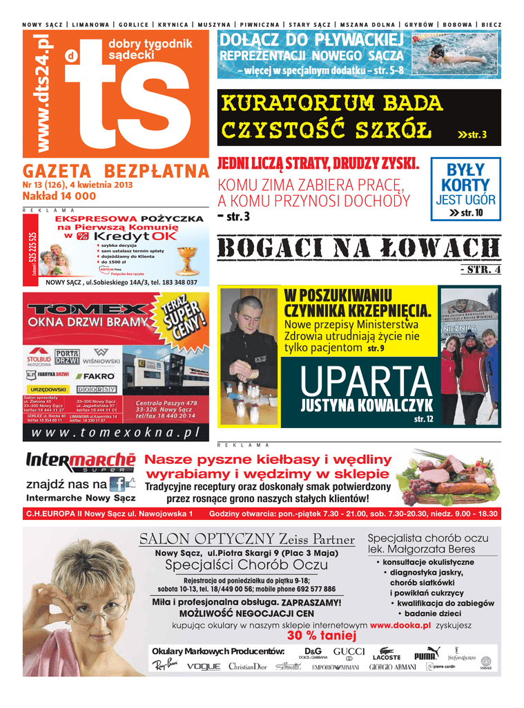 NOWY SĄCZ | LIMANOWA | GORLICE | KRYNICA | MUSZYNA | PIWNICZNA | STARY SĄCZ | MSZANA DOLNA | GRYBÓW | BOBOWA | BIECZ www.dts24.pl DOŁĄCZ DO PŁYWACKIEJ REPREZENTACJI NOWEGO SĄCZA – więcej w specjalnym dodatku – str. 5-8 KURATORIUM BADA CZYSTOŚĆ SZKÓŁ GAZETA BEZPŁATNA JEDNI LICZĄ STRATY, DRUDZY ZYSKI. KOMU ZIMA ZABIERA PRACĘ, A KOMU PRZYNOSI DOCHODY Nr 13 (126), 4 kwietnia 2013 Nakład 14 000 E K L A M A EKSPRESOWA PO¯YCZKA na Pierwsz¹ Komuniê BYŁY KORTY JEST UGÓR L str. 10 - str. 3 w 3 szybka decyzja sam ustalasz termin sp³aty 3 3 doje¿d¿amy do Klienta do 1500 z³ 3 Zadzwoñ! 525 225 525 R Lstr. 3 Po¿yczka bez ryzyka NOWY S¥CZ , ul.Sobieskiego 14A/3, tel. 183 83 348 037 W POSZUKIWANIU CZYNNIKA KRZEPNIĘCIA. Nowe przepisy Ministerstwa Zdrowia utrudniają życie nie tylko pacjentom str. 9 Salon sprzedaży ul. Zielona 45 33–300 Nowy Sącz tel/fax 18 444 11 27 GORLICE ul. Biecka 40 tel/fax 18 354 69 11 UPARTA JUSTYNA KOWALCZYK 33–300 Nowy Sącz ul. Jagiellońska 57 tel/fax 18 444 11 01 LIMANOWA ul.Kopernika 14 tel/fax 18 330 11 67. str. 12 R znajdź nas na E K L A M A Nasze pyszne kiełbasy i wędliny wyrabiamy i wędzimy w sklepie Tradycyjne receptury oraz doskonały smak potwierdzony Intermarche Nowy Sącz przez rosnące grono naszych stałych klientów! C.H.EUROPA II Nowy Sącz ul. Nawojowska 1 Godziny otwarcia: pon.-piątek 7.30 - 21.00, sob. 7.30-20.30, niedz. 9.00 - 18.30 Okulary Markowych Producentów: Z DRUGIEJ STRONY 2 NOWY SĄCZ CZWARTEK DOBRY TYGODNIK SĄDECKI 4 kwietnia 2013 PIĄTEK SOBOTA NIEDZIELA PONIEDZIAŁEK WTOREK ŚRODA DZIEŃ 0 6 2 2 3 4 6 NOC 0 0 -1 -3 -3 -4 -1 Żródło: pogodynka.pl, IMiGW TYGODNIÓWKA MARKA STAWOWCZYKA Z L I S TÓW D O R E DA KC J I Co nie jest absurdem? Tekst, który ukazał się w nr 10 DTS pt. „Śmieci pod specjalnym nadzorem” uważam za kuriozalny, nierzetelny, nieprawdziwy i absurdalny sam w sobie. Społeczność Sądeckiej Spółdzielni Mieszkaniowej w Nowym Sączu (SSM), którą reprezentuję jako wiceprzewodniczący Rady Nadzorczej (SSM), odebrała go jako niezrozumiały i atak na dobra wspólne SSM. Śmietnik znajduje się na terenie SSM i należy do jej członków. Każdy z członków i mieszkańców posiada klucz do wejścia, gdzie są gromadzone odpady przed ich wywiezieniem – co nie jest absurdem. Teren SSM jest ogrodzony i monitorowany – co nie jest absurdem. Zabudowa NA AFISZU W W W. K L I K N I J . T U X PTT o/Beskid oraz Sądecki Uniwersytet Trzeciego Wieku zaprasza na wycieczkę szlakiem nr 3 Nawojowa–Majdan. Zbiórka 7 kwietnia, g.9, przystanek MPK ul. Konarskiego w Nowym Sączu. Zapisy w sekretariacie SUTW oraz pod nr tel. 18 44 11 295 lub 519 862 447. X Fundacja Małopolskie Serce zaprasza 5 kwietnia do Szkoły Podstawowej nr 2 w Krynicy–Zdroju na charytatywną imprezę Zumba Party II. Początek g.18, wstęp 10 zł. Całość dochodu przeznaczona jest na rehabilitację podopiecznych fundacji. X MCK Sokół w Nowym Sączu, 5–14 kwietnia XVII Międzynarodowy Festiwal i Konkurs Sztuki Wokalnej im. Ady Sari. Szczegóły na www.mcksokol.pl X CKiS Sokół w Starym Sączu, 5-7 kwietnia, Festiwal Podróży i Przygody Bonawentura.org – kto jeszcze nie kupił biletów, może spróbować je nabyć w kasie kina Sokół przed pokazami. Szczegółowy program na www.bonawentura.org R E K L A M ta powstała po to, by nikt obcy (z zewnątrz) nie wrzucał tam śmieci, gdyż to mieszkańcy tego bloku ponoszą koszt ich wywozu – co nie jest absurdem. Tak więc „śmietnik” ten należy tylko do mieszkańców tego bloku i tylko oni mogą z niego korzystać – bo ponoszą solidarnie koszty wywozu śmieci. Nie jest to śmietnik miejski, gminny czy w jakikolwiek sposób „publiczny”. Jeśli redakcja uważa to nadal za „absurd” to proponuję przejść się po innych osiedlach, praktycznie nie ma w mieście już miejsc na terenach spółdzielni, gdzie śmieci nie są zamykane po to, by nikt obcy nie podrzucał do pojemników śmieci tym, co płacą za ich wywóz. Tak samo wygląda zabezpieczanie śmieci na prywatnych posesjach domów jednorodzinnych. Z poważaniem, Krzysztof Kulig WA R TO W I E D Z I E Ć Droga na Harvard Bon na warsztaty Studia na Harvardzie? To możliwe. 22 kwietnia mija termin zgłoszeń do konkursu „Droga na Harvard”, adresowanego do uczniów gimnazjów i szkół średnich, studentów uczelni państwowych i prywatnych oraz absolwentów szkół, którzy chcieliby studiować na uczelniach amerykańskich. „Poszukiwani są zdolni i nieprzeciętni ludzie pasjonujący się nauką, sportem, kulturą oraz angażujący się w przedsięwzięcia studenckie i sprawy społeczne. Jest to jednocześnie jedno z kryteriów podczas rekrutacji na Uniwersytet Harvarda” – piszą organizatorzy na www.droganaharvard.pl. Więcej informacji na temat konkursu będzie można zdobyć również podczas dzisiejszego spotkania (4 kwietnia) o godz. 13 w WSB–NLU w Nowym Sączu, (aula 10, budynek C). Wszystkiego o pogórzańskiej kuchni i tradycjach kulinarnych dowiedzieć się będzie można na warsztatach „Co kryje spyrnik i komora?”. Dlaczego pogórzańskie kobiety nosiły od trzech do dziesięciu spódnic, co to są „kurpiele” stanie się jasne po spotkaniu ph. „Pogórzańska moda”, a warsztaty „Tajemnice starych zabaw i zabawek” przybliżą, czym bawili się nasi dziadkowie. W ramach „Bonu Kultury”, organizowanego przez Muzeum Dwory Karwacjanów i Gładyszów w Gorlicach, przewidziano także zajęcia dla seniorów „Magia ziół”, podczas których poznają m.in. lecznicze właściwości ziół. Z warsztatów „Bonu Kultury” mogą korzystać zorganizowane grupy, jak i osoby indywidualne. Szczegóły na temat cen i możliwości rezerwacji „Bonu Kultury” upoważniającego do skorzystania z 75–procentowej ulgi, uzyskać można telefonicznie pod numerami: 18 351 31 14, 18 353 43 63, 601 411 590 lub emailowo pod adresem: [email protected] lub [email protected] (ES) A 