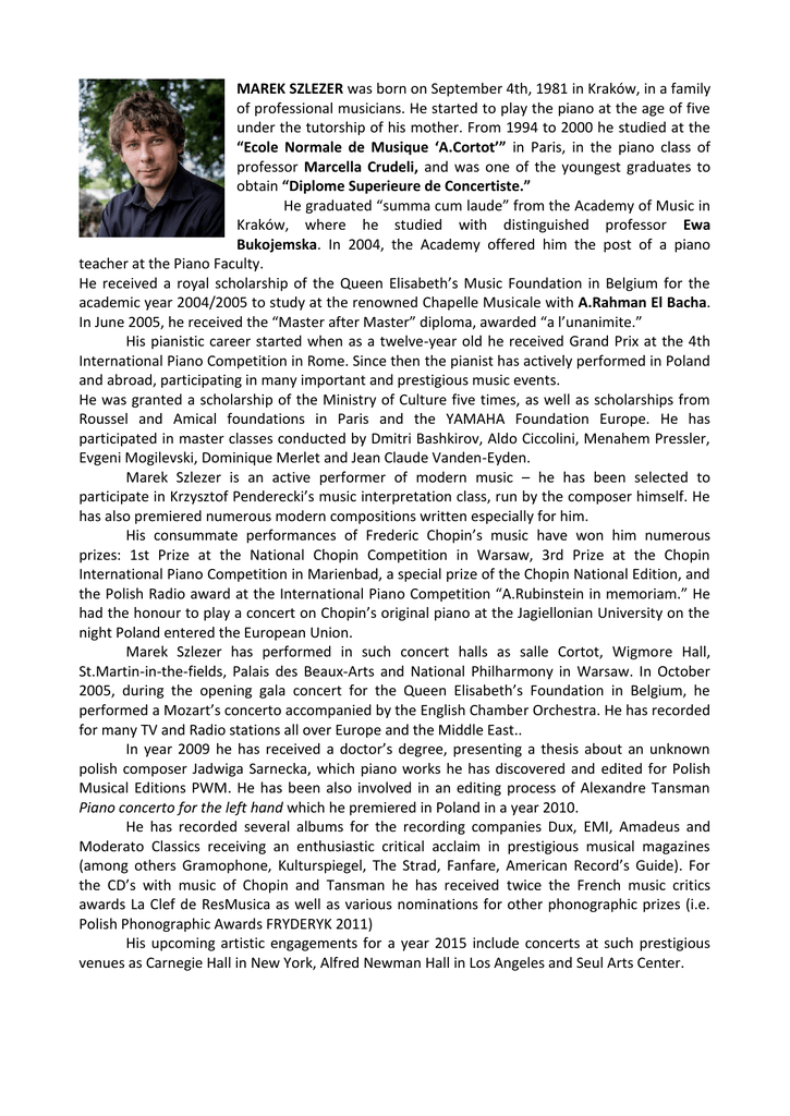 MAREK SZLEZER was born on September 4th, 1981 in Kraków, in a family of professional musicians. He started to play the piano at the age of five under the tutorship of his mother. From 1994 to 2000 he studied at the “Ecole Normale de Musique ‘A.Cortot’” in Paris, in the piano class of professor Marcella Crudeli, and was one of the youngest graduates to obtain “Diplome Superieure de Concertiste.” He graduated “summa cum laude” from the Academy of Music in Kraków, where he studied with distinguished professor Ewa Bukojemska. In 2004, the Academy offered him the post of a piano teacher at the Piano Faculty. He received a royal scholarship of the Queen Elisabeth’s Music Foundation in Belgium for the academic year 2004/2005 to study at the renowned Chapelle Musicale with A.Rahman El Bacha. In June 2005, he received the “Master after Master” diploma, awarded “a l’unanimite.” His pianistic career started when as a twelve-year old he received Grand Prix at the 4th International Piano Competition in Rome. Since then the pianist has actively performed in Poland and abroad, participating in many important and prestigious music events. He was granted a scholarship of the Ministry of Culture five times, as well as scholarships from Roussel and Amical foundations in Paris and the YAMAHA Foundation Europe. He has participated in master classes conducted by Dmitri Bashkirov, Aldo Ciccolini, Menahem Pressler, Evgeni Mogilevski, Dominique Merlet and Jean Claude Vanden-Eyden. Marek Szlezer is an active performer of modern music – he has been selected to participate in Krzysztof Penderecki’s music interpretation class, run by the composer himself. He has also premiered numerous modern compositions written especially for him. His consummate performances of Frederic Chopin’s music have won him numerous prizes: 1st Prize at the National Chopin Competition in Warsaw, 3rd Prize at the Chopin International Piano Competition in Marienbad, a special prize of the Chopin National Edition, and the Polish Radio award at the International Piano Competition “A.Rubinstein in memoriam.” He had the honour to play a concert on Chopin’s original piano at the Jagiellonian University on the night Poland entered the European Union. Marek Szlezer has performed in such concert halls as salle Cortot, Wigmore Hall, St.Martin-in-the-fields, Palais des Beaux-Arts and National Philharmony in Warsaw. In October 2005, during the opening gala concert for the Queen Elisabeth’s Foundation in Belgium, he performed a Mozart’s concerto accompanied by the English Chamber Orchestra. He has recorded for many TV and Radio stations all over Europe and the Middle East.. In year 2009 he has received a doctor’s degree, presenting a thesis about an unknown polish composer Jadwiga Sarnecka, which piano works he has discovered and edited for Polish Musical Editions PWM. He has been also involved in an editing process of Alexandre Tansman Piano concerto for the left hand which he premiered in Poland in a year 2010. He has recorded several albums for the recording companies Dux, EMI, Amadeus and Moderato Classics receiving an enthusiastic critical acclaim in prestigious musical magazines (among others Gramophone, Kulturspiegel, The Strad, Fanfare, American Record’s Guide). For the CD’s with music of Chopin and Tansman he has received twice the French music critics awards La Clef de ResMusica as well as various nominations for other phonographic prizes (i.e. Polish Phonographic Awards FRYDERYK 2011) His upcoming artistic engagements for a year 2015 include concerts at such prestigious venues as Carnegie Hall in New York, Alfred Newman Hall in Los Angeles and Seul Arts Center. MAREK SZLEZER urodził się w 1981 roku w Krakowie, naukę gry na fortepianie rozpoczął w wieku lat pięciu. Następnie kontynuował ją w szkołach muzycznych I i II stopnia m.in. u Krystyny Adamskiej, Jerzego Łukowicza i Stefana Wojtasa. W latach 1994-2000 pobierał naukę w „Ecole Normale de Musique de Paris „A.Cortot”” we Francji w klasie fortepianu prof. Marcelli Crudeli zakończoną otrzymaniem „Diplome Superieure de Concertiste”. W roku 2004 ukończył studia w Akademii Muzycznej w Krakowie w klasie prof. E. Bukojemskiej uzyskując dyplom z odznaczeniem. W tym samym roku otrzymał stypendium królewskie na studia podyplomowe w Chapelle Musicale Reine Elizabeth w Brukseli w klasie A. Rahmana El-Bachy, które ukończył czerwcu 2005 roku z wyróżnieniem otrzymując tytuł „Master after Master”. W roku 2010 otrzymał tytuł doktora. Obecnie prowadzi własną klasę fortepianu na Akademii Muzycznej w Krakowie. Jego karierę pianistyczną zainicjowało zdobycie w wieku lat 12 grand prix na IV Międzynarodowym Konkursie Pianistycznym w Rzymie w 1993. Od tego czasu artysta prowadzi aktywne życie koncertowe w kraju i zagranica, uczestnicząc w wielu międzynarodowych konkursach i festiwalach pianistycznych. Był wielokrotnym stypendystą Ministerstwa Kultury, fundacji „A.Roussel” i "Amical" we Francji, “Fundacji Promocji Talentu” oraz Fundacji YAMAHA. Uczestniczył w kursach mistrzowskich m.in.: D. Bashkirova, A.Ciccoliniego, E.Mogilevskiego, V.Banfielda, M.Presslera, D.Merlet, J.Vanden-Eydena i H.Czerny-Stefańskiej. Występował pod batutą dyrygentów takich jak: Ł.Borowicz, T.Bugaj, W.Czepiel, J. M. Florencio, M.Nałęcz-Niesiołowski, M.Pijarowski, Z.Rychert, T.Wojciechowski. Ceniony za swoje interpretacje dzieł Fryderyka Chopina otrzymał m.in I miejsce w konkursie stypendialnym Towarzystwa im. F. Chopina w Warszawie, III na Międzynarodowym Konkursie chopinowskim w Mariańskich Łaźniach, nagrodę specjalną Wydania Narodowego Dzieł Wszystkich Fryderyka Chopina a także wiele innych nagród na renomowanych międzynarodowych konkursach pianistycznych. Jego recital otwierał 56. festiwal chopinowski w Dusznikach Zdroju. Miał także zaszczyt wykonywać recital na oryginalnym fortepianie Chopina w mu