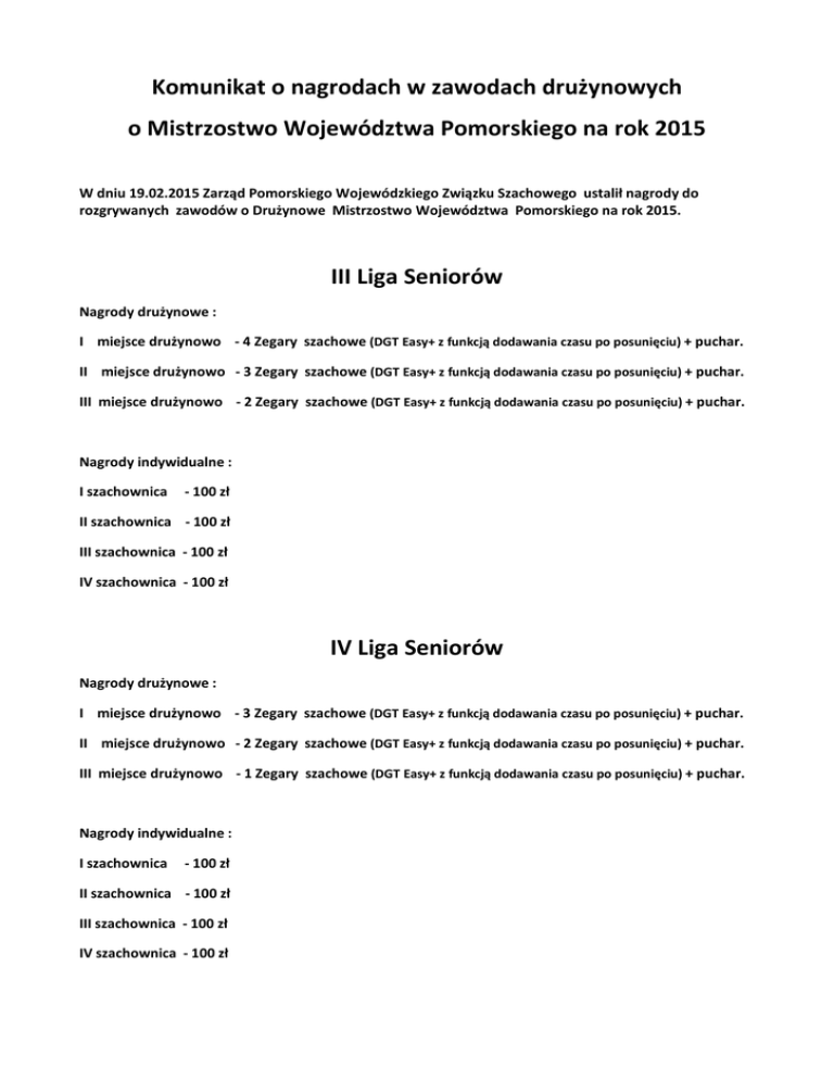 Komunikat o nagrodach w zawodach drużynowych o Mistrzostwo Województwa Pomorskiego na rok 2015 W dniu 19.02.2015 Zarząd Pomorskiego Wojewódzkiego Związku Szachowego ustalił nagrody do rozgrywanych zawodów o Drużynowe Mistrzostwo Województwa Pomorskiego na rok 2015. III Liga Seniorów Nagrody drużynowe : I miejsce drużynowo - 4 Zegary szachowe (DGT Easy+ z funkcją dodawania czasu po posunięciu) + puchar. II miejsce drużynowo - 3 Zegary szachowe (DGT Easy+ z funkcją dodawania czasu po posunięciu) + puchar. III miejsce drużynowo - 2 Zegary szachowe (DGT Easy+ z funkcją dodawania czasu po posunięciu) + puchar. Nagrody indywidualne : I szachownica - 100 zł II szachownica - 100 zł III szachownica - 100 zł IV szachownica - 100 zł IV Liga Seniorów Nagrody drużynowe : I miejsce drużynowo - 3 Zegary szachowe (DGT Easy+ z funkcją dodawania czasu po posunięciu) + puchar. II miejsce drużynowo - 2 Zegary szachowe (DGT Easy+ z funkcją dodawania czasu po posunięciu) + puchar. III miejsce drużynowo - 1 Zegary szachowe (DGT Easy+ z funkcją dodawania czasu po posunięciu) + puchar. Nagrody indywidualne : I szachownica - 100 zł II szachownica - 100 zł III szachownica - 100 zł IV szachownica - 100 zł Liga Juniorów Nagrody drużynowe : I miejsce drużynowo - 4 Zegary szachowe (DGT Easy+ z funkcją dodawania czasu po posunięciu) + puchar. II miejsce drużynowo - 3 Zegary szachowe (DGT Easy+ z funkcją dodawania czasu po posunięciu) + puchar. III miejsce drużynowo - 2 Zegary szachowe (DGT Easy+ z funkcją dodawania czasu po posunięciu) + puchar. Nagrody indywidualne : I szachownica - 100 zł II szachownica - 100 zł III szachownica - 100 zł IV szachownica - 100 zł