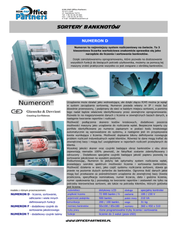 SORTERY BANKNOTÓW NUMERON D Numeron to najmniejszy system rozliczeniowy na świecie. Ta 3 kieszeniowa liczarka wartościowa znakomicie sprawdza się jako narzędzie do liczenia i sortowania banknotów. Dzięki zainstalowanemu oprogramowaniu, które pozwala na dostosowanie wszystkich funkcji do bieżących potrzeb użytkownika, możemy za pomocą tej maszyny zrobić praktycznie wszystko co jest związane z obróbką banknotów. modele z różnym przeznaczeniem: Urządzenie może działać jako wolnostojące, ale dzięki złączu RJ45 można je wpiąć w system zarządzania sortownią. Numeron posiada własny nr IP i może być dowolnie przenoszony, i podpinany do sieci w każdym miejscu sortowni, a pomimo tego nadal będzie właściwie identyfikowany przez zewnętrzne oprogramowanie. Pozwala to na magazynowanie danych z liczenia w zewnętrznych bazach danych, a następnie tworzenie raportów i rozliczeń. Możliwość podłączenia skanera kodów kreskowych, dodatkowo poszerza możliwości maszyny jako urządzenia do rozliczania wpłat. Bezpieczne koperty czy portfele identyfikowane po numerze zapisanym w postaci kodu kreskowego automatycznie są wprowadzane do systemu, a następnie jest im przypisywana kwota wynikająca z liczenia. Możliwość dopisania bilonu definitywnie rozwiązuje problem rozliczeń indywidualnych wpłat klientów. Również te dane mogą trafiać do zewnętrznej bazy i mogą być uwzględniane w raportach rozliczeń przesyłanych do klienta. Wysokiej jakości skaner oraz czujniki badające obraz banknotów z obu stron zapewniają niemalże 100% pewność, że falsyfikat zostanie zidentyfikowany i odrzucony . Dodatkowo specjalne czujniki badające jakość papieru pozwolą na sortowanie jakościowe na wysokim poziomie. Podsumowując, Numeron to jedyny tak optymalny system rozliczania wpłat, posiadający szerokie spektrum możliwości liczenia i sortowania banknotów. Możliwość działania w sieci, jako część systemu rozliczania sortowni, stawia go prawie na poziomie dużych sorterów do banknotów. Ogromna ilość danych jakie mogą być przekazane za pośrednictwem urządzenia do zewnętrznej bazy (kwota przeliczona, specyfikacja nominałowa, numer liczarza, data i godzina liczenia, numer opakowania itp.) pozwalają na tworzenie raportów i zestawień nie tylko na potrzeby kierownictwa sortowni, ale także na potrzeby klientów, których gotówka jest liczona. wyświetlacz dotykowy LCD obsługa specjalny kontroler NUMERON D - liczenie, sortowanie, prędkość liczenia 72 000 bankn / h zasilanie 100 / 230 V pojemność podajnika 500 bankn. pobór mocy 210 VA 200 / 100 bankn. waga 31 kg rozmiary banknotów 50x100 / 85x180 wymiary 360 x 450 x 510 tryby pracy rózne programowalne tryby liczenia i sortowania funkcje liczenie do 3 walut (poza USD) odliczanie i wiele innych definiowanych funkcji NUMERON F - dodatkowy czujnik do sortowania jakościowego NUMERON T - dodatkowy czujnik taśmy komunikacja www.officepartners.pl SORTERY BANKNOTÓW BPS seria 200 BPS200, to seria urządzeń, które poprzez zmianę konfiguracji oraz ilości modułów mogą zapewnić możliwość nieprzerwanej pracy przy sortowaniu i liczeniu banknotów. Podstawowy model wyposażony jest w cztery kieszenie odbiorcze, podajnik oraz kieszeń na odrzuty. Można go rozbudować o kolejne moduły cztero lub trzy kieszeniowe, aż do uzyskania modelu z 20 kieszeniami odbiorczymi. dostępne konfiguracje modułów: -moduły 3 kasetowe: np. 7, 11, 15, 19 -moduły 4 kasetowe: np. 4, 8, 12, 16, 20 funkcje specjalne: -sortowanie wg nominałów -sortowanie wg orientacji -sortowanie wg jakości -sortowanie wg ATM lub TCD -rozliczanie wpłat z użyciem separatorów Każda z kieszeni może być dowolnie skonfigurowana, dzięki czemu ilość odrzutów jest minimalizowana niemalże do zera. Dzieląc banknoty na poszczególne nominały, a następnie sortując je względem orientacji oraz ułożenia awers rewers, stopniowo zapełniamy wszystkie kieszenie, a maszyna może pracować bez przerwy. Oczywiście sortowanie jakościowe poszczególnych nominałów, również jest możliwe. Wystarczy tylko odpowiednio zadeklarować którąkolwiek z kieszeni dla tego typu banknotów. Jako opcja dostępne są też specjalne moduły mieszczące do 500 sztuk banknotów każdy. Dzięki ich wykorzystaniu możemy szybko przygotować gotówkę potrzebną do załadunku kaset bankomatowych lub dyspensera. BPS200 może także posłużyć jako maszyna do rozliczania wpłat klienta. Zastosowanie specjalnych kart separujących pozwoli na przygotowanie specjalnego wkładu, w skład którego wejdą banknoty pochodzące z różnych depozytów, ale oddzielone od siebie właśnie separatorami. Specjalna głowica rozpoznaje kod zapisany na separatorze i przyporządkowuje do niego przeliczoną wartość banknotów. Cała informacja trafia do systemu, gdzie sparowana z informacjami o numerach bezpiecznych kopert lub nazw klientów tworzy kompletny raport z rozliczenia wpłat. To urządzenie jest przeznaczone dla dużych sortowni gotówki, gdzie koszty liczenia każdego pakietu przekładają się na zysk firmy. Możliwość zredukowania obsady sortowni do kilku osób, szykujących wkład do maszyny oraz obsługi maszyny, nie tylko wpłynie znacząco na oszczędności, ale także poprawi wydajność i jakość wykonywanej pracy. Tego typu systemy są przygotowywane indywidualnie pod potrzeby każdego klienta, dzięki czemu otrzymuje on maszynę skrojoną na miarę. Wcześniejsze analizy strumienia, potencjału pracowniczego oraz aktualnych kosztów pozwalają nie tylko dobrać odpowiednie parametry urządzenia, ale także zaprojektować cały proces obróbki gotówki, począwszy od jej przyjazdu do sortowni, a na przekazaniu do Banku Centralnego skończywszy. wyświetlacz LCD pojemność odbiornika standardowa: 100 wys x głęb 61 x 52 cm prędkość liczenia 40 000 bankn / h rozmiary banknotów powiększona: 500 długość 126 - 212 cm pojemnoś