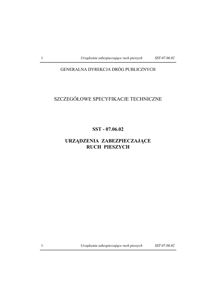 1 Urządzenia zabezpieczające ruch pieszych SST-07.06.02 GENERALNA DYREKCJA DRÓG PUBLICZNYCH SZCZEGÓŁOWE SPECYFIKACJE TECHNICZNE SST - 07.06.02 URZĄDZENIA ZABEZPIECZAJĄCE RUCH PIESZYCH 1 Urządzenia zabezpieczające ruch pieszych SST-07.06.02 SST-07.06.02 Urządzenia zabezpieczające ruch pieszych Warszawa 1998 2 SST-07.06.02 Urządzenia zabezpieczające ruch pieszych 3 Opracowanie wykonano na zlecenie Generalnej Dyrekcji Dróg Publicznych Zgodnie z decyzją Generalnego Dyrektora Dróg Publicznych niniejsza ogólna specyfikacja techniczna stanowi obowiązującą podstawę sporządzenia szczegółowej specyfikacji technicznej przy zlecaniu i realizacji robót na drogach krajowych i wojewódzkich oraz jest zalecona do wykorzystania przy zlecaniu robót na drogach miejskich i gminnych. Jednostka autorska, opracowanie edytorskie i rozpowszechnienie: Branżowy Zakład Doświadczalny Budownictwa Drogowego i Mostowego, Sp. z o.o. 03-802 Warszawa, ul. Skaryszewska 19, tel./fax (0-22) 818-58-29 Konsultacje: Wydział Budowy Generalnej Dyrekcji Dróg Publicznych w Warszawie Treść ogólnej specyfikacji technicznej jest aktualna na dzień 30 kwietnia 1998 r. Przy sporządzaniu szczegółowej specyfikacji technicznej należy ewentualnie uaktualnić przepisy zawarte w wykorzystywanej niniejszej ogólnej specyfikacji technicznej. SPIS TREŚCI 1. WSTĘP................................................................................................................................. 2. MATERIAŁY.................................................................................................................... 3. SPRZĘT.............................................................................................................................. 4. TRANSPORT.................................................................................................................... 5. WYKONANIE ROBÓT................................................................................................... 6. KONTROLA JAKOŚCI ROBÓT................................................................................... 7. OBMIAR ROBÓT............................................................................................................ 8. ODBIÓR ROBÓT............................................................................................................. 9. PODSTAWA PŁATNOŚCI.............................................................................................. 10. PRZEPISY ZWIĄZANE.................................................................................................. NAJWAŻNIEJSZE OZNACZENIA I SKRÓTY OST SST - ogólna specyfikacja techniczna - szczegółowa specyfikacja techniczna 4 Urządzenia zabezpieczające ruch pieszych SST-07.06.02 1. WSTĘP 1.1. Przedmiot SST Przedmiotem niniejszej szczegółowej specyfikacji technicznej (SST) są wymagania ogólne dotyczące wykonania i odbioru robót drogowych i mostowych na drogach administrowanych przez Zarząd Dróg Powiatowych w Słupsku. 1.2. Zakres stosowania SST Szczegółowa specyfikacja techniczna stosowana jest jako dokument przetargowy i kontraktowy przy zlecaniu i realizacji robót na drogach powiatowych. 1.3. Zakres robót objętych SST Ustalenia zawarte w niniejszej specyfikacji dotyczą zasad prowadzenia robót związanych z urządzeniami zabezpieczającymi ruch pieszych, do których należą: - ogrodzenia ochronne sztywne, jak: siatki wygradzające na linkach lub w ramach z kątowników, barierki rurowe, barierki z kształtowników w ramach, płotki szczeblinowe, płotki panelowe z tworzyw sztucznych lub szkła zbrojonego, - bariery łańcuchowe podwójne, - zapory z kwietników betonowych lub żelbetowych. Celem stosowania urządzeń zabezpieczających ruch pieszych jest ochrona życia i zdrowia uczestników ruchu drogowego, zarówno pieszych jak i kierowców oraz pasażerów pojazdów poprzez uniemożliwienie nagłego wtargnięcia na jezdnię (torowisko tramwajowe, tory kolejowe) w miejscach do tego nieprzeznaczonych. Urządzenia zabezpieczające ruch pieszych powinny być zlokalizowane w szczególności: - między jezdnią i chodnikiem położonym bezpośrednio przy jezdni, gdy prędkość projektowa na drodze wynosi Vp > 80 km/h, - na pasach dzielących w miejscach przewidywanego nieprzepisowego przekraczania jezdni, - w miejscach o niedostatecznej widoczności, gdzie spodziewane jest przekraczanie jezdni, - w rejonie wyjść ze szkół i terenów zabaw dzieci, - w sąsiedztwie bezkolizyjnych przejść dla pieszych, - na przystankach komunikacji zbiorowej usytuowanych między jezdniami o przeciwnych kierunkach jazdy (np. w torowisku tramwajowym lub w węzłach dróg ekspresowych) . 1.4. Określenia podstawowe 1.4.1. Ogrodzenia ochronne sztywne - przegrody fizyczne separujące ruch pieszy od ruchu kołowego wykonane z kształtowników stalowych, siatek na linkach naciągowych, ram z kształtowników wypełnionych siatką, szczeblinami lub panelami z tworzyw sztucznych lub szkła zbrojonego. 1.4.2. Bariery łańcuchowe - przegrody fizyczne oddzielające ruch pieszy od ruchu kołowego wykonane z rur i łańcuchów stalowych. 1.4.3. Zapory z kwietników betonowych - formy betonowe spełniające rolę donic kwiatowych o różnych kształtach lub elementów betonowych lub żelbetowych w formie słupów o kształtach przeważnie cylindrycznych o niewielkich wysokościach i znacznych średnicach połączonych ze sobą różnego rodzaju łańcuchami stalowymi o bardzo różnych asortymentach. 1.4.4. Kształtowniki - wyroby o stałym przekroju poprzecznym w kształcie złożonej figury geometrycznej, dostarczane w odcinkach prostych, stosowane w konstrukcjach stalowych lub w połączeniu z innymi materiałami budowlanymi. 1.4.5. Siatka metalowa - siatka wykonana z drutu o różnym sposobie jego splotu (płóciennym, skośnym), pleciona z płaskich i okrągłych spirali, zgrzewana, skręcana oraz kombinowana (harfowa, pętlowa, półp