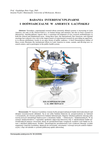 Prof. Guadalupe Ruiz-Vega, PhD Instytut Fizyki i Matematyki, University of Michoacan, Mexico BADANIA INTERDYSCYPLINARNE I DOŚWIADCZALNE W AMERYCE ŁACIŃSKIEJ Abstract: Nowadays, experimental research about extremely diluted systems is increasing in Latin America, not only in the clinical field (i.e. on human beings and animals), but also in basic research in laboratories. Interdisciplinary reports show a consistent development of new research methodologies in both the clinical and fundamental areas. Along these lines, the international, Pan American, and regional meetings have played a key role in the improvement of experimental research by providing an opportunity to discuss preliminary results in an open forum of public audience. A brief chronological outline of these events illustrates the institutional efforts in Latin America to create, sustain, and develop new research centers, and to participate in the public health system. XIX SYMPOZJUM GIRI 2. 12. 2005 MONACO Streszczenie: W Ameryce Łacińskiej wzrasta liczba przeprowadzanych badań doświadczalnych nad skrajnie rozcieńczonymi układami. Są to nie tylko badania kliniczne (tj. przeprowadzane na ludziach i zwierzętach), ale również podstawowe badania laboratoryjne. Raporty interdyscyplinarne ukazują stały rozwój nowych metodologii badawczych w dziedzinie badań – i klinicznych, i fundamentalnych. W tej sytuacji międzynarodowe i regionalne spotkania odgrywają kluczową rolę w udoskonaleniu badań doświadczalnych poprzez stworzenie okazji do przedyskutowania wstępnych wyników tych badań na forum z udziałem publiczności. Krótkie, chronologiczne przedstawienie tych wydarzeń obrazuje wysiłek organizacji Ameryki Łacińskiej, dążących do stworzenia, utrzymania i rozwoju nowych centrów badawczych, i chęć ich udziału w systemie publicznej opieki zdrowotnej. Homeopatia praktyczna Nr 39 (5/2006) BADANIA KLINICZNE Początki praktyki klinicznej w Ameryce Łacińskiej sięgają końca pierwszej połowy XIX wieku. Współcześnie rozwój właściwych metodologii badań klinicznych ujawnia się w dobrze przeprowadzonych badaniach dotyczących chorób ostrych i przewlekłych. a) Na ludziach. Takie podejście obejmuje różne obszary badań, m.in. : - systematyczne podejście do chorób ostrych oraz przewlekłych.1-10 - gromadzenie przypadków klinicznych, wykorzystywanych do oceny skuteczności działania ultraniskich dawek.11-28 b) Na zwierzętach : weterynaria. Wzorce badań z udziałem zwierząt są szeroko wykorzystywane w testach przedklinicznych dotyczących chorób ostrych i przewlekłych 29-43, jako podstawa do dalszych analiz. BADANIA PODSTAWOWE Przeszkodą na drodze do akceptacji homeopatii są przede wszystkim: brak naukowego opisu i brak teoretycznego modelu działania ultraniskich dawek. Pomimo to można wymienić różne teoretyczne i doświadczalne prace dotyczące tego tematu. a) Fizykalny opis układów skrajnie rozcieńczonych. Raporty dotyczące tego tematu odnoszą się do badań nad wewnętrzną naturą takich układów z punktu widzenia fizyki. 44-47 b) Mechanizm działania ultraniskich dawek. Zaproponowane zostały różne modele teoretyczne mające na celu stworzenie naukowych podstaw biologicznej aktywności ultraniskich dawek. 48-57 Poza doniesieniami naukowymi, regionalne i międzynarodowe spotkania, takie jak m.in. SINAPIH, Mexican National Congress i Pan American Congress, stworzyły dobre podstawy do wymiany myśli i informacji. Coroczne spotkania odbywają się dzięki wsparciu różnych instytucji, takich jak uniwersytety, stowarzyszenia i zakłady (laboratoria), stanowiących podporę przeprowadzanych badań.58-64 Według fizyków „czas” jest współrzędną, która Jak sugeruje tytuł, prezentowana praca stanowi próbę oceny bieżącej sytuacji prac badawczych uniemożliwia równoczesne zachodzenie zdarzeń, dlatego zawsze początek poprzedza koniec. w Ameryce Łacińskiej. Z historycznego punktu widzenia początek badań Ograniczenia czasowe nie pozwoliły mi na dokonanie wyczerpującej analizy tego tematu, za co w Ameryce Łacińskiej datuje się na koniec pierwszej połowy XIX wieku, kiedy to otwarto pierwsze prakz góry przepraszam. tyki kliniczne. Właściwie, dzięki kluczowej roli pierwszych lekarzy w zwalczaniu epidemii w MekBadania nad czym? Oczywiście nad skrajnie roz- syku, Brazylii i na Kubie, taka praktyka przypominacieńczonymi mieszaninami i ich charakterystyką, ła sytuację współczesną. obejmujące ich wewnętrzną naturę i działanie bioloArgentyna: w 1846 roku dr Guillermo Darrouzagiczne. To podkreślenie nie jest bez znaczenia, gdyż in, rodowity Francuz, założył pierwszą klinikę temat ten stanowi dość kontrowersyjną kwestię homeopatyczną w Buenos Aires, a w roku 1846 w głównym nurcie nauki, która ewoluowała w kierunku „grup” (możemy więc mówić o „grupie nauk w Montevideo. fizycznych”, „grupie nauk biomedycznych” itp.) Kuba: Homeopatia została po raz pierwszy sprowadzona na tę wyspę w 1842 r. Oczywistym jest, że środowisko naukowe korzyBrazylia: Benoit Jules Mure, francuski lekarz sta ze swoich własnych paradygmatów symbolicznie przybył do Brazylii w październiku 1840 r.; razem z uogólniających dane empiryczne. Wewnętrzna natura jedną rodziną osiedlił się w kolonii Santa Catarina. procesu, jakim jest życie, pozostaje jednak unikalna, Meksyk: Dr Cornelio Andrade y Baz, przybił do i to właśnie sam człowiek próbuje je zrozumieć i wyjaśnić z różnych punktów widzenia. Bariery po- wybrzeży Meksyku w 1849 r. między poszczególnymi dziedzinami wiedzy wynikaWarto pamiętać, że wielki rozwój tzw. nauk klają jedynie z języka, jakim ludzie się posługują; próbą sycznych w starożytności był spowodowany systeprzekroczenia tych barier jest interdyscyplinarność, a matycznym zbieraniem danych empirycznych; co możliwość przeprowadzenia badań interdyscyplinar- więcej, gdy taka wiedza doświad