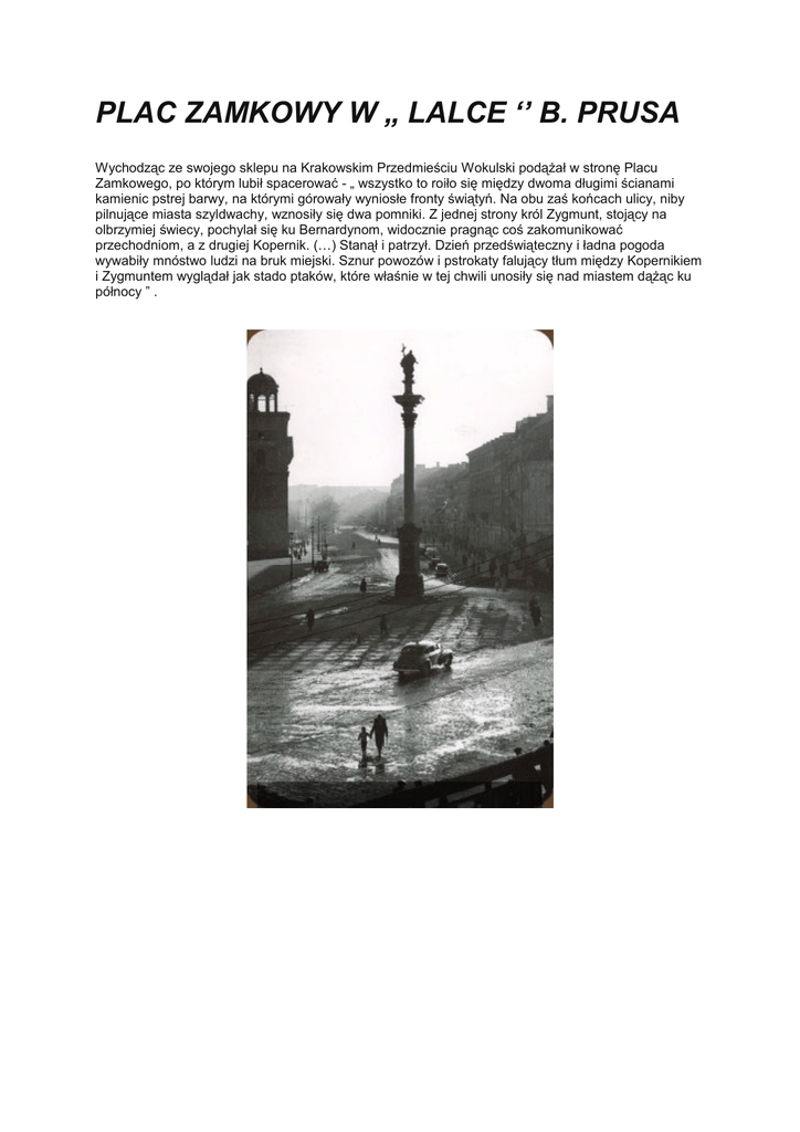 PLAC ZAMKOWY W „ LALCE ‘’ B. PRUSA Wychodząc ze swojego sklepu na Krakowskim Przedmieściu Wokulski podążał w stronę Placu Zamkowego, po którym lubił spacerować - „ wszystko to roiło się między dwoma długimi ścianami kamienic pstrej barwy, na którymi górowały wyniosłe fronty świątyń. Na obu zaś końcach ulicy, niby pilnujące miasta szyldwachy, wznosiły się dwa pomniki. Z jednej strony król Zygmunt, stojący na olbrzymiej świecy, pochylał się ku Bernardynom, widocznie pragnąc coś zakomunikować przechodniom, a z drugiej Kopernik. (…) Stanął i patrzył. Dzień przedświąteczny i ładna pogoda wywabiły mnóstwo ludzi na bruk miejski. Sznur powozów i pstrokaty falujący tłum między Kopernikiem i Zygmuntem wyglądał jak stado ptaków, które właśnie w tej chwili unosiły się nad miastem dążąc ku północy ” .
