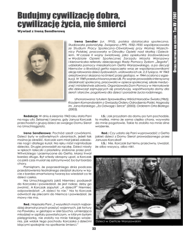 Wywiad z Ireną Sendlerową Irena Sendler (ur. 1910), polska działaczka społeczna. Studiowała polonistykę. Związana z PPS. 1932–1935 współpracowała ze Studium Pracy Społeczno-Oświatowej przy Wolnej Wszechnicy Polskiej, pracowała w Ośrodku Opieki nad Matką i Dzieckiem. W czasie II wojny światowej, jako opiekunka środowiskowa w Wydziale Opieki Społecznej Zarządu Miasta Warszawy i kierowniczka referatu dziecięcego Rady Pomocy Żydom „Żegota”, udzielała pomocy mieszkańcom Getta Warszawskiego, a po decyzji Niemców o likwidacji getta rozpoczęła wraz ze współpracownikami akcję ratowania dzieci żydowskich, uratowała ich ok. 2,5 tysiąca. W 1943 aresztowana i skazana na śmierć przez gestapo, w 1944 ocalona z egzekucji. W 1949 przesłuchiwana przez UB. Po wojnie prowadziła intensywną działalność społeczną, pracowała w opiece społecznej, szkole medycznej i ministerstwie zdrowia. Organizowała Dom Pomocy w Henrykowie dla dziewcząt zajmujących się prostytucją, współtworzyła domy dla sierot i starców, pogotowia dla dzieci i poradnie życia rodzinnego. Uhonorowana: tytułem Sprawiedliwy Wśród Narodów Świata (1965), Krzyżem Komandorskim z Gwiazdą Orderu Odrodzenia Polski, Nagrodą im. Jana Karskiego „Za Odwagę i Serce” (2003), Orderem Orła Białego (2003). Redakcja: W dniu 6 sierpnia 1942 roku stała Pani na rogu ulic Żelaznej i Leszna, gdy Janusz Korczak przechodził z grupą dzieci ze swojego Domu Sierot na Umschlagplatz. I.S.: Jak przyszłam do domu po tym pochodzie, to matka, mimo że sama ciężko chora, wzywała do mnie pogotowie. Takie to zrobiło na mnie silne wrażenie. Irena Sendlerowa: Pochód szedł czwórkami. Dzieci były w odświętnych ubraniach, jeżeli tak można je określić. Korczak sam miał jakieś zakażenie nogi i dlatego kulał. Na ręku niósł najmłodsze dziecko. Drugie prowadził za rączkę. Dzieci niosły w rękach laleczki z plasteliny zrobione przez prof. Witwickiego i przemycone do Getta. Marsz trwał bardzo długo. Był wtedy okropny upał, a Korczak co jakiś czas musiał się zatrzymywać bo był bardzo chory. Pamiętam, że poprzedniego dnia podczas przedstawienia teatralnego siedział skulony w kącie z bardzo zmartwioną twarzą bo wiedział co te dzieci czeka. Na Umschlagplatz jakiś Niemiec podszedł do Korczaka i powiedział, że jest nakaz, żeby go zwolnić. A Korczak zapytał: „A dzieci?” Niemiec odpowiedział: „A dzieci to nie.” Na to Korczak odwrócił się plecami do Niemca i powiedział, że mowy nie ma. Red.: Czy udało się Pani wyprowadzić z Getta jakieś dzieci z Domu Sierot prowadzonego przez Janusza Korczka? I.S.: Nie. Korczak był temu przeciwny. Uważał, że albo wszyscy, albo nikt. Red.: Napisała Pani „Z wszystkich moich najbardziej dramatycznych przeżyć wojennych, jak tortury na Pawiaku, w gestapo w alei Szucha, umierająca młodzież w szpitalu powstańczym, w którym byłam pielęgniarką, nie zrobiły na mnie takiego wrażenia, jak widok tego pochodu Korczaka z dziećmi idącymi spokojnie na spotkanie śmierci.” Dzieci w Gettcie Warszawskim 33 Opieka paliatywna nad dziećmi - Tom XV / 2007 Budujmy cywilizację dobra, cywilizację życia, nie śmierci Opieka paliatywna nad dziećmi - Tom XV / 2007 Red.: Czy uważa Pani, że zasada Korczaka „albo wszyscy, albo nikt” była w tamtych warunkach moralnie uzasadniona? I.S.: Uzasadniona. Jak Pan myśli, które dzieci miałby wybrać? Red.: Dlaczego Korczak zgłosił się w lutym 1942 roku do pracy w Głównym Domu Schronienia przy ul Dzielnej 39, gdzie masowo umierały dzieci? I.S.: On zawsze był tam gdzie było najgorzej. To była jego idea. Kiedyś dziennikarka w Jerozolimie zapytała mnie dlaczego w ybrała Pani sobie taką niebezpieczną robotę. A ja jej powiedziałam to samo, że zawsze jestem tam gdzie najbardziej potrzeba. A nauczył mnie tego ojciec, lekarz. Ojciec zma rł podczas epideIrena Sendlerowa mii tyfusu, którym zaraził się odwiedzając chorych. Żaden inny lekarz nie chciał do nich jeździć. Wie Pan, jak ktoś mnie nazywa bohaterką to dostaję szału (śmiech). Red.: Proszę opisać jak wyglądał Główny Dom Schronienia przy ul Dzielnej 39. I.S.: Był zaniedbany, brudny. Brakowało personelu. Przebywało tam ok. 100 dzieci, zarówno chorych jak i zdrowych. Pamiętam, że kiedyś zaniosłam im choinkę. Połamałam gałęzie i przeniosłam je do Getta pod ubraniem. Dla dzieci była to sensacja i radość, że mają choinkę. Red.: Korczak pisał: „Jeżeli nie możemy ich przywrócić do życia (chodzi o dzieci, które są praktycznie już nie do uratowania), to przynajmniej zapewnijmy im ludzką i porządną śmierć”. Zaproponował zorganizowanie specjalnego pomieszczenia dla dzieci: ”Coś w rodzaju wielkiego pokoju z półkami jak w sklepie... To nie wymaga dużo miejsca ani kosztów”. Czy udało mu się to zrealizować? I.S.: Tak, udało. Warunki w tym domu uległy pewnej poprawie. Część dzieci z Głównego Domu Schronienia przy ul Dzielnej 39 zabrał do swojego Domu Sierot. Red.: Korczak w marcu 1942 r. napisał: „Zgłaszam kandydaturę na ordynatora oddziału konających dzieci”. Czy Janusz Korczak nie uważa Pani, że było to pierwsze hospicjum dla dzieci, gdzie Korczak starał się zapewnić im godne umieranie? I.S.: Na pewno tak. Mimo, że słowo hospicjum nie było wtedy używane. Red.: Co się stało z dziećmi z domu przy ul. Dzielnej w sierpniu 1942 roku? I.S.: Niestety tego nie wiem. Red.: Korczak napisał: „Kiedy w ciężkich godzinach ważyłem projekt uśmiercania, usypiania skazanych na zagładę niemowląt i starców żydowskiego Getta, rozumiałem to jako morderstwo w stosunku do chorych i słabych, jako skrytobójstwo odnośnie do nieświadomych”. Czy Korczak był przeciwnikiem eutanazji? I.S.: Tak, był przeciwnikiem eutanazji. Red.: Czy znane były Pani przypadki eutanazji w Getcie Warszawskim? I.S.: Nie. Red.: Czy była Pani świadkiem śmierc