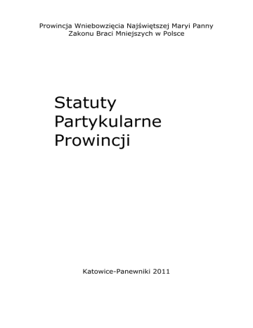 Prowincja Wniebowzięcia Najświętszej Maryi Panny Zakonu Braci Mniejszych w Polsce Statuty Partykularne Prowincji Katowice-Panewniki 2011 Redakcja Bonawentura Krzemień OFM sekretarz Prowincji Wniebowzięcia NMP Projekt okładki Abraham Sobkowski OFM Wydawca Prowincja Wniebowzięcia NMP Zakonu Braci Mniejszych w Polsce ul. Panewnicka 76 40-760 Katowice (do użytku wewnętrznego) FR. JOSÉ RODRÍGUEZ CARBALLO MINISTER GENERALNY CAŁEGO ZAKONU BRACI MNIEJSZYCH I POKORNY W PANU SŁUGA DEKRET Definitorium Generalne na posiedzeniu 13 maja 2011 roku, po dokładnym rozpatrzeniu, zatwierdziło, z przedłożonymi zmianami, Statuty Partykularne Prowincji Wniebowzięcia NMP w Polsce, wypracowane przez Kapitułę Prowincjalną w 2010 r. i przedstawione do zatwierdzenia przez Ministra Prowincjalnego, pismem z dnia 15 lutego 2011 roku, zgodnie z przepisami Konstytucji Generalnych i Statutów Generalnych Zakonu. DLATEGO, MOCĄ NINIEJSZEGO DEKRETU, ZATWIERDZAM I OGŁASZAM JAKO ZATWIERDZONE WYŻEJ WYMIENIONE STATUTY PARTYKULARNE PROWINCJI WNIEBOWZIĘCIA NMP W POLSCE, WEDŁUG TEKSTU W JĘZYKU ŁACIŃSKIM, KTÓRY PRZECHOWUJE SIĘ W ARCHIWUM GENERALNYM ZAKONU. Dekret obowiązuje bez względu na wszelkie przeciwne zarządzenia. Z Kurii Generalnej Zakonu Braci Mniejszych w Rzymie, 24 maja 2011 r. Fr. José Rodríguez Carballo OFM minister generalny Fr. Aidan McGrath OFM sekretarz generalny Prot. 101772/S 083-11 Spis treści: Rozdział I „ZACHOWYWAĆ EWANGELIĘ PANA NASZEGO JEZUSA CHRYSTUSA” (RB 1,1) .......................................................................................... 7 Rozdział II „DUCH MODLITWY I POBOŻNOŚCI” (RB 5,2) ............................................................................................ Rozdział III „WSZYSCY JESTEŚCIE BRAĆMI” (RN 22,33)......................................................................................... Rozdział IV „JESTEŚCIE PIELGRZYMAMI I PRZECHODNIAMI NA TYM ŚWIECIE” (1P 2,11; RB 6,2) ............................................................................... Rozdział V „PO TO POSŁAŁ WAS BÓG NA CAŁY ŚWIAT” (LZ 9) ............................................................................................... Rozdział VI „BRACIA POWINNI PRAGNĄĆ POSIĄŚĆ DUCHA PAŃSKIEGO WRAZ Z JEGO UŚWIĘCAJĄCYM DZIAŁANIEM” (RB 10,8) .......................................................................................... Rozdział VII „BRACIA MAJĄ OBOWIĄZEK SŁUCHAĆ BRATA FRANCISZKA I JEGO NASTĘPCÓW” (RB 1,3) ............................................................................................ Część I – Zarządzanie prowincją ........................................................... Część II – Zarządzanie domem zakonnym ............................................. Rozdział VIII „MINISTROWIE NIECH UPOMINAJĄ BRACI ORAZ POKORNIE I Z MIŁOŚCIĄ NIECH ICH NAKŁANIAJĄ DO POPRAWY” (RB 10, 1).......................................................................................... Rozdział I „ZACHOWYWAĆ EWANGELIĘ PANA NASZEGO JEZUSA CHRYSTUSA” (RB 1,1) Art. 1 §1. Podstawę życia w naszym zakonie stanowią: Reguła św. Franciszka, Konstytucje Generalne oraz Statuty Generalne (KG art. 12,1 i art. 14,1). §2. Niniejsze Statuty są uzupełnieniem wymienionych wyżej zbiorów naszego prawa własnego. Mają one służyć wierniejszemu zachowywaniu życia zakonnego z uwzględnieniem warunków, w jakich rozwija swoją działalność nasza prowincja (kan. 587,4; KG art. 16,1; SG art. 3,1). §3. Bracia obrządku wschodniego należący do Fundacji Wszystkich Świętych Zakonu Serafickiego na Ukrainie, którzy stanowią wymowny znak powszechności charyzmatu franciszkańskiego, niech starają się zachować normy Konstytucji i Statutów Generalnych oraz tych Statutów na równi ze swoim prawem partykularnym (por. KG art. 12,3). Art. 2 §1. Minister prowincjalny powinien zatroszczyć się, aby każdy brat miał do swojej dyspozycji egzemplarz: Reguły i Testamentu św. Franciszka, Konstytucji i Statutów Generalnych oraz Statutów Partykularnych Prowincji (por. SG art. 1). §2. Każdy brat przy składaniu pierwszej profesji ma otrzymać po jednym egzemplarzu wyżej wymienionych zbiorów prawa własnego. Art. 3 §1. W każdy piątek w czasie obiadu należy czytać Regułę. W kolejne piątki czyta się trzy kolejne jej rozdziały. Podczas kolacji czyta się Testament św. Franciszka. Zachętę i błogosławieństwo św. Franciszka odczytuje gwardian. W przypadku gdy jest obecny minister prowincjalny lub wikariusz prowincjalny, wówczas on odczytuje tę zachętę i to błogosławieństwo (SG art. 2,1). §2. Co roku po uroczystości św. Franciszka należy czytać przy stole Konstytucje Generalne, Statuty Generalne, Statuty Partykularne Prowincji oraz dokumenty kapituł generalnej i prowincjalnej, wydane dla lepszej interpretacji i przystosowania Reguły. Podczas kapituł domowych lub osobnych spotkań, o których liczbie decyduje gwardian, z zachowaniem przepisu SP art. 100,1-2, należy omawiać powyższe dokumenty w celu stałej formacji duchowej (por. SG art. 2,2). Art. 4 §1. Statuty niniejsze wiążą wszystkich braci prowincji w ten sam sposób jak Konstytucje Generalne (kan. 598; KG art. 6,2). §2. Władzę dyspensowania od przepisów Statutów Partykularnych oraz Specjalnych Prowincji mają przełożeni, zgodnie z Konstytucjami Generalnymi (KG art.: 17 i 18; SG art. 5). §3. Władzę autentycznego interpretowania niniejszych Statutów posiadają poza kapitułą prowincjalną kongres kapitulny, definitorium prowincji i rada plenarna prowincji. §4. Statuty Specjalne Prowincji uchwala i zatwierdza kapituła prowincjalna (SG art. 4,2). §5. Regulaminy nieautonomicznych jednostek zatwierdza minister prowincjalny (KG 16,2). Rozdział II „DUCH MODLITWY I POBOŻNOŚCI” (RB 5,2) Art. 5 §1. „Ofiara eucharystyczna, pamiątka śmierci i zmartwychwstania Pana, w której uwieczni