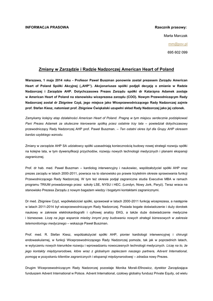 INFORMACJA PRASOWA Rzecznik prasowy: Marta Marczak [email protected] 695 602 099 Zmiany w Zarządzie i Radzie Nadzorczej American Heart of Poland Warszawa, 1 maja 2014 roku - Profesor Paweł Buszman ponownie został prezesem Zarządu American Heart of Poland Spółki Akcyjnej („AHP”). Akcjonariusze spółki podjęli decyzję o zmianie w Radzie Nadzorczej i Zarządzie AHP. Dotychczasowa Prezes Zarządu spółki dr Katarzyna Adamek zostaje w American Heart of Poland na stanowisku wiceprezesa zarządu (COO). Nowym Przewodniczącym Rady Nadzorczej został dr Zbigniew Czyż, jego miejsce jako Wiceprzewodniczącego Rady Nadzorczej zajmie prof. Stefan Kiesz, natomiast prof. Zbigniew Ćwiąkalski uzupełni skład Rady Nadzorczej jako jej członek. Zamykamy kolejny etap działalności American Heart of Poland. Pragnę w tym miejscu serdecznie podziękować Pani Prezes Adamek za skuteczne kierowanie spółką przez ostatnie trzy lata – powiedział dotychczasowy przewodniczący Rady Nadzorczej AHP prof. Paweł Buszman. – Ten ostatni okres był dla Grupy AHP okresem bardzo szybkiego wzrostu. Zmiany w zarządzie AHP SA udziałowcy spółki uzasadniają koniecznością budowy nowej strategii rozwoju spółki na kolejne lata, w tym dywersyfikacji przychodów, rozwoju nowych technologii medycznych i planami ekspansji zagranicznej. Prof. dr hab. med. Paweł Buszman – kardiolog interwencyjny i naukowiec, współzałożyciel spółki AHP oraz prezes zarządu w latach 2000-2011, powraca na to stanowisko po prawie trzyletnim okresie sprawowania funkcji Przewodniczącego Rady Nadzorczej. W tym też okresie podjął zagraniczne studia Executive MBA w ramach programu TRIUM prowadzonego przez szkoły LSE, NYSU i HEC. (Londyn, Nowy Jork, Paryż). Teraz wraca na stanowisko Prezesa Zarządu z nowym bagażem wiedzy i bogatymi kontaktami zagranicznymi. Dr med. Zbigniew Czyż, współwłaściciel spółki, sprawował w latach 2000-2011 funkcję wiceprezesa, a następnie w latach 2011-2014 był wiceprzewodniczącym Rady Nadzorczej. Posiada bogate doświadczenie i duży dorobek naukowy w zakresie elektrokardiografii i cyfrowej analizy EKG, a także duże doświadczenie medyczne i biznesowe. Liczę na jego wsparcie miedzy innymi przy budowaniu nowych strategii biznesowych w zakresie telemonitoringu medycznego – wskazuje Paweł Buszman. Prof. med. R. Stefan Kiesz, współzałożyciel spółki AHP, pionier kardiologii interwencyjnej i chirurgii endowaskularnej, w funkcji Wiceprzewodniczącego Rady Nadzorczej pomoże, tak jak w poprzednich latach, w wytyczeniu nowych kierunków rozwoju i wprowadzaniu nowoczesnych technologii medycznych. Liczę na to, że jego kontakty międzynarodowe, które wraz z globalnym zapleczem naszego partnera, Advent International, pomogą w pozyskaniu klientów zagranicznych i ekspansji międzynarodowej – zdradza nowy Prezes. Drugim Wiceprzewodniczącym Rady Nadzorczej pozostaje Monika Morali-Efinowicz, dyrektor Zarządzająca funduszem Advent International w Polsce. Advent International, czołowy globalny fundusz Private Equity, od wielu lat inwestuje w ochronę zdrowia i najnowsze technologie medyczne na całym świecie, a od ponad dwóch lat, jako mniejszościowy udziałowiec w AHP, aktywnie wspiera rozwój spółki. Bardzo wiele udało się wspólnie osiągnąć. AHP to wiodąca, zdywersyfikowana grupa medyczna. AHP to największy w Polsce usługodawca w zakresie chorób sercowo-naczyniowych: leczy ponad sto tysięcy pacjentów rocznie w ramach hospitalizacji, rehabilitacji i specjalistycznych porad ambulatoryjnych. Tymczasem potrzeby ciągle są znacznie większe. Dlatego rozwój nowych usług i technologii w służbie ratowania zdrowia i życia pozostają dla nas priorytetem. Wspólnie przyglądamy się też rynkom międzynarodowym – mówi Monika Morali-Efinowicz, Dyrektor Zarządzająca Advent International. Prof. Zbigniew Ćwiąkalski, prawnik, były Minister Sprawiedliwości, to szeroko znany i ceniony autorytet w zakresie prawa karnego i spółek handlowych. Prof. Ćwiąkalski pełni obecnie również funkcję wiceprzewodniczącego Rady Nadzorczej PZU.