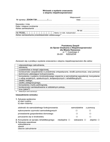 Wniosek o wydanie orzeczenia o stopniu niepełnosprawności Nr sprawy: ZOON-730-................../....... Miejscowość ............................. Data .............................. Nazwisko i imię .......................................................................................................................... Data i miejsce urodzenia ........................................................................................................... Adres zamieszkania ................................................................................................................... ............................................................................................................ Nr tel. ............................ Nr PESEL Seria i nr dok. tożsamości ........................................ Adres zamieszkania przedstawiciela ustawowego1) .................................................................. .................................................................................................................................................... Powiatowy Zespół do Spraw Orzekania o Niepełnosprawności dla Miasta Rzeszowa ul. T. Czackiego 2 35-051 RZESZÓW Zwracam się z prośbą o wydanie orzeczenia o stopniu niepełnosprawności dla celów: odpowiedniego zatrudnienia, szkolenia, uczestnictwa w terapii zajęciowej, konieczności zaopatrzenia w przedmioty ortopedyczne, środki pomocnicze, oraz pomoce techniczne ułatwiające funkcjonowanie, korzystania z systemu środowiskowego wsparcia w samodzielnej egzystencji, korzystania z usług socjalnych, opiekuńczych, terapeutycznych i rehabilitacyjnych, zasiłku stałego, zasiłku pielęgnacyjnego, korzystania z karty parkingowej, konieczności zamieszkiwania w oddzielnym pokoju, inne (jakie?) ......................................................................................................................... × Właściwy/e cel/e zaznaczyć Uzasadnienie wniosku: 1. Sytuacja społeczna: a) stan cywilny ....................................................................................................................... b) stan rodzinny ..................................................................................................................... zdolność do samodzielnego funkcjonowania: wykonywanie czynności samoobsługowych prowadzenie gospodarstwa domowego poruszanie się w środowisku samodzielnie z pomocą □ □ □ □ □ □ 2. Korzystanie ze sprzętu rehabilitacyjnego niezbędne □ wskazane □ zbędne □ 3. Sytuacja zawodowa: wykształcenie ......................................................................................................................... zawód ..................................................................................................................................... obecne zatrudnienie: ............................................................................................................. ................................................................................................................................................ OŚWIADCZAM że: 1. składałem/am* (nie składałem/am*) uprzednio wniosek o ustalenie stopnia niepełnosprawności: kiedy ................................................................................................................, z jakim skutkiem ................................................................................................................... 2. mogę* (nie mogę*) przybyć na posiedzenie składu orzekającego. (Jeśli nie, to należy załączyć zaświadczenie lekarskie potwierdzające niemożność wzięcia udziału w posiedzeniu z powodu długotrwałej lub nie rokującej poprawy choroby). 3. w razie stwierdzonej przez zespół orzekający konieczności wykonania badań dodatkowych, konsultacji specjalistycznych lub obserwacji szpitalnych, uzupełniających złożone zaświadczenie o stanie zdrowia wydane przez lekarza nie będącego lekarzem ubezpieczenia zdrowotnego, jestem świadomy wymogu ponoszenia ich kosztów we własnym zakresie. 4. Posiadam prawo jazdy lub pozwolenie na prowadzenie tramwajów TAK/NIE* 5. Posiadam ważne orzeczenie innego organu orzekającego TAK/NIE* Oświadczam, że dane zawarte we wniosku są zgodne ze stanem faktycznym i jestem świadomy/a odpowiedzialności za zeznanie nieprawdy lub zatajenie prawdy. W załączeniu do wniosku przedkładam: 1. zaświadczenie o stanie zdrowia wydane przez lekarza, pod którego opieką lekarską znajduje się osoba zainteresowana, nie wcześniej niż na 30 dni przed złożeniem wniosku, 2. posiadaną dokumentację medyczną, potwierdzona za zgodność z oryginałem tj. kserokopia kart informacyjnych z leczenia szpitalnego, kserokopie historii choroby dotyczącą schorzenia (szczególnie z ostatnich 2 lat), Kserokopia wyników badań (RTG, EKG, USG, EEG, audiogram, itp.), 3. inne dokumenty podać jakie, w tym posiadane ważne orzeczenie innego organu orzekającego,(kopia) ...................................................................................................................... ….......................................................................................................................................... .............................................. podpis osoby zainteresowanej, lub jej przedstawiciela ustawowego 1) dotyczy przypadku ubezwłasnowolnienia osoby zainteresowanej, * niepotrzebne skreślić. Wniosek o ustalenie stopnia niepełnosprawności i wskazań do ulg i uprawnień. Nr sprawy: ZOON-730-................../........ Miejscowość ............................. Data ............................... Nazwisko i imię .......................................................................................................................... Data i miejsce urodzenia ........................................................................................................... Adres zamieszkania .....................