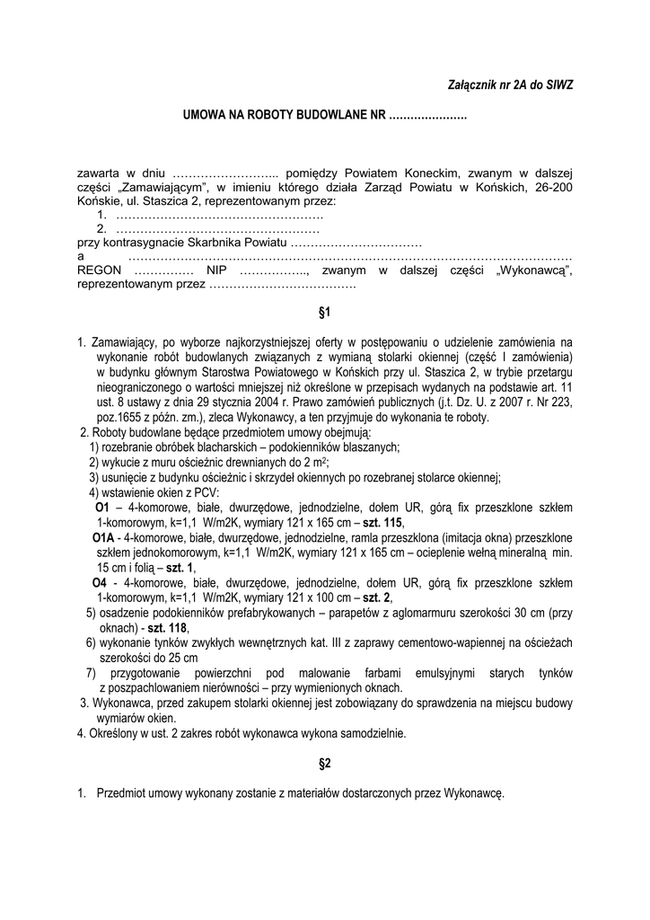 Załącznik nr 2A do SIWZ UMOWA NA ROBOTY BUDOWLANE NR …………………. zawarta w dniu ……………………... pomiędzy Powiatem Koneckim, zwanym w dalszej części „Zamawiającym”, w imieniu którego działa Zarząd Powiatu w Końskich, 26-200 Końskie, ul. Staszica 2, reprezentowanym przez: 1. ……………………………………………. 2. …………………………………………… przy kontrasygnacie Skarbnika Powiatu …………………………… a ………………………………………………………………………………………………… REGON …………… NIP …………….., zwanym w dalszej części „Wykonawcą”, reprezentowanym przez ………………………………. §1 1. Zamawiający, po wyborze najkorzystniejszej oferty w postępowaniu o udzielenie zamówienia na wykonanie robót budowlanych związanych z wymianą stolarki okiennej (część I zamówienia) w budynku głównym Starostwa Powiatowego w Końskich przy ul. Staszica 2, w trybie przetargu nieograniczonego o wartości mniejszej niŜ określone w przepisach wydanych na podstawie art. 11 ust. 8 ustawy z dnia 29 stycznia 2004 r. Prawo zamówień publicznych (j.t. Dz. U. z 2007 r. Nr 223, poz.1655 z późn. zm.), zleca Wykonawcy, a ten przyjmuje do wykonania te roboty. 2. Roboty budowlane będące przedmiotem umowy obejmują: 1) rozebranie obróbek blacharskich – podokienników blaszanych; 2) wykucie z muru ościeŜnic drewnianych do 2 m2; 3) usunięcie z budynku ościeŜnic i skrzydeł okiennych po rozebranej stolarce okiennej; 4) wstawienie okien z PCV: O1 – 4-komorowe, białe, dwurzędowe, jednodzielne, dołem UR, górą fix przeszklone szkłem 1-komorowym, k=1,1 W/m2K, wymiary 121 x 165 cm – szt. 115, O1A - 4-komorowe, białe, dwurzędowe, jednodzielne, ramla przeszklona (imitacja okna) przeszklone szkłem jednokomorowym, k=1,1 W/m2K, wymiary 121 x 165 cm – ocieplenie wełną mineralną min. 15 cm i folią – szt. 1, O4 - 4-komorowe, białe, dwurzędowe, jednodzielne, dołem UR, górą fix przeszklone szkłem 1-komorowym, k=1,1 W/m2K, wymiary 121 x 100 cm – szt. 2, 5) osadzenie podokienników prefabrykowanych – parapetów z aglomarmuru szerokości 30 cm (przy oknach) - szt. 118, 6) wykonanie tynków zwykłych wewnętrznych kat. III z zaprawy cementowo-wapiennej na ościeŜach szerokości do 25 cm 7) przygotowanie powierzchni pod malowanie farbami emulsyjnymi starych tynków z poszpachlowaniem nierówności – przy wymienionych oknach. 3. Wykonawca, przed zakupem stolarki okiennej jest zobowiązany do sprawdzenia na miejscu budowy wymiarów okien. 4. Określony w ust. 2 zakres robót wykonawca wykona samodzielnie. §2 1. Przedmiot umowy wykonany zostanie z materiałów dostarczonych przez Wykonawcę. 2. Materiały, o których mowa w ust. 1 muszą odpowiadać co do jakości wymaganiom określonym ustawą z dnia 16 kwietnia 2004 r. o wyrobach budowlanych (Dz. U. Nr 92, poz. 881) oraz wymaganiom określonym w specyfikacji technicznej wykonania i odbioru robót. 3. Zdemontowaną stolarkę okienną oraz inne materiały z rozbiórki nie nadające się do powtórnego uŜycia (np. gruz) Wykonawca jest zobowiązany usunąć poza teren budowy przy przestrzeganiu przepisów ustawy z dnia 27 kwietnia 2001 r. o odpadach (jt. Dz. U. z 2007 r. Nr 39, poz. 251 z późniejszymi zmianami). §3 Termin realizacji robót strony ustalają na okres dwóch miesięcy od daty zawarcia niniejszej umowy, tj. w nieprzekraczalnym terminie do dnia……………………………. §4 1. Do obowiązków Zamawiającego naleŜy: 1) przekazanie Wykonawcy placu budowy w terminie 3 dni od daty zawarcia umowy, 2) zapewnienie Wykonawcy odpłatnego korzystania z mediów (woda, energia elektryczna), o ile zaistnieje taka konieczność. 2. Do obowiązków Wykonawcy naleŜy: 1) zawarcie, na własny koszt, umowy ubezpieczenia od odpowiedzialności cywilnej za szkody oraz następstwa nieszczęśliwych wypadków dotyczące pracowników i osób trzecich, a powstałe w związku z prowadzonymi robotami. Stosowną umową ubezpieczenia Wykonawca winien się okazać najpóźniej w dniu przekazania placu budowy. Brak umowy ubezpieczenia staje się podstawą do odstąpienia Zamawiającego od umowy z przyczyn zaleŜnych od Wykonawcy z konsekwencją kary umownej w wysokości określonej w §8 ust. 1 pkt 3; 2) zapewnienie przyjęcia obowiązków kierownika robót przez osobę posiadającą stosowne uprawnienia do kierowania robotami budowlanymi w specjalności konstrukcyjnobudowlanej i będącej członkiem właściwego samorządu zawodowego, wskazaną w złoŜonej ofercie; 3) zabezpieczenie terenu wykonywania robót budowlanych przed dostępem osób trzecich; 4) przestrzeganie przepisów bhp; 5) inne, wynikające z art.21a i art. 22 ustawy z dnia 7 lipca 1994 r. Prawo budowlane (j.t. Dz. U. z 2006 r. Nr 156, poz. 1118 z późn. zm.) §5 1. Za wykonanie przedmiotu umowy Wykonawca otrzyma ryczałtowe wynagrodzenie brutto w wysokości ………. (słownie złotych: ………………………………………………………………..). 2. Podstawą do wystawienia faktury jest podpisany przez obie strony protokół końcowy odbioru robót w rozumieniu zapisów §6 ust. 7 wraz z podpisem inspektora nadzoru inwestorskiego potwierdzającego naleŜyte ich wykonanie. 3. NaleŜność z tytułu złoŜonej faktury, wystawionej na Starostwo Powiatowe w Końskich, 26-200 Końskie, ul. Staszica 2, będzie płatna przelewem na konto Wykonawcy podane w fakturze. 4. Zamawiający ma obowiązek zapłaty faktury w terminie 30 dni licząc od daty jej otrzymania. Datą zapłaty jest dzień wydania polecenia przelewu bankowego. §6 1. Gotowość do odbioru robót będących przedmiotem umowy, Wykonawca zobowiązany jest zgłosić co najmniej na 5 dni przed upływem terminu wykonania, który został określony w §3 niniejszej umowy. 2. Zgłoszenie gotowości do odbioru robót wymaga pisemnego powiadomienia Z