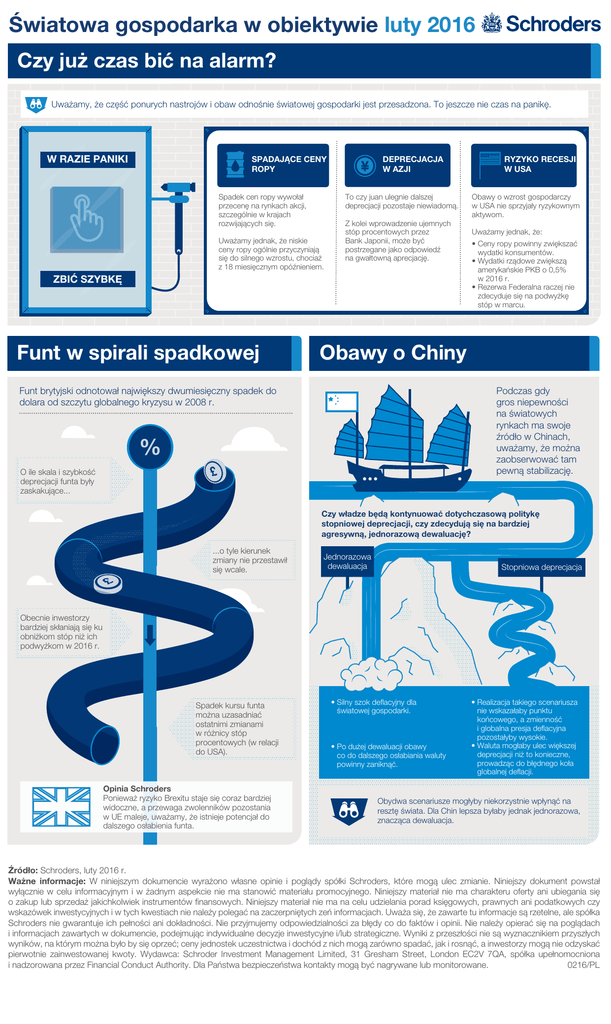 Światowa gospodarka w obiektywie luty 2016 Czy już czas bić na alarm? Uważamy, że część ponurych nastrojów i obaw odnośnie światowej gospodarki jest przesadzona. To jeszcze nie czas na panikę. W RAZIE PANIKI SPADAJĄCE CENY ROPY Spadek cen ropy wywołał przecenę na rynkach akcji, szczególnie w krajach rozwijających się. DEPRECJACJA W AZJI To czy juan ulegnie dalszej deprecjacji pozostaje niewiadomą. Uważamy jednak, że niskie ceny ropy ogólnie przyczyniają się do silnego wzrostu, chociaż z 18 miesięcznym opóźnieniem. Z kolei wprowadzenie ujemnych stóp procentowych przez Bank Japonii, może być postrzegane jako odpowiedź na gwałtowną aprecjację. ZBIĆ SZYBKĘ Funt w spirali spadkowej RYZYKO RECESJI W USA Obawy o wzrost gospodarczy w USA nie sprzyjały ryzykownym aktywom. Uważamy jednak, że: • Ceny ropy powinny zwiększać wydatki konsumentów. • Wydatki rządowe zwiększą amerykańskie PKB o 0,5% w 2016 r. • Rezerwa Federalna raczej nie zdecyduje się na podwyżkę stóp w marcu. Obawy o Chiny Funt brytyjski odnotował największy dwumiesięczny spadek do dolara od szczytu globalnego kryzysu w 2008 r. Podczas gdy gros niepewności na światowych rynkach ma swoje źródło w Chinach, uważamy, że można zaobserwować tam pewną stabilizację. O ile skala i szybkość deprecjacji funta były zaskakujące... Czy władze będą kontynuować dotychczasową politykę stopniowej deprecjacji, czy zdecydują się na bardziej agresywną, jednorazową dewaluację? ...o tyle kierunek zmiany nie przestawił się wcale. Jednorazowa dewaluacja Stopniowa deprecjacja Obecnie inwestorzy bardziej skłaniają się ku obniżkom stóp niż ich podwyżkom w 2016 r. Spadek kursu funta można uzasadniać ostatnimi zmianami w różnicy stóp procentowych (w relacji do USA). Opinia Schroders Ponieważ ryzyko Brexitu staje się coraz bardziej widoczne, a przewaga zwolenników pozostania w UE maleje, uważamy, że istnieje potencjał do dalszego osłabienia funta. • Silny szok deflacyjny dla światowej gospodarki. • Po dużej dewaluacji obawy co do dalszego osłabiania waluty powinny zaniknąć. • Realizacja takiego scenariusza nie wskazałaby punktu końcowego, a zmienność i globalna presja deflacyjna pozostałyby wysokie. • Waluta mogłaby ulec większej deprecjacji niż to konieczne, prowadząc do błędnego koła globalnej deflacji. Obydwa scenariusze mogłyby niekorzystnie wpłynąć na resztę świata. Dla Chin lepsza byłaby jednak jednorazowa, znacząca dewaluacja. Źródło: Schroders, luty 2016 r. Ważne informacje: W niniejszym dokumencie wyrażono własne opinie i poglądy spółki Schroders, które mogą ulec zmianie. Niniejszy dokument powstał wyłącznie w celu informacyjnym i w żadnym aspekcie nie ma stanowić materiału promocyjnego. Niniejszy materiał nie ma charakteru oferty ani ubiegania się o zakup lub sprzedaż jakichkolwiek instrumentów finansowych. Niniejszy materiał nie ma na celu udzielania porad księgowych, prawnych ani podatkowych czy wskazówek inwestycyjnych i w tych kwestiach nie należy polegać na zaczerpniętych zeń informacjach. Uważa się, że zawarte tu informacje są rzetelne, ale spółka Schroders nie gwarantuje ich pełności ani dokładności. Nie przyjmujemy odpowiedzialności za błędy co do faktów i opinii. Nie należy opierać się na poglądach i informacjach zawartych w dokumencie, podejmując indywidualne decyzje inwestycyjne i/lub strategiczne. Wyniki z przeszłości nie są wyznacznikiem przyszłych wyników, na którym można było by się oprzeć; ceny jednostek uczestnictwa i dochód z nich mogą zarówno spadać, jak i rosnąć, a inwestorzy mogą nie odzyskać pierwotnie zainwestowanej kwoty. Wydawca: Schroder Investment Management Limited, 31 Gresham Street, London EC2V 7QA, spółka upełnomocniona i nadzorowana przez Financial Conduct Authority. Dla Państwa bezpieczeństwa kontakty mogą być nagrywane lub monitorowane. 0216/PL