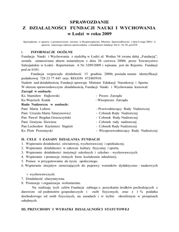 SPRAWOZDANIE Z DZIAŁALNOŚCI FUNDACJI NAUKI I WYCHOWANIA w Łodzi w roku 2009 Sporządzone w oparciu o postanowienia zawarte w Rozporządzeniu Ministra Sprawiedliwości z dnia 8 maja 2001r w sprawie ramowego zakresu sprawozdania z działalności fundacji /Dz.U. Nr 50, poz529/ INFORMACJE OGÓLNE Fundacja Nauki i Wychowania z siedzibą w Łodzi ul. Wodna 34 zwana dalej „Fundacją”, została ustanowiona aktem notarialnym z dnia 28 czerwca 2000r. przez Towarzystwo Salezjańskie w Łodzi– Repertorium A Nr 3209/2009 i wpisana jest do Rejestru Fundacji pod nr 6101. Fundacja rozpoczęła działalność 15 grudnia 2000r, posiada numer identyfikacji podatkowej 728 23 77 445 oraz REGON 472405910. Nadzór nad działalnością Fundacji sprawuje Minister Edukacji Narodowej i Sportu. W okresie sprawozdawczym działalnością Fundacji Nauki i Wychowania kierował: Zarząd w osobach: Ks. Stanisław Hajkowski - Prezes Zarządu Ks.Wojciech Kułak - Wiceprezes Zarządu Rada Nadzorcza w osobach: Pani Maria Lubera - Przewodniczący Rady Nadzorczej Pani Urszula Maria Tatarynowicz - Członek Rady Nadzorczej Pan Paweł Bogdan Gruszczyński - Członek Rady Nadzorczej Pani Grażyna Siewiera - Członek rady nadzorczej Pan Lechosław Kazimierz Stępień - Członek Rady Nadzorczej Ks. Piotr Przesmycki - Wiceprzewodniczący Rady Nadzorczej I. II. CELE I ZASADY DZIAŁANIA FUNDACJI 1. Wspieranie działalności oświatowej, wychowawczej i opiekuńczej. 2. Wspieranie działalności w zakresie kultury fizycznej i sportu. 3. Wspieranie działalności instytucji szkolnych i szkolno – wychowawczych. 4. Wspieranie i promocja różnych form kształcenia młodzieży. 5. Pomoc w przygotowaniu do życia społecznego. 6. Wspieranie inicjatyw zmierzających do poprawy warunków dydaktyczno – naukowych i wychowawczych. 7. Działalność charytatywna. 8. Promocja i organizacja wolontariatu. Na realizuję tych celów Fundacja zabiega o pozyskanie środków pochodzących z darowizn od podmiotów gospodarczych i osób fizycznych, oraz z 1 % podatku dochodowego od osób fizycznych, na zasadach i w trybie określonym w przepisach odrębnych. III. PRZYCHODY I WYDATKI DZIAŁALNOŚCI STATUTOWEJ A. Przychody W roku 2009 Fundacja uzyskała ogółem (w zł): z tego: 1. Z darowizn (w zł): - Darowizny 1% (w zł): - Darowizny pieniężne pozostałe (w zł): 2. Ze zbiórek publicznych (w zł): 67 753,63 65 939,93 65 105,23 834,70 1 813,70 Wydatki Z uzyskanych środków Fundacja przeznaczyła na cele statutowe ogólnie kwotę (w zł): 41 996,00 z tego: 1. Na dofinansowanie działalności oświatowo - wychowawczej Salezjańskiej Ogólnokształcącej Szkoły Muzycznej II stopnia w Lutomiersku (w zł): 27 500,00 B. 2. Na działalność oświatowo - wychowawczą prowadzoną przez Siostry Salezjanki w Krakowie z przeznaczeniem na pomoc materialną dla szkoły w tym na poszerzenie oferty edukacyjnej, warsztaty prowadzone przez wyższe uczelnie dla uczniów tej szkoły (w zł): 7 000,00 3. Sfinansowała koszty remontu pomieszczeń po Klasztorze Księży Salezjanów w Lutomiersku (w zł): pożarze w Zabytkowym 1 900,00 PONADTO: w ramach wspierania i promocji różnych form kształcenia młodzieży: 1. Na nagrody konkursowe „ SUPERGIMBUS „ - Najlepszy Gimnazjalista Województwa Łódzkiego Konkurs zorganizowany przez salezjańskie Gimnazjum im. Ks. Bosko oraz Fundację Nauki i Wychowania (www.salezjanie.lodz.pl) (w zł): 3 400,00 2. Na działalność oświatowo – wychowawczą Zespołu Szkół Salezjańskich w Łodzi przy ul. Wodnej 34 (w zł): 2 196,00 IV. DZIAŁALNOŚĆ GOSPODARCZA FUNDACJI W ramach działalności gospodarczej Fundacja prowadziła: - Wykłady dla osób dorosłych w ramach „Uniwersytetu Trzeciego Wieku” (www.fundacja.bosko.pl/sutw/) - Zakład „Bosko Media” (www.bosko.pl/) Dla pozyskania kandydatów Uniwersytetu Trzeciego Wieku, Rada Nadzorcza powołała Radę Programową określającą tematy kształcenia oraz odpłatność za uczestnictwo. Wykłady prowadzili zatrudnieni wykładowcy posiadający stosowne wykształcenie i uprawnienia. Uczestnikom Uniwersytetu organizowano również odpłatne wyjazdy krajoznawcze. Bosko.pl - sprawozdanie za rok 2009 Portal Młodzieżowy Bosko.pl prowadził swoją zwyczajną działalność wg swojego dotychczasowego profilu. Treść Teksty publikowane na Bosko.pl pochodziły z wielu źródeł: pisane przez młodzież specjalnie dla Bosko.pl, z czasopism (artykuły) i stacji radiowych (informacje), z którymi współpracujemy, od artystów (mp3, teledyski) oraz od samych użytkowników portalu (opinie, komentarze, wpisy w takich działach jak INFO, Modlitwa, SOS). Patronaty i promocja Bosko.pl objęło patronatem medialnym wiele inicjatyw i wydawnictw, m.in. spotkania kulturalne oraz popularnonaukowe organizowane przez Soli Deo działające przy Szkole Głównej Handlowej w Warszawie, Baw się bez dopingu w Łodzi, Campo Bosco w Czerwńsku nad Wisłą, Savionalia w Krakowie, płyty (m.in. zespołu 40/30 na 70, Katolika Front, Emensis), książkę „Idźcie do Galilei”. Prowadzona była nadal szeroko rozumiana promocja muzyki tworzonej przez chrześcijan, ze zwróceniem szczególnej uwagi na młodych twórców. Technika Kontynuowaliśmy prace modernizacyjne rozpoczęte rok wcześniej. Pod koniec lutego zostało zakończone przeniesienie całości artykułów do bazy danych. Wcześniejsze rozwiązanie polegało na inkludowaniu plików htm w kod php. Po przeniesieniu wszystkiego do bazy danych uzyskaliśmy łatwiejsze zarządzanie całością. W lipcu została także podjęta decyzja o przeniesieniu całego Bosko.pl do systemu Drupal. We wrześniu wystartowały prace w tym kierunku. Są prowadzone nadal i zajmą jeszcze sporo czasu. Nowy system pozwoli na budowanie wokół Bosko.pl portalu społecznościowego (zwłaszcza jeśli chodzi o działy SOS, Modlitwa i INFO). Ponieważ wszystkie prace są prowadzone w oparciu o wolontariuszy, wszelkie zmiany zachodzą powoli. Personel Bosko.pl j