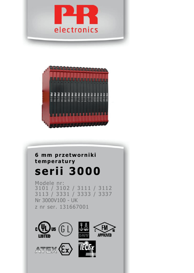 6 mm przetworniki temperatury serii 3000 M od e le nr: 3101 / 3102 / 3111 / 3112 3113 / 3331 / 3333 / 3337 Nr 3000V100 - UK z nr ser. 131667001 Firma PR Electronics A/S oferuje szeroki zakres urządzeń przeznaczonych do przetwarzania sygnałów analogowych i cyfrowych, wykorzystywanych w automatyce przemysłowej. Asortyment produktów obejmuje kondycjonery, wyświetlacze, bariery ex, przetworniki temperatury oraz pozostałe uniwersalne urządzenia. Mogą być Państwo pewni, że nasze produkty spełnią Państwa oczekiwania w najbardziej ekstremalnych warunkach związanych z zakłóceniami elektrycznymi, drganiami i wahaniami temperatury. Ponadto wszystkie produkty spełniają najbardziej rygorystyczne normy międzynarodowe. Nasze motto »Signals the Best« jest uosobieniem naszej filozofii – a także gwarancją najwyższej jakości. 6 MM PRZETWORNIKI TEMPERATURY SERII 3101 - 3102 - 3111 - 3112 - 3113 - 3331 3333 - 3337 SPIS TREŚCI Ostrzeżenie ......................................................................... 2 Zasady bezpiecznego użytkowania ............................................ 3 Mocowanie do szyny DIN ....................................................... 5 Montaż na szynie DIN ............................................................ 6 Blokada modułu ................................................................... 6 Elastyczne opcje zasilania ....................................................... 7 Oznaczanie ......................................................................... 8 Etykieta boczna .................................................................... 8 Zastosowanie ...................................................................... 9 Właściwości techniczne .......................................................... 9 Mocowanie/montaż ............................................................... 9 Kody zamówieniowe ............................................................ 10 Akcesoria.......................................................................... 10 Specyfikacja techniczna........................................................ 10 Konfiguracja przełączników DIP ............................................. 14 Programowanie zakresu temperatury....................................... 15 Wskazania przednich diod LED ............................................... 15 Schemat ideowy i okablowanie .............................................. 16 3000V100-UK 1 OSTRZEŻENIE UWAGI OGÓLNE Aby uniknąć ryzyka porażenia prądem elektrycznym oraz wystąpienia pożaru, należy przestrzegać zasad bezpiecznego użytkowania oraz wytycznych zawartych w niniejszej instrukcji. Zabrania się przekraczania podanych parametrów, a samo urządzenie może być stosowana jedynie w sposób opisany poniżej. Przed uruchomieniem urządzenia należy dokładnie zapoznać się z treścią niniejszej instrukcji montażu. Urządzenie to może być montowane wyłącznie przez wykwalifikowany personel (techników). Jeśli urządzenie używane jest w sposób, który nie został określony przez producenta, ochrona zapewniana przez to urządzenie może ulec pogorszeniu. Nie należy podłączać niebezpiecznych napięć do urządzenia dopóki nie zostanie ono naprawione. Naprawy urządzenia mogą być wykonane wyłącznie przez personel firmy PR electronics A/S. NIEBEZPIECZNE NAPIĘCIE Z ACH OWAJ OS TROŻ NOŚĆ W przypadku zastosowań, w których niebezpieczne napięcie podłączone jest do wejść/wyjść urządzenia, należy zapewnić wystarczające odstępy pomiędzy przewodami, przyłączami oraz obudową a otoczeniem (w tym urządzeniami sąsiadującymi) lub odpowiednio je odizolować, w celu zapewnienia ochrony przed porażeniem prądem elektrycznym. Istnieje potencjalne zagrożenie wyładowania ładunków elektrostatycznych. Aby uniknąć ryzyka wybuchu spowodowanego wyładowaniami ładunków elektrostatycznych obudowy, nie należy obsługiwać żadnych urządzeń, o ile dany teren nie zostanie uznany za bezpieczny, lub o ile nie zostały podjęte odpowiednie środki bezpieczeństwa, mające na celu uniknięcie wyładowań elektrostatycznych. OZNACZENIA SYMBOLI Trójkąt z wykrzyknikiem: Należy zapoznać się z instrukcją przed montażem i uruchomieniem urządzenia w celu uniknięcia sytuacji, które mogłyby spowodować obrażenia ciała lub uszkodzenia mechaniczne. Znak CE potwierdza zgodność urządzenia z zasadniczymi wymaganiami Dyrektyw. 3000V100-UK 2 Urządzenia oznakowane symbolem Ex zostały zatwierdzone zgodnie z Dyrektywą ATEX do stosowania w strefach zagrożonych wybuchem. 3000V100-UK 3 ZASADY BEZPIECZNEGO UŻYTKOWANIA POTWIERDZENIE ODBIORU I ROZPAKOWANIE Narzędzie należy rozpakować tak, aby go nie uszkodzić. Opakowanie powinno zawsze znajdować się w pobliżu urządzenia, aż nie zostanie ono zamontowane na stałe. Należy sprawdzić na potwierdzeniu odbioru, czy dostarczony typ urządzenia jest zgodny z zamówieniem. ŚRODOWISKO Unikać bezpośredniego światła słonecznego, kurzu, wysokich temperatur, drgań oraz wstrząsów mechanicznych, a także deszczu i dużej wilgoci. Jeśli jest to konieczne, należy unikać ogrzewania przekraczającego dopuszczalne normy w zakresie temperatur otoczenia poprzez stosowanie odpowiedniej wentylacji. Urządzenie może być stosowane do przepięć Kategorii II i zanieczyszczeń stopnia 2 oraz zostało zaprojektowane w taki sposób, aby bezpieczeństwo działania było zapewnione na wysokości do 2 000 m. MONTAŻ Montaż i podłączanie urządzenia powinno być przeprowadzane zgodnie z krajowym przepisami odnoszącymi się do montażu elementów elektrycznych, dot. m.in. przekroju przewodu, bezpieczników i lokalizacji. Opisy złącz wejść/wyjść oraz zasilania znajdują się w niniejszej instrukcji montażu oraz na bocznej etykiecie. Urządzenie wyposażone jest w zaciski umożliwiające montaż na przewodach na miejscu instalacji oraz będzie zasilane przez zasilacz posiadaj