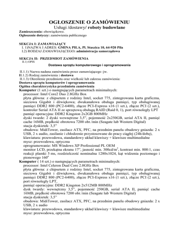 OGŁOSZENIE O ZAMÓWIENIU Usługi /dostawy/ roboty budowlane Zamieszczenia: obowiązkowe. Ogłoszenie dotyczy: zamówienia publicznego SEKCJA I: ZAMAWIAJĄCY I. 1)NAZWA I ADRES: GMINA PIŁA, Pl. Staszica 10, 64-920 Piła I.2) RODZAJ ZAMAWIAJĄCEGO: administracja samorządowa SEKCJA II: PRZEDMIOT ZAMÓWIENIA II.1) OPIS Dostawa sprzętu komputerowego i oprogramowania II.1.1) Nazwa nadana zamówieniu przez zamawiającego :jw. II.1.2) Rodzaj zamówienia : dostawa II.1.3) Określenie przedmiotu oraz wielkość lub zakresu zamówienia: Dostawa sprzętu komputerów i oprogramowania Ogólna charakterystyka przedmiotu zamówienia Komputer (1 szt.) o następujących parametrach minimalnych: processor: Intel Core2 Duo 2.8GHz Box płyta główna: z chipsetem z rodziny Intel, socket 775, zintegrowana karta graficzna, sieciowa Gigabit i dźwiękowa; dwukanałowa obsługa pamięci, typ obsługiwanej pamięci DDR2 800 (PC2-6400), złącze PCI-Express x16 (1 szt.), złącze PCI (2 szt.), kontroler Serial ATA II ze sprzętową obsługą RAID (Raid 0, 1), port równoległy LPT pamięć operacyjna: DDR2 Kingston 2x2GB 800MHz dyski twarde: 2 dyski wewnętrzne 3,5”, pojemność 2x250GB, serial ATA II, pamięć cache 16MB, prędkość obrotowa 7200 obr./min (Seagate lub Western Digital) stacja dyskietek: 3,5” obudowa: MidiTower, zasilacz ATX, PFC, na przednim panelu obudowy gniazda: 2 x USB, 2 x audio, zasilanie i chłodzenie przystosowane do pracy ciągłej (24h/dobę), klawiatura: przewodowa, standardowy układ klawiszy + klawisze multimedialne mysz: przewodowa, optyczna oprogramowanie: MS Windows XP Professional PL OEM monitor LCD, przekątna ekranu 17”, jasność min. 300cd/m2, kontrast min. 800:1, czas reakcji plamki 5 ms, rozdzielczość nominalna 1280x1024, kąt widzenia poziomego i pionowego 160o Komputer ( 14 szt.) o następujących parametrach minimalnych: processor: Intel Celeron Dual Core 2.0GHz Box płyta główna: z chipsetem z rodziny Intel, socket 775, zintegrowana karta graficzna, sieciowa Gigabit i dźwiękowa, dwukanałowa obsługa pamięci, typ obsługiwanej pamięci DDR2 800 (PC2-6400), złącze PCI-Express x16 (1 szt.), złącze PCI (2 szt.), port równoległy LPT, pamięć operacyjna: DDR2 Kingston 2x512MB 800MHz dysk twardy: wewnętrzny 3,5”, pojemność 250GB, serial ATA II, pamięć cache 16MB, prędkość obrotowa 7200 obr./min (Seagate lub Western Digital) stacja dyskietek: 3,5” obudowa: MidiTower, zasilacz ATX, PFC, na przednim panelu obudowy gniazda: 2 x USB, 2 x audio klawiatura: przewodowa, standardowy układ klawiszy + klawisze multimedialne mysz: przewodowa, optyczna oprogramowanie: MS Windows XP Professional PL OEM monitor LCD, przekątna ekranu 17”, jasność min. 300cd/m2, kontrast min. 800:1, czas reakcji plamki 5 ms, rozdzielczość nominalna 1280x1024, kąt widzenia poziomego i pionowego 160o Monitor (2 szt.): LCD, przekątna ekranu 17”, jasność min. 300cd/m2, kontrast min. 800:1, czas reakcji plamki 5 ms, rozdzielczość nominalna 1280x1024, kąt widzenia poziomego i pionowego 160o Drukarka laserowa ( 3 szt.) HP LaserJet P2014 lub równowaŜna o parametrach minimalnych: laserowa mono, format wydruków A4, rozdzielczość pionowa i pozioma 1200 dpi, normatywny cykl pracy do 10.000 str./mies., podajnik papieru na min. 150 kartek, bęben z zasobnikiem toneru stanowiący całość (wymiana w całości), standardowy język drukarki: HP PCL 5e, złącza zewnętrzne: USB 2.0, port równoległy zgodny z normą IEEE 1284, kabel sygnałowy IEEE 1284 w komplecie Drukarka igłowa 10” (1 szt.) OKI ML 3320 lub równowaŜna o parametrach minimalnych: drukarka igłowa mono, 9 igieł, wydruk na pojedynczych kartkach i na papierze ciągłym (do 4 kopii), długość wiersza (szerokość wydruku): 10 cali, szybkość druku DRAFT: 435 zn/s, polskie znaki w standardach: Mazovia, Latin 2 (codepage 852), Windows 1250, ISO 8859 Latin; emulacje: Epson FX, IBM ProPrinter, złącza zewnętrzne: Centronics (kabel sygnałowy w komplecie), Drukarka igłowa 15” (2 szt.) OKI ML 3321 lub równowaŜna o parametrach minimalnych: drukarka igłowa mono, 9 igieł, wydruk na pojedynczych kartkach i na papierze ciągłym (do 4 kopii), długość wiersza (szerokość wydruku): 15 cali, szybkość druku DRAFT: 435 zn/s, polskie znaki w standardach: Mazovia, Latin 2 (codepage 852), Windows 1250, ISO 8859 Latin; emulacje: Epson FX, IBM ProPrinter, złącza zewnętrzne: Centronics (kabel sygnałowy w komplecie), Urządzenie wielofunkcyjne (drukarka, skaner, kopiarka) laserowe mono (1 szt.) HP LaserJet M1522n MFP lub równowaŜne o parametrach minimalnych: drukarka laserowa mono, format wydruków A4, rozdzielczość pionowa i pozioma 600 dpi, normatywny cykl pracy do 8.000 str./mies., podajnik papieru na min. 150 kartek, bęben z zasobnikiem toneru stanowiący całość (wymiana w całości), standardowy język drukarki: HP PCL 6 i HP PCL 5, złącza zewnętrzne: USB 2.0, Ethernet 10/100Mbps (praca w sieci, wbudowany serwer wydruku), kabel sygnałowy USB 2.0 w komplecie, skaner płaski kolorowy, rozdzielczość optyczna 1200dpi, wbudowany automatyczny podajnik dokumentów przeznaczonych do skanowania, kopiarka mono, moŜliwość ustawienia liczby kopii, funkcja zmniejszania i powiększania kopii. Skaner A4 (3 szt.) Mustek BearPaw 2400 CU Plus II lub równowaŜny o parametrach minimalnych: skaner płaski formatu A4, kolorowy, jednoprzebiegowy, rozdzielczość optyczna 1200x2400dpi, dołączone oprogramowanie OCR, złącza zewnętrzne: USB 2.0 (kabel sygnałowy w komplecie), Skaner A3 (1 szt.) Mustek ScanExpress A3 USB 1200 Pro lub równowaŜny o parametrach minimalnych: skaner płaski formatu A3, kolorowy, rozdzielczość optyczna 1200x1200dpi, dołączone oprogramowanie OCR, złącza zewnętrzne: USB 2.0 (kabel sygnałowy w komplecie), Oprogramowanie Microsoft Office Small Business 2007 PL BOX (2 szt.) Oprogramowanie CorelDraw Graphics Suite 12 PL (1 szt.) Podane wyŜej parametry są wartościami