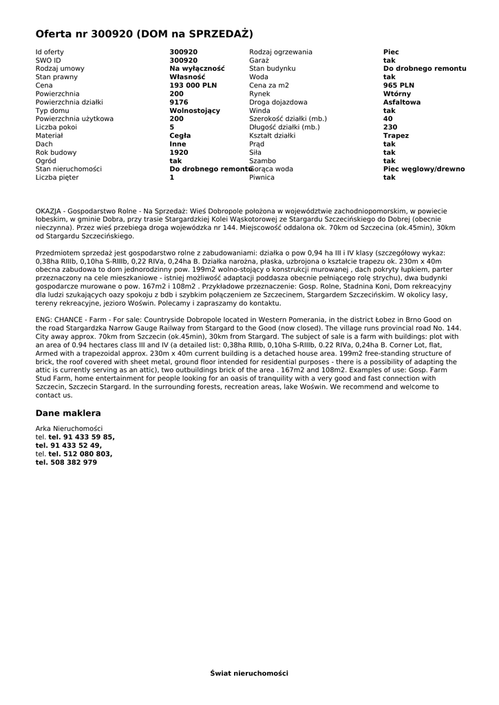 Oferta nr 300920 (DOM na SPRZEDAŻ) Id oferty SWO ID Rodzaj umowy Stan prawny Cena Powierzchnia Powierzchnia działki Typ domu Powierzchnia użytkowa Liczba pokoi Materiał Dach Rok budowy Ogród Stan nieruchomości Liczba pięter 300920 Rodzaj ogrzewania 300920 Garaż Na wyłączność Stan budynku Własność Woda 193 000 PLN Cena za m2 200 Rynek 9176 Droga dojazdowa Wolnostojący Winda 200 Szerokość działki (mb.) 5 Długość działki (mb.) Cegła Kształt działki Inne Prąd 1920 Siła tak Szambo Do drobnego remontu Gorąca woda 1 Piwnica Piec tak Do drobnego remontu tak 965 PLN Wtórny Asfaltowa tak 40 230 Trapez tak tak tak Piec węglowy/drewno tak OKAZJA - Gospodarstwo Rolne - Na Sprzedaż: Wieś Dobropole położona w województwie zachodniopomorskim, w powiecie łobeskim, w gminie Dobra, przy trasie Stargardzkiej Kolei Wąskotorowej ze Stargardu Szczecińskiego do Dobrej (obecnie nieczynna). Przez wieś przebiega droga wojewódzka nr 144. Miejscowość oddalona ok. 70km od Szczecina (ok.45min), 30km od Stargardu Szczecińskiego. Przedmiotem sprzedaż jest gospodarstwo rolne z zabudowaniami: działka o pow 0,94 ha III i IV klasy (szczegółowy wykaz: 0,38ha RIIIb, 0,10ha S-RIIIb, 0,22 RIVa, 0,24ha B. Działka narożna, płaska, uzbrojona o kształcie trapezu ok. 230m x 40m obecna zabudowa to dom jednorodzinny pow. 199m2 wolno-stojący o konstrukcji murowanej , dach pokryty łupkiem, parter przeznaczony na cele mieszkaniowe - istniej możliwość adaptacji poddasza obecnie pełniącego rolę strychu), dwa budynki gospodarcze murowane o pow. 167m2 i 108m2 . Przykładowe przeznaczenie: Gosp. Rolne, Stadnina Koni, Dom rekreacyjny dla ludzi szukających oazy spokoju z bdb i szybkim połączeniem ze Szczecinem, Stargardem Szczecińskim. W okolicy lasy, tereny rekreacyjne, jezioro Woświn. Polecamy i zapraszamy do kontaktu. ENG: CHANCE - Farm - For sale: Countryside Dobropole located in Western Pomerania, in the district Łobez in Brno Good on the road Stargardzka Narrow Gauge Railway from Stargard to the Good (now closed). The village runs provincial road No. 144. City away approx. 70km from Szczecin (ok.45min), 30km from Stargard. The subject of sale is a farm with buildings: plot with an area of 0.94 hectares class III and IV (a detailed list: 0,38ha RIIIb, 0,10ha S-RIIIb, 0.22 RIVa, 0,24ha B. Corner Lot, flat, Armed with a trapezoidal approx. 230m x 40m current building is a detached house area. 199m2 free-standing structure of brick, the roof covered with sheet metal, ground floor intended for residential purposes - there is a possibility of adapting the attic is currently serving as an attic), two outbuildings brick of the area . 167m2 and 108m2. Examples of use: Gosp. Farm Stud Farm, home entertainment for people looking for an oasis of tranquility with a very good and fast connection with Szczecin, Szczecin Stargard. In the surrounding forests, recreation areas, lake Woświn. We recommend and welcome to contact us. Dane maklera Arka Nieruchomości tel. tel. 91 433 59 85, tel. 91 433 52 49, tel. tel. 512 080 803, tel. 508 382 979 Świat nieruchomości Powered by TCPDF (www.tcpdf.org)