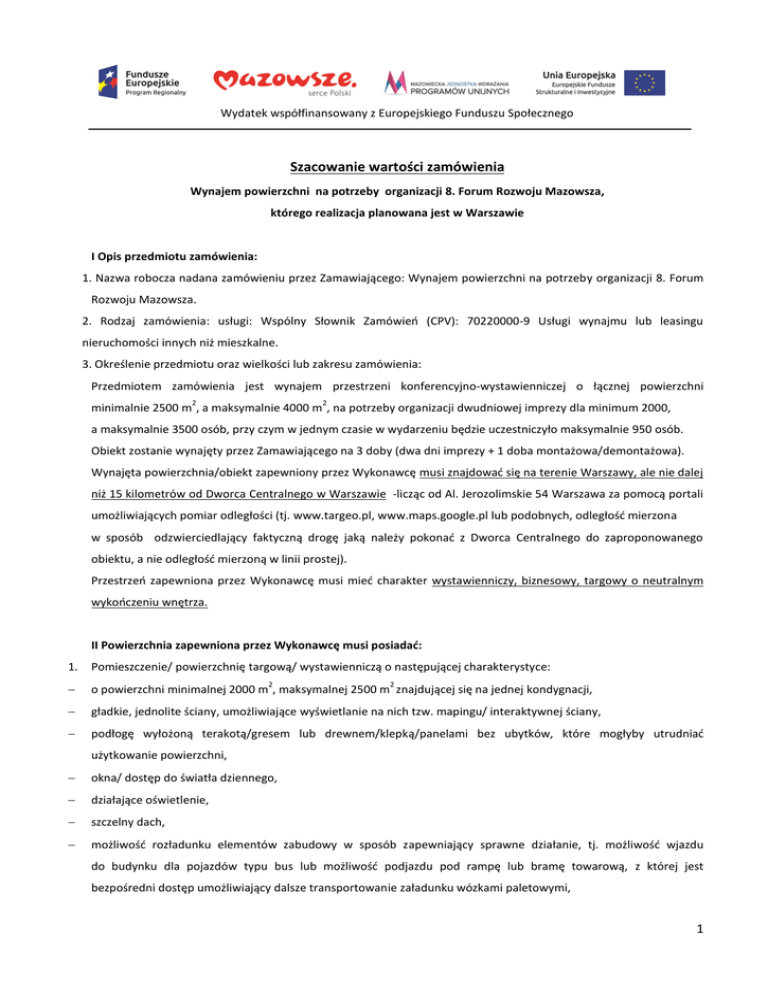 Wydatek współfinansowany z Europejskiego Funduszu Społecznego Szacowanie wartości zamówienia Wynajem powierzchni na potrzeby organizacji 8. Forum Rozwoju Mazowsza, którego realizacja planowana jest w Warszawie I Opis przedmiotu zamówienia: 1. Nazwa robocza nadana zamówieniu przez Zamawiającego: Wynajem powierzchni na potrzeby organizacji 8. Forum Rozwoju Mazowsza. 2. Rodzaj zamówienia: usługi: Wspólny Słownik Zamówień (CPV): 70220000-9 Usługi wynajmu lub leasingu nieruchomości innych niż mieszkalne. 3. Określenie przedmiotu oraz wielkości lub zakresu zamówienia: Przedmiotem zamówienia jest wynajem przestrzeni konferencyjno-wystawienniczej o łącznej powierzchni 2 2 minimalnie 2500 m , a maksymalnie 4000 m , na potrzeby organizacji dwudniowej imprezy dla minimum 2000, a maksymalnie 3500 osób, przy czym w jednym czasie w wydarzeniu będzie uczestniczyło maksymalnie 950 osób. Obiekt zostanie wynajęty przez Zamawiającego na 3 doby (dwa dni imprezy + 1 doba montażowa/demontażowa). Wynajęta powierzchnia/obiekt zapewniony przez Wykonawcę musi znajdować się na terenie Warszawy, ale nie dalej niż 15 kilometrów od Dworca Centralnego w Warszawie -licząc od Al. Jerozolimskie 54 Warszawa za pomocą portali umożliwiających pomiar odległości (tj. www.targeo.pl, www.maps.google.pl lub podobnych, odległość mierzona w sposób odzwierciedlający faktyczną drogę jaką należy pokonać z Dworca Centralnego do zaproponowanego obiektu, a nie odległość mierzoną w linii prostej). Przestrzeń zapewniona przez Wykonawcę musi mieć charakter wystawienniczy, biznesowy, targowy o neutralnym wykończeniu wnętrza. II Powierzchnia zapewniona przez Wykonawcę musi posiadać: 1. Pomieszczenie/ powierzchnię targową/ wystawienniczą o następującej charakterystyce: o powierzchni minimalnej 2000 m , maksymalnej 2500 m znajdującej się na jednej kondygnacji, gładkie, jednolite ściany, umożliwiające wyświetlanie na nich tzw. mapingu/ interaktywnej ściany, podłogę wyłożoną terakotą/gresem lub drewnem/klepką/panelami bez ubytków, które mogłyby utrudniać 2 2 użytkowanie powierzchni, okna/ dostęp do światła dziennego, działające oświetlenie, szczelny dach, możliwość rozładunku elementów zabudowy w sposób zapewniający sprawne działanie, tj. możliwość wjazdu do budynku dla pojazdów typu bus lub możliwość podjazdu pod rampę lub bramę towarową, z której jest bezpośredni dostęp umożliwiający dalsze transportowanie załadunku wózkami paletowymi, 1 dostęp do Internetu bezprzewodowego, w całej przestrzeni tj. minimalnie w salach konferencyjnych, na przestrzeni networkingowej, w holach w przestrzeni wystawienniczej. Minimalne wymagania dla łącza: odbieranie 30 Mb/s, wysyłanie 8 Mb/s). Uwaga: parametry łącza muszą umożliwiać sprawną obsługę prowadzonych jednocześnie dwóch streaming’ów oraz jednoczesne użytkowanie Wi-Fi przez przewidzianą liczbę uczestników. Uwaga: Wszystkie elementy wyposażenia technicznego (Internetu) muszą być ze sobą w pełni kompatybilne, a parametry techniczne muszą być dostosowane do warunków obiektu i sal konferencyjnych, wielkości wydarzenia, ilości uczestników przy założeniu jednoczesnego użytkowania łączy internetowych przez wszystkich uczestników jednocześnie oraz biorąc pod uwagę konieczność realizacji streamingu (z dwóch scen jednocześnie) itp. ogrzewanie jako stały element infrastruktury obiektu zapewniające ogrzanie obiektu/ przestrzeni i utrzymanie stałej temperatury minimalnej 21 stopni Celsjusza na całej wynajętej przestrzeni. 2. Pomieszczenie/ przestrzeń przeznaczona na potrzeby cateringu, które Zamawiający wykorzysta do wydawania posiłków dla minimum 300, a maksymalnie 400 osób (przy czym jednocześnie nie będzie to więcej jak 200 osób) o następującej charakterystyce: o powierzchni minimalnej 200 m , musi znajdować się w tym samym budynku co przestrzeń wystawiennicza, może znajdować się na innej kondygnacji, 2 ale przejście z przestrzeni wystawienniczej do tego pomieszczenia musi być możliwe bez konieczności wychodzenia z budynku, działające oświetlenie, estetyczna podłoga, czyste, jednolite ściany, preferowane pomieszczenie z dostępem do światła dziennego. wraz z pomieszczeniem stanowiącym zaplecze sanitarno-magazynowe dla firmy cateringowej, gdzie będzie możliwość magazynowania jedzenia oraz jego podgrzewania za pomocą podgrzewaczy elektrycznych i warników elektrycznych (bez konieczności gotowania). Zaplecze to musi mieć powierzchnię minimalną 50 m2 (dopuszcza się 2 mniejsze pomieszczenia lub jedną większą salę) oraz spełniać następujące warunki techniczne: o dostęp do wody bieżącej, o powierzchnia podłogi zmywalna lub z możliwością wyłożenia podłogi przez firmę cateringową folią zabezpieczającą, o klimatyzacja, o dostęp do energii elektrycznej- minimum 6 gniazd prądowych, o zapewnienie pojemników na odpady gastronomiczne Uwaga: wywóz oraz utylizacja odpadów gastronomicznych nie leży po stronie Wykonawcy i będzie realizowana niezależnie od tego zamówienia. 3. Trzy pomieszczenia przeznaczone dla Zamawiającego: na biuro oraz na magazyny, o następującej charakterystyce: odpowiednio o powierzchni minimalnej: 40 m , 25 m , 20 m , pomieszczenia te muszą znajdować się w tym samym budynku co pozostała zapewniona przestrzeń (mogą 2 2 2 znajdować się na innym piętrze niż przestrzeń wystawiennicza, ale przejście musi być możliwe bez konieczności wychodzenia z budynku), 2 podłoga wyłożona wykładziną dywanową lub terakotą lub podłoga drewniana, gładkie, jednolite ściany, z możliwością zamknięcia drzwi na klucz lub kartę dostępu lub pod stałym nadzorem ochrony. 4. Przestrzeń do zorganizowania rejestracji uczestników: miejsce w bezpośrednim sąsiedztwie wejścia do budynku, gdzie Zamawiający ustawi ladę/ lady recepcyjne umożliwiające dystrybucję pakiet