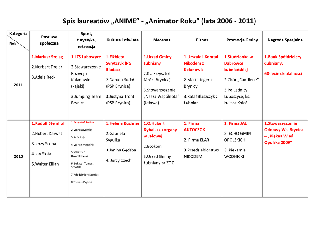Spis laureatów „ANIME” - „Animator Roku” (lata 2006 - 2011) Kategoria Rok Postawa społeczna 1.Mariusz Szeląg 1.LZS Luboszyce 2.Norbert Dreier 2.Stowarzszenie Rozwoju Kolanowic (kajaki) 3.Adela Reck 2011 1.Rudolf Steinhof 2.Hubert Karwat 2010 Sport, turystyka, rekreacja Kultura i oświata 1.Elżbieta Syrytczyk (PG Biadacz) 2.Danuta Sudoł (PSP Brynica) Mecenas 1.Urząd Gminy Łubniany 2.Ks. Krzysztof Mróz (Brynica) 3.Justyna Tront (PSP Brynica) 1.Krzysztof Rother 1.Helena Buchner 1.O.Hubert Dyballa za organy 2.Gabriela w Jełowej Sygulka 2.Ecokom 3.Janina Gędźba 3.Urząd Gminy 4. Jerzy Czech Łubniany za ZOZ 3.Rafał Leja 3.Jerzy Sosna 4.Marcin Medelnik 4.Jan Slota 5.Sebastian Dworakowski 5.Walter Kilian 6. Łukasz i Tomasz Sznotala 7.Włodzimierz Kumiec 8.Tomasz Dębski Promocja Gminy 1.Urszula i Konrad Nikodem z Kolanowic 1.Studzionka w Dąbrówce Łubniańskiej 2.Marta Jeger z Brynicy 2.Chór „Cantilene” 1. Firma AUTOCZOK 1. Firma JAL 3.Stowarzyszenie „Nasza Wspólnota” 3.Rafał Blaszczyk z (Jełowa) Łubnian 3.Jumping Team Brynica 2.Monika Mioska Biznes Nagroda Specjalna 1.Bank Spółdzielczy Łubniany, 60-lecie działalności 3.Po Lednicy – Luboszyce, ks. Łukasz Knieć 2. Firma ELAR 2. ECHO GMIN OPOLSKICH 3.Przedsiębiorstwo NIKODEM 3. Piekarnia WODNICKI 1.Stowarzyszenie Odnowy Wsi Brynica – „Piękna Wieś Opolska 2009” 1.CARITAS Łubniany 1.Jerzy Musiał 2.Władysław Grabowski (lekarz) 2.Krzysztof Rother 3.Ks. Józef Onyśków (Luboszyce) 4.Gabriela Holik (Jełowa) 2009 5.Mariusz Szeląg (Łubniany) 6.Sławomir Górka (Masów) 7.Katolickie Przedszkole im. Aniołów Stróżów w Luboszycach 1.Caritas Jełowa 2.OSP Łubniany 2008 3.Danuta Sudoł z Brynicy 4.Danuta Cimoszczyk z Luboszyc-prac.ZOZ 3.Piotr Cieślik 4.Jerzy Świec 5.Konrad Pietrek (sołtys Kępy) 1.Izba Regionalna z PG w Biadaczu 2.Miroslaw Malecki (Jełowa) 3.Jarosław Janicki (Masów) 4.Helena Plotnik (PSP Luboszyce) 5.Bogusława Domino-Pawelec (PSP Jełowa) 6.Gospodarstwo Agroturystyczne 6.Helena Buchner AGRORELAKS w (Jełowa) Brynicy 7.Zespół SILESIA 1.RUDATOM 1.STEGU (Jełowa) 2.SEGET Kolanowice 2.JAL (Kępa) 3.Zakład Hydrauliki Siłowej–Luboszyce 4.STEGU - Jełowa 5.HOLBUD Łubniany 6.ECOKOM Luboszyce 3.SEGET (Kolanowice) 4.Albert Wiench 5.RUDATOM (Kępa) 6.WIECZOREK – schody (Dąbrówka Łubniańska) 1.Łubniańskie Kominki 2.Gazeta BECZKA 3.Jarosław Janicki 4.Społeczność z Jełowej 5.Zespół SILESIA 6.Gabriela Dworakowska (PG Biadacz) 7.SOCHOR – tartak (Brynica) 2.Dariusz PaltŁubniany 3.CIS-Łubniany 1.”Gałganek” – Ewa Sitarz 2.GBP Łubniany Urszula Polok 3.Plecenie koron– Gabriela Holik 2.Piotr Badura 3.Władysław Grabowski 4.Abp Wilhelm Kurc z Nowej Gwinei poch. z Kępy 5.Ks. Helmut Piechota 6.Helena Buchner („Hanyska”) 7.Engelbert Strzys (przew. DFK) 8.Gabriela DenderaCzurlok-muzyk z Jełowej 1.Joachim ŚwiercŁubniany 1.Bernard Holik 8.Joannna Patrzek (DFK Brynica) 1.Bank Spółdzielczy - Łubniany 2.Firma STEGU – Jełowa 3.Firma REMAL – Dąbrówka Łubniańska 1.”Dziatki, Starki, Jagatki” 2.”Rudatom”-Kępa 3.”Łubniańskie Kominki” 1.Społeczność Wsi Jełowa 2007 – „Nasza Wspólnota” 2.Piotr Sosna z Brynicy 2007 1.Barbara i Henryk 1.Adam Szesny Kuhnowie z z Kolanowic Jełowej 2.Dominika 2.Danuta Sówka z Brynicy Cimoszczyk z 3.Marcin Sossna Luboszyc (Klub Sportowy 3.Rudolf Steinhof „Śląsk (sołtys z Luboszyc) Łubniany”) 1.Sabina Karwat – twórczyni z Jełowej 1.Helmut Piechota 1.Zofia Wilczek 2.Gabriela Dendera-Czurlok – muzyk z Jełowej 2.Firma AUTOCZOK z Kępy 2006 4.Barbara Pilśniak 1.ZOFMAR – Kępa 1.Zespół SILESIA 2.Krystyna i Józef Duda 2.”Łubniańskie Kominki” 3.Jan Długosz z Luboszyc 5.Jarosław Janicki 4.Roman Dudek z Biadacza 4.Parafialny Zespół CARITAS Łubniany 6.Ewa Sitarz 5.Dariusz Sznotala – RUDATOM Kępa 5.Ryszard Trocha – OSP Łubniany - 3.Klub Sportowy ”Ślask Łubniany” 3.Mariusz Szeląg 7.Gabriela Holik 1. O. Henryk Kałuża z Brynicy (misjonarz) 3.Restauracja BERPOL - Brynica 3.Danuta Zalewska 2.Wendelin Sosna 1.Klub Sportowy ”Śląsk”- Łubniany 2.Bank SpółdzielczyŁubniany 3.Firma HOLBUD z Łubnian 3.Katarzyna Janas – dyrektor PSP w Brynicy 2.Urszula Marcinkowska 1.Dieter Wystub 1.Firma FILA z Dąbrówki Łubniańskiej 4.Gazeta „BECZKA” 6.Bernard Koc 8.Gabriela Dworakowska 9.Joanna Patrzek Rok Postawa społeczna Sport, turystyka, Kategoria rekreacja 7.Kazimierz Górka z Masowa Mecenas Kultura i oświata Promocja Gminy Biznes Nagroda Specjalna