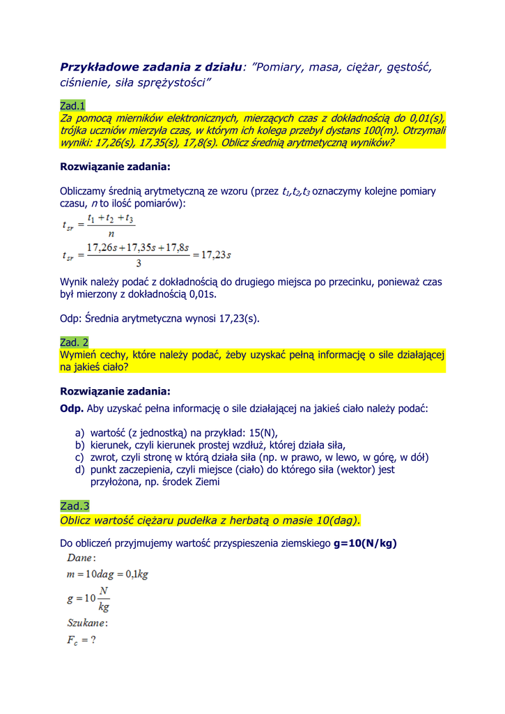 Przykładowe zadania z działu: ”Pomiary, masa, ciężar, gęstość, ciśnienie, siła sprężystości” Zad.1 Za pomocą mierników elektronicznych, mierzących czas z dokładnością do 0,01(s), trójka uczniów mierzyła czas, w którym ich kolega przebył dystans 100(m). Otrzymali wyniki: 17,26(s), 17,35(s), 17,8(s). Oblicz średnią arytmetyczną wyników? Rozwiązanie zadania: Obliczamy średnią arytmetyczną ze wzoru (przez t1,t2,t3 oznaczymy kolejne pomiary czasu, n to ilość pomiarów): Wynik należy podać z dokładnością do drugiego miejsca po przecinku, ponieważ czas był mierzony z dokładnością 0,01s. Odp: Średnia arytmetyczna wynosi 17,23(s). Zad. 2 Wymień cechy, które należy podać, żeby uzyskać pełną informację o sile działającej na jakieś ciało? Rozwiązanie zadania: Odp. Aby uzyskać pełna informację o sile działającej na jakieś ciało należy podać: a) b) c) d) wartość (z jednostką) na przykład: 15(N), kierunek, czyli kierunek prostej wzdłuż, której działa siła, zwrot, czyli stronę w którą działa siła (np. w prawo, w lewo, w górę, w dół) punkt zaczepienia, czyli miejsce (ciało) do którego siła (wektor) jest przyłożona, np. środek Ziemi Zad.3 Oblicz wartość ciężaru pudełka z herbatą o masie 10(dag). Do obliczeń przyjmujemy wartość przyspieszenia ziemskiego g=10(N/kg) Skorzystamy ze wzoru na ciężar ciała: Podstawiamy do wzoru wartości liczbowe i obliczamy ciężar. Pamiętamy, że jednostką ciężaru jest niuton (N) Odp. Ciężar pudełka z herbatą wynosi 1(N). Zad.4 Oblicz masę plecaka przyciąganego przez Ziemie siłą wartości 60(N). Rozwiązanie zadania: Do obliczeń przyjmujemy wartość przyspieszenia ziemskiego g=10(N/kg). Skorzystamy ze wzoru na ciężar ciała: Przekształcamy ten wzór tak, aby obliczyć masę m.- dzielimy obustronnie przez g Odwracamy stronami i podstawiamy dane: Odp. Masa plecaka wynosi 6(kg). Zad.5 Zmierz ciężar dowolnie wybranego batonika. Na tej podstawie oblicz jego masę. Rozwiązanie zadania: Odp. Ciężar batonika mierzymy w (N) za pomocą siłomierza. Następnie obliczamy jego masę, pamiętając, że przyspieszenie ziemskie w przybliżeniu wynosi 10(N/kg). Przy obliczeniach skorzystamy ze wzoru na ciężar, który przekształcamy tak, aby wyznaczyć szukaną masę m Podstawiamy wartości liczbowe i obliczamy masę w kilogramach. Z opakowania batonika odczytujemy masę. Zamieniamy jednostki odczytanej masy na kilogramy i porównujemy z obliczoną masą, która też wyraziliśmy w kilogramach. Zad.6 Na sprężynie zawieszono odważnik o masie 50(g). Na skutek tego sprężyna wydłużyła się o 0,5(cm). Oblicz wydłużenie sprężyny w przypadku, gdy zawiesimy na niej odważnik 0,2(kg). Rozwiązanie zadania: Wskazówka: Zapiszemy dane i wykonamy rysunek poglądowy Siła wydłużenia sprężyny odpowiada wartości ciężaru ciał m1 i m2 . Wyznaczymy wartości tych ciężarów korzystając ze wzoru na ciężar: Pamiętajmy, że aby obliczyć ciężar musimy wyrazić w (kg) i znać stalą g. Dla Ziemi wynosi ona g=10(kg/N). Podstawiamy do wzoru wartości liczbowe: Wiemy, że przyrost długości sprężyny, czyli jej wydłużenie jest wprost proporcjonalne do wartości działającej siły. Jeżeli siła F1 o wartości 0,5(N) wydłuża sprężynę o x1=0,5(cm), to siła cztery razy większa siła F2 o wartości 2(N) wydłuża sprężynę o x2 cztery razy więcej, czyli o 2(cm). Można to obliczyć za pomocą proporcji: F1 - x1 F2 - x2 Odp. Gdy zawiesimy na sprężynie odważnik o masie 0,2(kg), to wydłuży się ona o 2(cm). Zad.7 Na wadze łazienkowej stanął mężczyzna o masie 80(kg), powodując ściśnięcie (skrócenie) sprężyny w tej wadze o 1(cm). Oblicz skrócenie sprężyny tej wagi, jeżeli stanie na wadze dziecko o masie 20(kg). Rozwiązanie zadania: Zapiszemy dane i szukane oraz wykonamy rysunek pomocniczy: W obu przypadkach sprężyna uległa skróceniu pod wpływem siły ciężkości mężczyzny i dziecka. W pierwszej kolejności obliczymy ciężar mężczyzny a potem dziecka. Wiemy, że stała g=10(N/kg). Korzystamy ze wzoru na ciężar ciała: Wiemy, że skrócenie sprężyny jest wprost proporcjonalne do wartości działającej siły, a w tym przypadku do ciężaru mężczyzny oraz dziecka. Jeżeli siłą 800(N) powoduje skrócenie sprężyny o 1(cm), to siła cztery razy mniejsza, czyli 200(N) powoduje skrócenie cztery razy mniejsze, czyli o 0,25(cm). Można to obliczyć z proporcji: F1 - x1 F2 - x2 Odp. Jeżeli na wadze stanie dziecko, to sprężyna skróci się o 0,25cm. Zad.8 Wiemy, że 1(cm3) wody ma masę 1(g). Opisz jak odmierzyć 20(g) wody za pomocą menzurki z podziałką. Rozwiązanie zadania Wskazówka: Gęstość dowolnej substancji obliczamy ze wzoru: czyli musimy znać masę i objętość tej substancji. Potrzebne przyrządy - waga laboratoryjna lub kuchenna - menzurka Należy wykonać kolejne czynności: 1. 2. 3. 4. ważymy pustą menzurkę, nalewamy wody do menzurki, ważymy menzurkę z wodą, obliczamy masę nalanej wody, czyli od masy wyznaczonej w podpunkcie (3) odejmujemy masę wyznaczona w podpunkcie (2), czyli m=m2 -m1 , 5. odczytujemy objętość nalanej wody V , 6. obliczamy gęstość ze wzoru: Zad.9 Wykonując odpowiednie obliczenia, wyraź w (kg/m3) gęstość złota równą 19,3(g/cm3). Rozwiązanie zadania Wskazówka: Wiemy, że Zamieniamy jednostki: Zad.10 Wykonując odpowiednie obliczenia, wyraź gęstość nafty równą 810(kg/m3) w (g/cm3). Rozwiązanie zadania Wskazówka: Wiemy, że Zamieniamy jednostki: Zad.11 Na wadze laboratoryjnej zważono pusta menzurkę. Jej masa wynosi 0,25(kg). Do menzurki wlano 150(cm3) cieczy i ponownie menzurkę zważono. Teraz masa jest równa 0,388(kg). Oblicz gęstość cieczy wlanej do menzurki? Na podstawie tabeli gęstości cieczy sprawdź jaka to mogła być ciecz. Rozwiązanie zadania Zapiszemy dane i szukane: Wyznaczamy masę cieczy wlanej do menzurki: Obliczamy gęstość ci