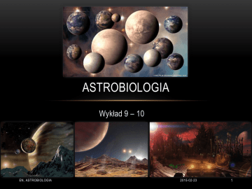 ASTROBIOLOGIA Wykład 9 – 10 EN, ASTROBIOLOGIA 2015-02-23 1 BIOSYGNATURY EN, ASTROBIOLOGIA 2015-02-23 2 BIOSYGNATURA: DEFINICJA • Biosygnatura – wskaźnik występowania na obiekcie organizmów żywych; ślady pozostawione przez organizmy żywe w środowisku. • Rodzaje biosygnatur: • Biosygnatury lokalne (skamieniałości, pozostałości organizmów żywych w skałach, składniki chemiczne, etc.); • Biosygnatury globalne (skala planetarna) – obserwowane w atmosferze lub na powierzchni planety. EN, ASTROBIOLOGIA 2015-02-23 3 BIOSYGNATURA: DEFINICJA Kategoria Definicja Przykłady I Obecność wody, dostępność energii i występowanie składników organicznych (obserwacje bezpośrednie); Ziemia II Dowody na występowanie wody obecnie lub w przeszłości, dostępność energii, występowanie składników organicznych (obserwacje pośrednie); Mars, Europa III Warunki ekstremalne, dowody na występowanie źródła energii, skomplikowanych związków chemicznych i/lub wody – być może odpowiednie dla organizmów żywych nieznanych na Ziemi (ekstremofile); Tytan, Tryton, Enceladus, Wenus? IV Ewentualne występowanie życia bardzo odmiennego od ziemskiego, izolowane habitaty, lub występowanie życia w przeszłości; Merkury, Jowisz? V Warunki niekorzystne, występowanie życia – nierealistyczne Słońce, Księżyc EN, ASTROBIOLOGIA 2015-02-23 4 CZY NA ZIEMI JEST ŻYCIE? SPEKTROSKOPIA PLANETY ZIEMIA EN, ASTROBIOLOGIA 2015-02-23 5 EN, ASTROBIOLOGIA 2015-02-23 6 SPEKTROSKOPIA PLANETY ZIEMIA • Spektroskopia, analiza widma promieniowania: informacje o budowie i składzie chemicznym atmosfery i powierzchni Ziemi; niektóre cechy widmowe świadczą o obecności organizmów żywych; • Obserwacje spektroskopowe w części widzialnej i podczerwieni: Galileo (1993), Mars Global Surveyor (1996), Mars Express; Venus Express, obserwacje z powierzchni Ziemi. EN, ASTROBIOLOGIA Część widzialna i podczerwień: Galileo 2015-02-23 7 SPEKTROSKOPIA PLANETY ZIEMIA EN, ASTROBIOLOGIA 2015-02-23 8 SPEKTROSKOPIA PLANETY ZIEMIA Widma promieniowania Ziemi w części widzialnej: • Rozpraszanie Rayleigha: 𝜎𝑅𝑆 2𝜋 5 𝑑 6 𝑛2 − 1 = 3 𝜆4 𝑛 2 + 2 2 𝜎𝑅𝑆 – przekrój czynny na rozpraszanie; 𝑑 – rozmiar cząsteczki; 𝜆 – długość fali; 𝑛 – współczynnik załamania światła cząsteczki; • Biosygnatury w części widzialnej: H 2O, O2, O3 w atmosferze EN, ASTROBIOLOGIA 2015-02-23 9 SPEKTROSKOPIA PLANETY ZIEMIA Widmo w części podczerwonej: • Obserwacje z powierzchni Ziemi: 12m; Mars Express OMEGA – obserwacje o niskiej rozdzielczości w V i NIR; molekularne widmo w NIR: O 2, H2O, CO2, CH4, N2O, O3; • Obserwacje FIR: Mars Global Surveyor (TES); pierwsze globalne widmo Ziemi. EN, ASTROBIOLOGIA 2015-02-23 10 SPEKTROSKOPIA PLANETY ZIEMIA • Widmo IR: termiczne emisyjne widmo Ziemi, temperatura ~290 K; pasma molekularne: CO2, H2O, O3, CH4 i inne; • Centrum pasma CO 2 – niska stratosfera, 650-700 cm-1 – tropopauza, dalej troposfera i powierzchnia. EN, ASTROBIOLOGIA 2015-02-23 11 SPEKTROSKOPIA PLANETY ZIEMIA Widmo transmisyjne – planeta przechodzi przed gwiazdą, część światła gwiazdy przechodzi przez atmosferę planety, stąd informacje o składzie chemicznym atmosfery planety; jedyna metoda badania atmosfer planet pozasłonecznych; Widmo transmisyjne Ziemi: obserwacje światła odbitego od Księżyca podczas zaćmienia Księżyca (odpowiada to sytuacji podczas tranzytu planety) absorbcja promieniowania ugięcie promieni słonecznych w atmosferze; absorbcja promieniowania EN, ASTROBIOLOGIA 2015-02-23 12 SPEKTROSKOPIA PLANETY ZIEMIA Widmo transmisyjne Ziemi: • Obserwacje od 1914, pierwsze widmo w części V i IR: zaćmienie 16 sierpnia 2008 roku; • Widmo transmisyjne Ziemi jest czerwone (promieniowanie krótkofalowe + długa droga w atmosferze, zaćmienia Księżyca; rozpraszanie Rayleigha – większe rozpraszanie na krótszych długościach fal); widmo odbiciowe – niebieskie; • Widmo transmisyjne: obserwacje podczas tranzytu; widmo odbiciowe: izolowane widmo planety; EN, ASTROBIOLOGIA Rysunek: widmo transmisyjne (czarne) i odbiciowe (niebieskie) Ziemi; podstawowa różnica: kontinuum; widmo odbiciowe – pasma molekularne słabsze lub zanikają. 2015-02-23 13 SPEKTROSKOPIA PLANETY ZIEMIA Pasma molekularne: • Interesujące pasmo – N2 (1.26nm) – zderzenia O2 ∙ O2 , O2 ∙ N2 , pasma 0.69, 0.76, 1.06, 1.26nm – do wyliczenia gęstości kolumnowej N 2; • Silne pasma dimerów – dimery atmosferyczne mogą być poszukiwane w widmach planet pozasłonecznych; (dimery – najprostsze oligomery. Składają się tylko z dwóch elementów łańcucha; są efektem połączenia dwóch jednakowych cząsteczek). EN, ASTROBIOLOGIA 2015-02-23 14 CZY NA ZIEMI JEST ŻYCIE? BIOSYGNATURY EN, ASTROBIOLOGIA 2015-02-23 15 BIOSYGNATURY GLOBALNE ZIEMI CO2, H2O i O3 w atmosferze – potrójny odcisk palców; O2 – pochodzenie biologiczne i niebiologiczne • Tlen łatwo wchodzi w reakcje, obecny w atmosferze, ponieważ jest nieustannie produkowany w procesach geologicznych i biologicznych (fotosynteza, rozkład materii organicznej w osadach morskich); • Tlen może powstawać również w procesach niebiologicznych – np. fotodysocjacja pary wodnej w atmosferze pod wpływem promieniowania UV – wodór ucieka z atmosfery, tlen w niej pozostaje (np. nieograniczony efekt cieplarniany, planety typu Wenus). EN, ASTROBIOLOGIA 2015-02-23 16 BIOSYGNATURY GLOBALNE ZIEMI EN, ASTROBIOLOGIA • Występowanie tlenu wysoko w atmosferze może też być wynikiem hamowania procesów obniżających zawartość tlenu (np. Mars – tlen nie wchodzi w reakcje endotermiczne z powodu niskich temperatur + brak H 2, który mógłby zmniejszyć obfitość tlenu). • Występowanie tlenu w atmosferach planet typu ziemskiego, na powierzchniach których może występować woda w stanie ciekłym jest silną wskazówką powstawania tlenu w procesach biologicznych (fotosynteza