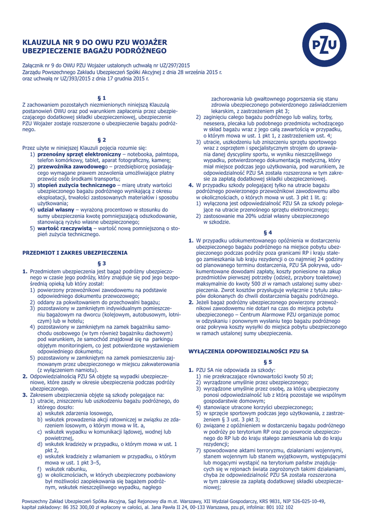 KLAUZULA NR 9 DO OWU PZU WOJAŻER UBEZPIECZENIE BAGAŻU PODRÓŻNEGO Załącznik nr 9 do OWU PZU Wojażer ustalonych uchwałą nr UZ/297/2015 Zarządu Powszechnego Zakładu Ubezpieczeń Spółki Akcyjnej z dnia 28 września 2015 r. oraz uchwałą nr UZ/393/2015 z dnia 17 grudnia 2015 r. §1 Z zachowaniem pozostałych niezmienionych niniejszą Klauzulą postanowień OWU oraz pod warunkiem zapłacenia przez ubezpieczającego dodatkowej składki ubezpieczeniowej, ubezpieczenie PZU Wojażer zostaje rozszerzone o ubezpieczenie bagażu podróżnego. §2 Przez użyte w niniejszej Klauzuli pojęcia rozumie się: 1) przenośny sprzęt elektroniczny – notebooka, palmtopa, telefon komórkowy, tablet, aparat fotograficzny, kamerę; 2) przewoźnika zawodowego – przedsiębiorcę posiadającego wymagane prawem zezwolenia umożliwiające płatny przewóz osób środkami transportu; 3) stopień zużycia technicznego – miarę utraty wartości ubezpieczonego bagażu podróżnego wynikającą z okresu eksploatacji, trwałości zastosowanych materiałów i sposobu użytkowania; 4) udział własny – wyrażoną procentowo w stosunku do sumy ubezpieczenia kwotę pomniejszającą odszkodowanie, stanowiącą ryzyko własne ubezpieczonego; 5) wartość rzeczywistą – wartość nową pomniejszoną o stopień zużycia technicznego. PRZEDMIOT I ZAKRES UBEZPIECZENIA §3 1. Przedmiotem ubezpieczenia jest bagaż podróżny ubezpieczonego w czasie jego podróży, który znajduje się pod jego bezpośrednią opieką lub który został: 1) powierzony przewoźnikowi zawodowemu na podstawie odpowiedniego dokumentu przewozowego; 2) oddany za pokwitowaniem do przechowalni bagażu; 3) pozostawiony w zamkniętym indywidualnym pomieszczeniu bagażowym na dworcu (kolejowym, autobusowym, lotniczym) lub w hotelu; 4) pozostawiony w zamkniętym na zamek bagażniku samochodu osobowego (w tym również bagażniku dachowym) pod warunkiem, że samochód znajdował się na parkingu objętym monitoringiem, co jest potwierdzone wystawieniem odpowiedniego dokumentu; 5) pozostawiony w zamkniętym na zamek pomieszczeniu zajmowanym przez ubezpieczonego w miejscu zakwaterowania (z wyłączeniem namiotu). 2. Odpowiedzialnością PZU SA objęte są wypadki ubezpieczeniowe, które zaszły w okresie ubezpieczenia podczas podróży ubezpieczonego. 3. Zakresem ubezpieczenia objęte są szkody polegające na: 1) utracie, zniszczeniu lub uszkodzeniu bagażu podróżnego, do którego doszło: a) wskutek zdarzenia losowego, b) wskutek prowadzenia akcji ratowniczej w związku ze zdarzeniem losowym, o którym mowa w lit. a, c) wskutek wypadku w komunikacji lądowej, wodnej lub powietrznej, d) wskutek kradzieży w przypadku, o którym mowa w ust. 1 pkt 2, e) wskutek kradzieży z włamaniem w przypadku, o którym mowa w ust. 1 pkt 3–5, f) wskutek rabunku, g) w okolicznościach, w których ubezpieczony pozbawiony był możliwości zaopiekowania się bagażem podróżnym, wskutek nieszczęśliwego wypadku, nagłego zachorowania lub gwałtownego pogorszenia się stanu zdrowia ubezpieczonego potwierdzonego zaświadczeniem lekarskim, z zastrzeżeniem pkt 3; 2) zaginięciu całego bagażu podróżnego lub walizy, torby, nesesera, plecaka lub podobnego przedmiotu wchodzącego w skład bagażu wraz z jego całą zawartością w przypadku, o którym mowa w ust. 1 pkt 1, z zastrzeżeniem ust. 4; 3) utracie, uszkodzeniu lub zniszczeniu sprzętu sportowego wraz z osprzętem i specjalistycznym strojem do uprawiania danej dyscypliny sportu, w wyniku nieszczęśliwego wypadku, potwierdzonego dokumentacją medyczną, który miał miejsce podczas jego użytkowania, pod warunkiem, że odpowiedzialność PZU SA została rozszerzona w tym zakresie za zapłatą dodatkowej składki ubezpieczeniowej. 4. W przypadku szkody polegającej tylko na utracie bagażu podróżnego powierzonego przewoźnikowi zawodowemu albo w okolicznościach, o których mowa w ust. 3 pkt 1 lit. g: 1) wyłączona jest odpowiedzialność PZU SA za szkody polegające na utracie przenośnego sprzętu elektronicznego; 2) zastosowanie ma 20% udział własny ubezpieczonego w szkodzie. §4 1. W przypadku udokumentowanego opóźnienia w dostarczeniu ubezpieczonego bagażu podróżnego na miejsce pobytu ubezpieczonego podczas podróży poza granicami RP i kraju stałego zamieszkania lub kraju rezydencji o co najmniej 24 godziny od planowanego terminu dostarczenia, PZU SA pokrywa, udokumentowane dowodami zapłaty, koszty poniesione na zakup przedmiotów pierwszej potrzeby (odzież, przybory toaletowe) maksymalnie do kwoty 500 zł w ramach ustalonej sumy ubezpieczenia. Zwrot kosztów przysługuje wyłącznie z tytułu zakupów dokonanych do chwili dostarczenia bagażu podróżnego. 2. Jeżeli bagaż podróżny ubezpieczonego powierzony przewoźnikowi zawodowemu nie dotarł na czas do miejsca pobytu ubezpieczonego – Centrum Alarmowe PZU organizuje pomoc w odzyskaniu i ponownym wysłaniu tego bagażu podróżnego oraz pokrywa koszty wysyłki do miejsca pobytu ubezpieczonego w ramach ustalonej sumy ubezpieczenia. WYŁĄCZENIA ODPOWIEDZIALNOŚCI PZU SA §5 1. PZU SA nie odpowiada za szkody: 1) nie przekraczające równowartości kwoty 50 zł; 2) wyrządzone umyślnie przez ubezpieczonego; 3) wyrządzone umyślnie przez osobę, za którą ubezpieczony ponosi odpowiedzialność lub z którą pozostaje we wspólnym gospodarstwie domowym; 4) stanowiące utracone korzyści ubezpieczonego; 5) w sprzęcie sportowym podczas jego użytkowania, z zastrzeżeniem § 3 ust. 3 pkt 3; 6) związane z opóźnieniem w dostarczeniu bagażu podróżnego w podróży po terytorium RP oraz po powrocie ubezpieczonego do RP lub do kraju stałego zamieszkania lub do kraju rezydencji; 7) spowodowane aktami terroryzmu, działaniami wojennymi, stanem wojennym lub stanem wyjątkowym, występującymi lub mogącymi wystąpić na terytorium państw znajdujących się w rejonach świata zagrożonych takimi działaniami, chyba że odpowiedzial