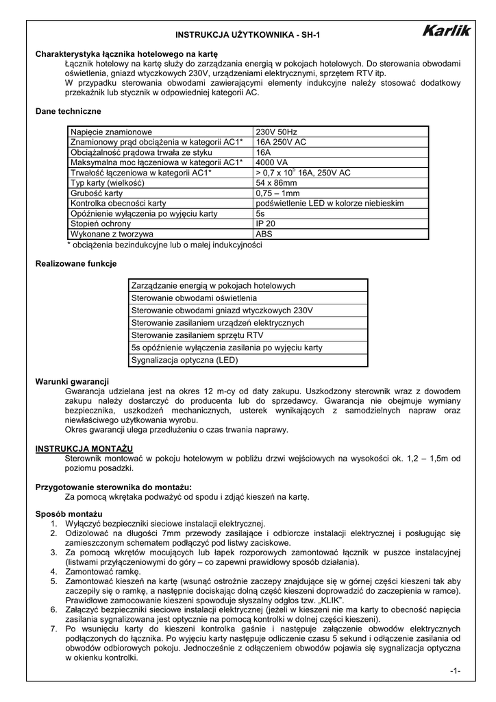 INSTRUKCJA UŻYTKOWNIKA - SH-1 Charakterystyka łącznika hotelowego na kartę Łącznik hotelowy na kartę służy do zarządzania energią w pokojach hotelowych. Do sterowania obwodami oświetlenia, gniazd wtyczkowych 230V, urządzeniami elektrycznymi, sprzętem RTV itp. W przypadku sterowania obwodami zawierającymi elementy indukcyjne należy stosować dodatkowy przekaźnik lub stycznik w odpowiedniej kategorii AC. Dane techniczne Napięcie znamionowe 230V 50Hz Znamionowy prąd obciążenia w kategorii AC1* 16A 250V AC Obciążalność prądowa trwała ze styku 16A Maksymalna moc łączeniowa w kategorii AC1* 4000 VA 5 Trwałość łączeniowa w kategorii AC1* > 0,7 x 10 16A, 250V AC Typ karty (wielkość) 54 x 86mm Grubość karty 0,75 – 1mm Kontrolka obecności karty podświetlenie LED w kolorze niebieskim Opóźnienie wyłączenia po wyjęciu karty 5s Stopień ochrony IP 20 Wykonane z tworzywa ABS * obciążenia bezindukcyjne lub o małej indukcyjności Realizowane funkcje Zarządzanie energią w pokojach hotelowych Sterowanie obwodami oświetlenia Sterowanie obwodami gniazd wtyczkowych 230V Sterowanie zasilaniem urządzeń elektrycznych Sterowanie zasilaniem sprzętu RTV 5s opóźnienie wyłączenia zasilania po wyjęciu karty Sygnalizacja optyczna (LED) Warunki gwarancji Gwarancja udzielana jest na okres 12 m-cy od daty zakupu. Uszkodzony sterownik wraz z dowodem zakupu należy dostarczyć do producenta lub do sprzedawcy. Gwarancja nie obejmuje wymiany bezpiecznika, uszkodzeń mechanicznych, usterek wynikających z samodzielnych napraw oraz niewłaściwego użytkowania wyrobu. Okres gwarancji ulega przedłużeniu o czas trwania naprawy. INSTRUKCJA MONTAŻU Sterownik montować w pokoju hotelowym w pobliżu drzwi wejściowych na wysokości ok. 1,2 – 1,5m od poziomu posadzki. Przygotowanie sterownika do montażu: Za pomocą wkrętaka podważyć od spodu i zdjąć kieszeń na kartę. Sposób montażu 1. Wyłączyć bezpieczniki sieciowe instalacji elektrycznej. 2. Odizolować na długości 7mm przewody zasilające i odbiorcze instalacji elektrycznej i posługując się zamieszczonym schematem podłączyć pod listwy zaciskowe. 3. Za pomocą wkrętów mocujących lub łapek rozporowych zamontować łącznik w puszce instalacyjnej (listwami przyłączeniowymi do góry – co zapewni prawidłowy sposób działania). 4. Zamontować ramkę. 5. Zamontować kieszeń na kartę (wsunąć ostrożnie zaczepy znajdujące się w górnej części kieszeni tak aby zaczepiły się o ramkę, a następnie dociskając dolną część kieszeni doprowadzić do zaczepienia w ramce). Prawidłowe zamocowanie kieszeni spowoduje słyszalny odgłos tzw. „KLIK”. 6. Załączyć bezpieczniki sieciowe instalacji elektrycznej (jeżeli w kieszeni nie ma karty to obecność napięcia zasilania sygnalizowana jest optycznie na pomocą kontrolki w dolnej części kieszeni). 7. Po wsunięciu karty do kieszeni kontrolka gaśnie i następuje załączenie obwodów elektrycznych podłączonych do łącznika. Po wyjęciu karty następuje odliczenie czasu 5 sekund i odłączenie zasilania od obwodów odbiorowych pokoju. Jednocześnie z odłączeniem obwodów pojawia się sygnalizacja optyczna w okienku kontrolki. -1- Tabela usterek Rodzaj usterki Dodatkowe informacje Łącznik nie Sygnalizacja optyczna działa LED – nie świeci Łącznik nie działa Sygnalizacja optyczna LED - świeci Możliwa przyczyna Brak napięcia zasilającego Złe podłączenie łącznika (odwrotne podłączenie przewodów zasilających i odbiorczych) Brak karty w kieszeni łącznika Karta nieprawidłowo lub zbyt mało wsunięta w kieszeń łącznika Źle zamontowania kieszeń na kartę łącznika (brak oddziaływania karty na układ elektryczny) Uszkodzenie układu elektrycznego łącznika Wykonać czynności Sprawdzić bezpieczniki instalacji elektrycznej Wykonać poprawne podłączenie przewodów zgodnie ze schematem elektrycznym Wsunąć kartę w kieszeń łącznika Sprawdzić poprawność wysunięcia karty – wsunąć kartę do momentu wyczuwalnego oporu Poprawić mocowanie kieszeni łącznika wg instrukcji montażu Przekazać łącznik do serwisu Schemat elektryczny -2-