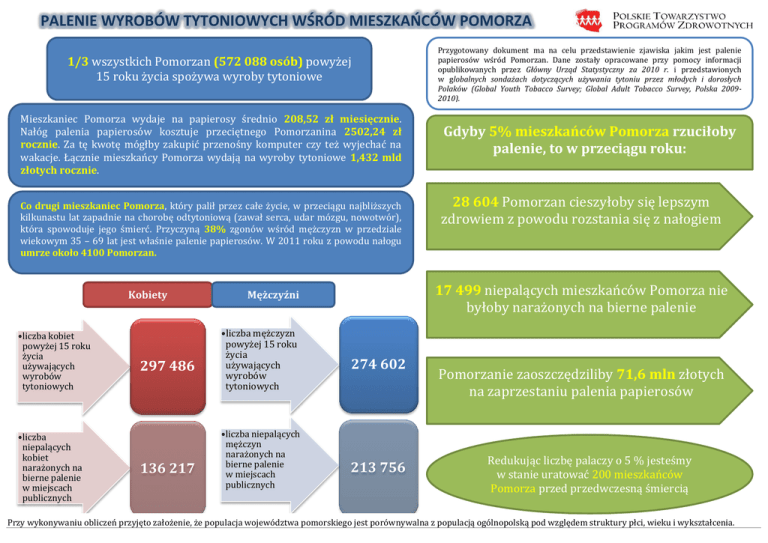 PALENIE WYROBÓW TYTONIOWYCH WŚRÓD MIESZKAŃCÓW POMORZA 1/3 wszystkich Pomorzan (572 088 osób) powyżej 15 roku życia spożywa wyroby tytoniowe Mieszkaniec Pomorza wydaje na papierosy średnio 208,52 zł miesięcznie. Nałóg palenia papierosów kosztuje przeciętnego Pomorzanina 2502,24 zł rocznie. Za tę kwotę mógłby zakupić przenośny komputer czy też wyjechać na wakacje. Łącznie mieszkańcy Pomorza wydają na wyroby tytoniowe 1,432 mld złotych rocznie. Co drugi mieszkaniec Pomorza, który palił przez całe życie, w przeciągu najbliższych kilkunastu lat zapadnie na chorobę odtytoniową (zawał serca, udar mózgu, nowotwór), która spowoduje jego śmierć. Przyczyną 38% zgonów wśród mężczyzn w przedziale wiekowym 35 – 69 lat jest właśnie palenie papierosów. W 2011 roku z powodu nałogu umrze około 4100 Pomorzan. Kobiety •liczba kobiet powyżej 15 roku życia używających wyrobów tytoniowych •liczba niepalących kobiet narażonych na bierne palenie w miejscach publicznych 297 486 136 217 •liczba niepalących mężczyn narażonych na bierne palenie w miejscach publicznych Gdyby 5% mieszkańców Pomorza rzuciłoby palenie, to w przeciągu roku: 28 604 Pomorzan cieszyłoby się lepszym zdrowiem z powodu rozstania się z nałogiem 17 499 niepalących mieszkańców Pomorza nie byłoby narażonych na bierne palenie Mężczyźni •liczba mężczyzn powyżej 15 roku życia używających wyrobów tytoniowych Przygotowany dokument ma na celu przedstawienie zjawiska jakim jest palenie papierosów wśród Pomorzan. Dane zostały opracowane przy pomocy informacji opublikowanych przez Główny Urząd Statystyczny za 2010 r. i przedstawionych w globalnych sondażach dotyczących używania tytoniu przez młodych i dorosłych Polaków (Global Youth Tobacco Survey; Global Adult Tobacco Survey, Polska 20092010). 274 602 213 756 Pomorzanie zaoszczędziliby 71,6 mln złotych na zaprzestaniu palenia papierosów Redukując liczbę palaczy o 5 % jesteśmy w stanie uratować 200 mieszkańców Pomorza przed przedwczesną śmiercią Przy wykonywaniu obliczeń przyjęto założenie, że populacja województwa pomorskiego jest porównywalna z populacją ogólnopolską pod względem struktury płci, wieku i wykształcenia.