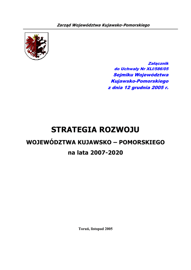 Zarząd Województwa Kujawsko-Pomorskiego Załącznik do Uchwały Nr XLI/586/05 Sejmiku Województwa Kujawsko-Pomorskiego z dnia 12 grudnia 2005 r. STRATEGIA ROZWOJU WOJEWÓDZTWA KUJAWSKO – POMORSKIEGO na lata 2007-2020 Toruń, listopad 2005 SPIS TREŚCI 1. WSTĘP............................................................................................................................................................... 4 2. REALIZACJA STRATEGII ROZWOJU WOJEWÓDZTWA KUJAWSKO-POMORSKIEGO UCHWALONEJ W CZERWCU 2000 R............................................................................................................. 5 3. DIAGNOZA STANU WOJEWÓDZTWA KUJAWSKO-POMORSKIEGO ........................................... 12 Analiza SWOT ............................................................................................................................................... 17 4. PRZESŁANKI DO PROJEKTU STRATEGII WYNIKAJĄCE Z ANALIZY ODNOŚNYCH DOKUMENTÓW.......................................................................................................................................... 19 4.1. WNIOSKI Z ANALIZ OBOWIĄZUJĄCYCH I REALIZOWANYCH DOKUMENTÓW REGIONALNYCH ....................... 19 4.2. WNIOSKI Z ANALIZ WYBRANYCH DOKUMENTÓW STRATEGICZNYCH POZIOMU KRAJOWEGO ....................... 21 4.3. DOKUMENTY PROGRAMOWE PARLAMENTU, RADY I KOMISJI EUROPEJSKIEJ .............................................. 25 5. CEL NADRZĘDNY I PRIORYTETOWE OBSZARY DZIAŁAŃ STRATEGICZNYCH..................... 26 Priorytetowy obszar działań 1. Rozwój nowoczesnej gospodarki ................................................................. 26 Działanie 1.1. Kreowanie warunków przedsiębiorczości i upowszechniania innowacji ............................................. 26 1.1.1 Rozwijanie postaw przedsiębiorczych ........................................................................................................... 26 1.1.2. Rozwijanie instytucji otoczenia biznesu ....................................................................................................... 27 1.1.3. Kształtowanie regionalnego systemu transferu innowacji i wymiany informacji ......................................... 27 1.1.4. Rozwój potencjału naukowo-badawczego regionu. ...................................................................................... 28 Działanie 1.2. Wzmacnianie konkurencyjności regionalnej gospodarki rolnej ........................................................... 28 1.2.1. Wspieranie adaptacji gospodarstw rolnych do funkcjonowania na współczesnych rynkach rolnych ........... 29 1.2.2. Wzmacnianie konkurencyjności przetwórstwa rolno-spożywczego ............................................................. 29 Działanie 1.3. Promocja rozwoju turystyki ................................................................................................................. 29 1.3.1. Promocja walorów i produktów turystycznych............................................................................................. 30 1.3.2. Rozwój sektora usług turystycznych............................................................................................................. 30 Priorytetowy obszar działań 2. Unowocześnienie struktury funkcjonalno-przestrzennej regionu................ 30 Działanie 2.1. Wspieranie rozwoju sieci osadniczej.................................................................................................... 31 2.1.1. Wspieranie procesów metropolizacji ośrodków stołecznych Bydgoszczy i Torunia .................................... 31 2.1.2. Rewitalizacja miast i wsi regionu ................................................................................................................. 31 Działanie 2.2. Rozwój infrastruktury technicznej ....................................................................................................... 32 2.2.1. Poprawa dostępności komunikacyjnej regionu ............................................................................................. 32 2.2.2. Unowocześnienie układów transportowych wewnątrzregionalnych............................................................. 33 2.2.3. Rozwój i unowocześnienie pozostałej infrastruktury technicznej i mieszkalnictwa ..................................... 33 2.2.4. Rozwój infrastruktury gospodarki wodnej.................................................................................................... 34 Działanie 2.3. Rozwój infrastruktury społeczeństwa informacyjnego......................................................................... 35 2.3.1. Rozwój infrastruktury teleinformatycznej .................................................................................................... 35 2.3.2.Informatyzacja usług publicznych, zwłaszcza w administracji i zarządzaniu ................................................ 35 Działanie 2.4. Rozwój infrastruktury społecznej......................................................................................................... 36 2.4.1. Unowocześnianie infrastruktury usług społecznych ..................................................................................... 36 2.4.2. Kształtowanie sieci usług publicznych z punktu widzenia ich dostępności .................................................. 36 Działanie 2.5. Promocja dziedzictwa kulturowego ..................................................................................................... 37 2.5.1. Zachowanie dziedzictwa kulturowego .......................................................................................................... 37 2.5.2. Adaptacja dziedzictwa kulturowego do współczesnych potrzeb społecznych .............................................. 38 Działanie 2.6. Zachowanie i wzbogacanie zasobów środowiska przyrodniczego. ...................................................... 38 2.6.1. Utrwalanie, wzbogacanie syst