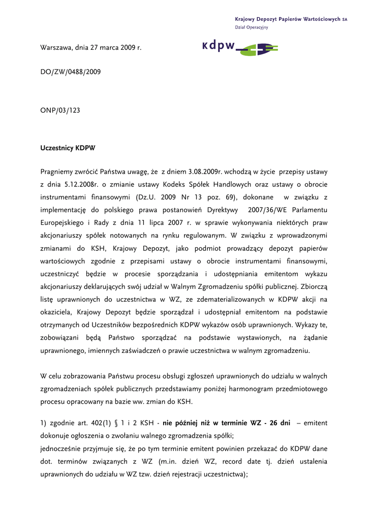 Warszawa, dnia 27 marca 2009 r. DO/ZW/0488/2009 ONP/03/123 Uczestnicy KDPW Pragniemy zwrócić Państwa uwagę, że z dniem 3.08.2009r. wchodzą w życie przepisy ustawy z dnia 5.12.2008r. o zmianie ustawy Kodeks Spółek Handlowych oraz ustawy o obrocie instrumentami finansowymi (Dz.U. 2009 Nr 13 poz. 69), dokonane implementację do polskiego prawa postanowień Dyrektywy w związku z 2007/36/WE Parlamentu Europejskiego i Rady z dnia 11 lipca 2007 r. w sprawie wykonywania niektórych praw akcjonariuszy spółek notowanych na rynku regulowanym. W związku z wprowadzonymi zmianami do KSH, Krajowy Depozyt, jako podmiot prowadzący depozyt papierów wartościowych zgodnie z przepisami ustawy o obrocie instrumentami finansowymi, uczestniczyć będzie w procesie sporządzania i udostępniania emitentom wykazu akcjonariuszy deklarujących swój udział w Walnym Zgromadzeniu spółki publicznej. Zbiorczą listę uprawnionych do uczestnictwa w WZ, ze zdematerializowanych w KDPW akcji na okaziciela, Krajowy Depozyt będzie sporządzał i udostępniał emitentom na podstawie otrzymanych od Uczestników bezpośrednich KDPW wykazów osób uprawnionych. Wykazy te, zobowiązani będą Państwo sporządzać na podstawie wystawionych, na żądanie uprawnionego, imiennych zaświadczeń o prawie uczestnictwa w walnym zgromadzeniu. W celu zobrazowania Państwu procesu obsługi zgłoszeń uprawnionych do udziału w walnych zgromadzeniach spółek publicznych przedstawiamy poniżej harmonogram przedmiotowego procesu opracowany na bazie ww. zmian do KSH. 1) zgodnie art. 402(1) § 1 i 2 KSH - nie później niż w terminie WZ - 26 dni – emitent dokonuje ogłoszenia o zwołaniu walnego zgromadzenia spółki; jednocześnie przyjmuje się, że po tym terminie emitent powinien przekazać do KDPW dane dot. terminów związanych z WZ (m.in. dzień WZ, record date tj. dzień ustalenia uprawnionych do udziału w WZ tzw. dzień rejestracji uczestnictwa); 2) po otrzymaniu danych od Emitenta – KDPW przekazuje stosowny komunikat do Uczestników KDPW ze wskazaniem terminów dot. obsługi zdarzenia (struktura komunikatu wg. specyfikacji NSDR – seev.ntf.001.01); 3) zgodnie art. 406(1) § 1 KSH - w terminie WZ - 16 dni - przypada dzień rejestracji uczestnictwa w walnym zgromadzeniu (record date) – co oznacza, że tylko osoby będące akcjonariuszami spółki w tym dniu (tzn. posiadające zapisane na rachunkach papierów wartościowych akcje spółki na koniec określonego dnia record date) będą miały prawo uczestniczenia w walnym zgromadzeniu spółki, - uczestnicy KDPW ustalają akcjonariuszy i odpowiadającą im liczbę papierów wartościowych dających prawo do uczestniczenia w WZ, - KDPW ustala liczbę papierów wartościowych, których właściciele mają prawo do uczestnictwa w WZ, rejestrowanych na kontach prowadzonych dla poszczególnych uczestników KDPW; 4) zgodnie art. 406(3) § 2 KSH - w terminie nie wcześniej niż po ogłoszeniu o zwołaniu WZ i nie później niż jeden dzień powszedni po ustalonym record date, akcjonariusze danej spółki zgłaszają do podmiotów prowadzących ich rachunki papierów wartościowych, żądania wystawienia imiennego zaświadczenia stanowiącego podstawę umieszczenia danego akcjonariusza na liście osób uprawnionych do uczestnictwa w WZ spółki; podmiot ten wystawia akcjonariuszowi imienne zaświadczenie o prawie uczestnictwa w WZ danej spółki (zakres informacji zawartych w ww. imiennych zaświadczeniach określa art. 406(3) § 3 KSH); 5) zgodnie z art. 406(3) § 7 KSH - w terminie nie później niż WZ - 12 dni – uczestnicy KDPW, na podstawie wystawionych akcjonariuszom zaświadczeń, sporządzają i przesyłają do KDPW wykaz osób uprawnionych do uczestnictwa w WZ (struktura komunikatu wg. specyfikacji NSDR – seev.ins.001.01); 6) zgodnie z art. 406(3) § 8 KSH - nie później niż na tydzień przed WZ – KDPW po otrzymaniu od uczestników KDPW komunikatów z wykazem osób uprawnionych do udziału w WZ dokonuje ich scalenia i udostępnia emitentowi zbiorczy wykaz osób uprawnionych do uczestnictwa w walnym zgromadzeniu. Ponadto, pragniemy zwrócić Państwa uwagę, na odmienny tryb obliczania biegu terminów wskazanych w KSH od zasady obliczania terminów określonych w dniach dot. zdarzeń uregulowanych w regulacjach KDPW. Przy obliczaniu terminu wykonania czynności określonych w KSH należy przyjąć poniższe zasady: - w przypadku terminu oznaczonego w dniach (czyli np. 12 dni), termin ten kończy się z upływem ostatniego dnia (daty WZ nie uwzględnia się przy obliczaniu terminu), - w przypadku terminu oznaczonego w tygodniach (tydzień przed WZ), termin ten kończy się z upływem dnia, który nazwą lub datą odpowiada początkowemu dniowi terminu (czyli jeżeli w czwartek rozpoczyna się bieg terminu, to kończy się również w czwartek), - jeżeli koniec terminu do wykonania czynności przypada na dzień uznany ustawowo za wolny od pracy, termin upływa dnia następnego. Jednocześnie informujemy, że wymiana informacji, pomiędzy Uczestnikami KDPW a Krajowym Depozytem będzie się odbywała z wykorzystaniem komunikatów elektronicznych wymienionych powyżej. Taki model wymiany danych jest w tej chwili stosowany dla obsługi komunikatów związanych z walnymi zgromadzeniami spółek estońskich i węgierskich. Z poważaniem, Dyrektor Działu Operacyjnego Krzysztof Ołdak
