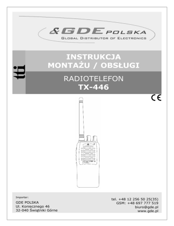 INSTRUKCJA MONTAśU / OBSŁUGI RADIOTELEFON TX-446 Importer: GDE POLSKA Ul. Koniecznego 46 32-040 Świątniki Górne tel. +48 12 256 50 25(35) GSM: +48 697 777 519 [email protected] www.gde.pl TX-446 -2- TX-446 Spis Treści 1. Wstęp 1.1 Opis radiotelefonu 1.2 Funkcje dźwiękowe “Beep“ 2. Przed przystąpieniem do eksploatacji radiotelefonu 2.1 Informacje o baterii 2.2 Instalacja baterii 2.3 MontaŜ zaczepu do paska 3. Funkcje Podstawowe 3.1 Włączanie i wyłącznie radiotelefonu On/Off 3.2 Regulacja poziomu głośności 3.3 Wybieranie kanału 3.4 Wysyłanie i odbieranie wiadomości 4. Funkcje zaawansowane 4.1 4.2 4.3 4.4 4.5 4.6 4.7 4.8 4.9 4.10 Funkcja Repeater/Talk – around Automatyczne obcinanie szumów (Squelch) Funkcja VOX Przeszukiwanie (Scan) Funkcja Talkback Pomijanie zbędnego kanału Funkcja BCLO (Busy Channel Lock Out) Funkcja TOT (Time-out Timer) Funkcja priorytetu Wywołanie radiotelefonu 5. Specyfikacja -3- TX-446 1.1 Opis Radiotelefonu 1. Przełącznik kanałów Przełącznik słuŜy do wyboru kanału. 2. Włączanie/Wyłączanie – pokrętło głośności Pokrętło słuŜy do włączania i wyłączania radiotelefonu oraz do regulacji poziomu głośności. 3. Dioda LED Dioda LED określa aktualny status radioodbiornika. KOLOR DIODY LED ZNACZENIE Ciągły CZERWONY Ciągły ZIELONY Migający ZIELONY Ciągły POMARANCZOWE Nadawanie – TX Odbiór – RX Przeszukiwanie Odbiór RX z załączoną funkcją CTCSS lub DCS -4- TX-446 4. Mikrofon Trzymaj radio frontem do siebie – mów powoli i wyraźnie. 5. Przycisk PTT (Push-to-Talk) Wciśnij przycisk PTT i mów do wbudowanego mikrofonu, puść przycisk PTT aby radio przeszło w funkcję odbioru. 6. Boczny przycisk 1 (Programowalny) 7. Boczny przycisk 2 (Programowalny) Boczne przyciski mogą być zaprogramowane za pomoc programu komputerowego dostępnego na stronie www.commax.pl lub przez lokalnego dealera i obsługiwać róŜne funkcje w zaleŜności od preferencji uŜytkownika. FUNKCJA Monitor Przeszukiwanie (SCAN) Pomijanie zbędnego Kanału Automatyczne obcinanie szumów Wywołanie DŁUGI/KRÓTKI – WCIŚNIĘTY (HOLD) Monitor jest aktywny na wybranym kanale aby rozpocząć – przeszukiwanie od aktualnego kanału lub aby zakończyć przeszukiwanie UmoŜliwia czasowe pomijanie – kanału podczas przeszukiwania UmoŜliwia zmianę poziomu – selektywności radiotelefonu normalna/wąska Wywołanie innego – radiotelefonu 8. Gniazda wejściowe W celu podłączenia urządzeń zewnętrznych (akcesorii) odkręć śrubę i usuń plastykową osłonę. -5- TX-446 1.2 Funkcje dźwiękowe ”Beep” 1. Włączenie radia i auto-test zakończony sukcesem. 2. Włączenie radia i auto-test zakończony wykryciem błędu. 3. Załączenie funkcji VOX (czułość HIGH). 4. Załączeni funkcji VOX (czułość LOW ). 5. Beep POSITIVE. 6. Beep NEGATIVE. Uwaga! - ‘wysoki’ beep - ‘niski’ beep 2. Przed przystąpieniem do eksploatacji 2.1 Informacje o baterii Aby jak najbardziej wydłuŜyć okres działania baterii oraz jej Ŝywotność, proszę stosować się poniŜej podanych reguł: • Do ładowania baterii stosuj tylko ładowarkę dołączoną do zestawu. Ładowanie zasilaczem innego typu grozi uszkodzeniem baterii. • Wyłącz radio kiedy ładujesz baterie. • Temperatura pomieszczenia, w którym ładowane są baterie powinna wynosić ok. 25°C, a temperatura samej baterii 10-35°C. Zap ewnia to wydłuŜenie Ŝywotności ogniwa. • Przez 2 lata bateria powinna zachować swoje parametry – nie powinna stracić swojej pojemności oraz nie powinien wystąpić tzw. efekt pamięciowy, jeŜeli jest ona przechowywana w miejscu chłodnym i suchym. -6- TX-446 2.2 Instalacja baterii 1. Umieść baterię z tyłu radiotelefonu. 2. Umieść baterię na dolnej krawędzi obudowy, tak aby obudowa baterii ‘zaskoczyła’ w gniazdo radiotelefonu. Następnie dociśnij baterię (tak jak to pokazuje rysunek poniŜej) aŜ do zatrzaśnięcie się zamka. Pamiętaj aby przed usunięciem baterii wyłączyć radiotelefon! 1. W celu usuniecie baterii naleŜy nacisnąć zatrzask. 2. Następnie oddzielić baterię od radiotelefonu. -7- TX-446 2.3 MontaŜ zaczepu do paska Aby zamontować klips do paska naleŜy nałoŜyć go na tylną część obudowy (tak jak to pokazuje rysunek poniŜej), a następnie zsunąć go w dół aŜ do momentu zatrzaśnięcia. Aby wymontować zaczep do paska naleŜy: 1. Nacisnąć zatrzask mocujący. 2. Wysunąć zaczep do paska tak jak to pokazuje rysunek poniŜej. -8- TX-446 3. Funkcje podstawowe 3.1 Włączanie i wyłącznie radiotelefonu On/Off • Aby włączyć radiotelefon przekręć pokrętło regulacji głośności zgodnie z kierunkiem obrotu wskazówek zegara. Zapali się zielona dioda LED, następnie czerwona oraz dźwięk beep. Gdy czerwona dioda LED zgaśnie radiotelefon jest gotowy do pracy. • JeŜeli dźwięk beep jest wysoki (high) i długi – auto-test został zakończony pomyślnie. JeŜeli dźwięk beep jest niski (low) i długi – auto-test wykrył błąd, moŜe to świadczyć o uszkodzeniu radiotelefonu. NaleŜy skontaktować się z serwisem w celu rozwiązania problemu. • Aby wyłączyć radiotelefon przekręć pokrętło regulacji głośności przeciwnie do ruchu wskazówek zegara do momentu ‘kliknięcia’. 3.2 Regulacja poziomu głośności • Przyciśnij i przytrzymaj przycisk monitora (boczny przycisk 1), aby usłyszeć szum radiowy. • Reguluj poziom dźwięku pokrętłem głośności (On/Off) aŜ do uzyskania Ŝądanego poziomu. • Aby zwiększyć poziom głośności przekręć pokrętło głośności w prawo, jeŜeli chcesz zmniejszyć poziom głośności przekręć pokrętło głośności w lewą stronę. • Po uzyskaniu Ŝądanego poziomu głośności puść przycisk monitora (boczny przycisk 1). -9- TX-446 3.3 Wybieranie kanału Aby wybrać określony kanał naleŜy przekręcić przełącznik kanałów lewo lub w prawo. 3.4 Wysyłanie i odbieranie wiadomości Aby wysłać wiadomo