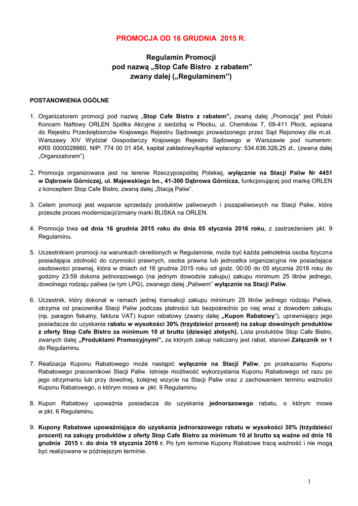 PROMOCJA OD 16 GRUDNIA 2015 R. Regulamin Promocji pod nazwą „Stop Cafe Bistro z rabatem” zwany dalej („Regulaminem”) POSTANOWIENIA OGÓLNE 1. Organizatorem promocji pod nazwą „Stop Cafe Bistro z rabatem”, zwaną dalej „Promocją” jest Polski Koncern Naftowy ORLEN Spółka Akcyjna z siedzibą w Płocku, ul. Chemików 7, 09-411 Płock, wpisana do Rejestru Przedsiębiorców Krajowego Rejestru Sądowego prowadzonego przez Sąd Rejonowy dla m.st. Warszawy XIV Wydział Gospodarczy Krajowego Rejestru Sądowego w Warszawie pod numerem: KRS 0000028860, NIP: 774 00 01 454, kapitał zakładowy/kapitał wpłacony: 534.636.326,25 zł., (zwana dalej „Organizatorem”) 2. Promocja organizowana jest na terenie Rzeczypospolitej Polskiej, wyłącznie na Stacji Paliw Nr 4451 w Dąbrowie Górniczej, ul. Majewskiego bn., 41-300 Dąbrowa Górnicza, funkcjonującej pod marką ORLEN z konceptem Stop Cafe Bistro, zwaną dalej „Stacją Paliw”. 3. Celem promocji jest wsparcie sprzedaży produktów paliwowych i pozapaliwowych na Stacji Paliw, która przeszła proces modernizacji/zmiany marki BLISKA na ORLEN. 4. Promocja trwa od dnia 16 grudnia 2015 roku do dnia 05 stycznia 2016 roku, z zastrzeżeniem pkt. 9 Regulaminu. 5. Uczestnikiem promocji na warunkach określonych w Regulaminie, może być każda pełnoletnia osoba fizyczna posiadająca zdolność do czynności prawnych, osoba prawna lub jednostka organizacyjna nie posiadająca osobowości prawnej, która w dniach od 16 grudnia 2015 roku od godz. 00:00 do 05 stycznia 2016 roku do godziny 23:59 dokona jednorazowego (na jednym dowodzie zakupu) zakupu minimum 25 litrów jednego, dowolnego rodzaju paliwa (w tym LPG), zwanego dalej „Paliwem” wyłącznie na Stacji Paliw. 6. Uczestnik, który dokonał w ramach jednej transakcji zakupu minimum 25 litrów jednego rodzaju Paliwa, otrzyma od pracownika Stacji Paliw podczas płatności lub bezpośrednio po niej wraz z dowodem zakupu (np. paragon fiskalny, faktura VAT) kupon rabatowy (zwany dalej „Kupon Rabatowy”), uprawniający jego posiadacza do uzyskania rabatu w wysokości 30% (trzydzieści procent) na zakup dowolnych produktów z oferty Stop Cafe Bistro za minimum 10 zł brutto (dziesięć złotych). Lista produktów Stop Cafe Bistro, zwanych dalej „Produktami Promocyjnymi”, za których zakup naliczany jest rabat, stanowi Załącznik nr 1 do Regulaminu. 7. Realizacja Kuponu Rabatowego może nastąpić wyłącznie na Stacji Paliw, po przekazaniu Kuponu Rabatowego pracownikowi Stacji Paliw. Istnieje możliwość wykorzystania Kuponu Rabatowego od razu po jego otrzymaniu lub przy dowolnej, kolejnej wizycie na Stacji Paliw oraz z zachowaniem terminu ważności Kuponu Rabatowego, o którym mowa w pkt. 9 Regulaminu. 8. Kupon Rabatowy upoważnia posiadacza do uzyskania jednorazowego rabatu, o którym mowa w pkt. 6 Regulaminu. 9. Kupony Rabatowe upoważniające do uzyskania jednorazowego rabatu w wysokości 30% (trzydzieści procent) na zakupy produktów z oferty Stop Cafe Bistro za minimum 10 zł brutto są ważne od dnia 16 grudnia 2015 r. do dnia 19 stycznia 2016 r. Po tym terminie Kupony Rabatowe tracą ważność i nie mogą być realizowane w późniejszym terminie. 1 10. W przypadku zakupu jednego dowolnego rodzaju Paliwa w ilości będącej wielokrotnością 25 litrów na jednym dowodzie zakupu, Uczestnikowi nie przysługuje proporcjonalnie większa liczba Kuponów Rabatowych. 11. Każdy Uczestnik może wziąć udział w Promocji wielokrotnie na zasadach opisanych Regulaminem, przy założeniu, że rabat na zakupy produktów z oferty Stop Cafe Bistro, o którym mowa w pkt. 6, może uzyskać z użyciem maksymalnie 1 (słownie: jednego) Kuponu Rabatowego. Kupony Rabatowe nie sumują się. 12. Uczestnik nie może domagać się wykorzystania Kuponu Rabatowego w celu uzyskania rabatu na inne sprzedawane na Stacji Paliw produkty lub usługi ani wymiany Kuponu Rabatowego na jego równowartość w pieniądzach ani na żadną inną wymianę. 13. W ramach jednej wizyty na Stacji Paliw można zrealizować dowolną ilość Kuponów Rabatowych uprawniających do uzyskania rabatu na zasadach określonych w Regulaminie , z zastrzeżeniem pkt 11 Regulaminu. 14. Realizacja Kuponu Rabatowego, o którym mowa w pkt. 6, nie obejmuje transakcji zakupu Produktów Promocyjnych dokonanych przy użyciu kart FLOTA, OPEN DRIVE, Biznestank oraz Karty Zakupowej i Karty Upominkowej wydawanej w ramach oferty TankBank. Realizacja Kuponu Rabatowego możliwa jest wyłącznie przy realizacji płatności za paliwo gotówką lub przy użyciu karty bankowej. 15. Realizacja Kuponu Rabatowego, o którym mowa w pkt. 6 Regulaminu, nie może być łączona z innymi promocjami i rabatami oferowanymi przez Organizatora, a wpływającymi na dalsze obniżenie ceny produktów z oferty Stop Cafe Bistro. W przypadku, gdy Uczestnik spełni warunki uprawniające go do uzyskania rabatu na produkty Stop Cafe Bistro na podstawie regulaminu innej akcji promocyjnej, Uczestnik otrzyma jeden, korzystniejszy dla siebie (wyższy) rabat zgodnie z zasadą większej korzyści dla klienta. 16. Za dokonanie zakupu Produktów Promocyjnych z użyciem Kuponu Rabatowego Uczestnikowi przysługują punkty VITAY, z zastrzeżeniem spełnienia warunków określonych w Regulaminie Programu VITAY. SPOSÓB ZGŁASZANIA I ROZPATRYWANIA REKLAMACJI 17. Reklamacje związane z przebiegiem Promocji określonej niniejszym Regulaminem mogą być zgłaszane przez Uczestników m.in.: a) na piśmie i wysłane na adres: PKN ORLEN S.A. ul. Bielańska 12; 00-085 Warszawa z dopiskiem „Promocja Stop Cafe Bistro z rabatem”, b) poprzez Formularz Kontaktowy dedykowany http://opinie.orlen.pl/forms/ZglosProblem.aspx dla Akcji Promocyjnych na stronie: c) telefonicznie w całodobowym Centrum Obsługi Klienta PKN ORLEN pod numerami telefonów: 801-167536 (z tel. stacjonarnych), 502-167-536 (z tel. komórkowych). Koszt połączenia naliczany jest zgodnie z taryfą operatora. 18. Re