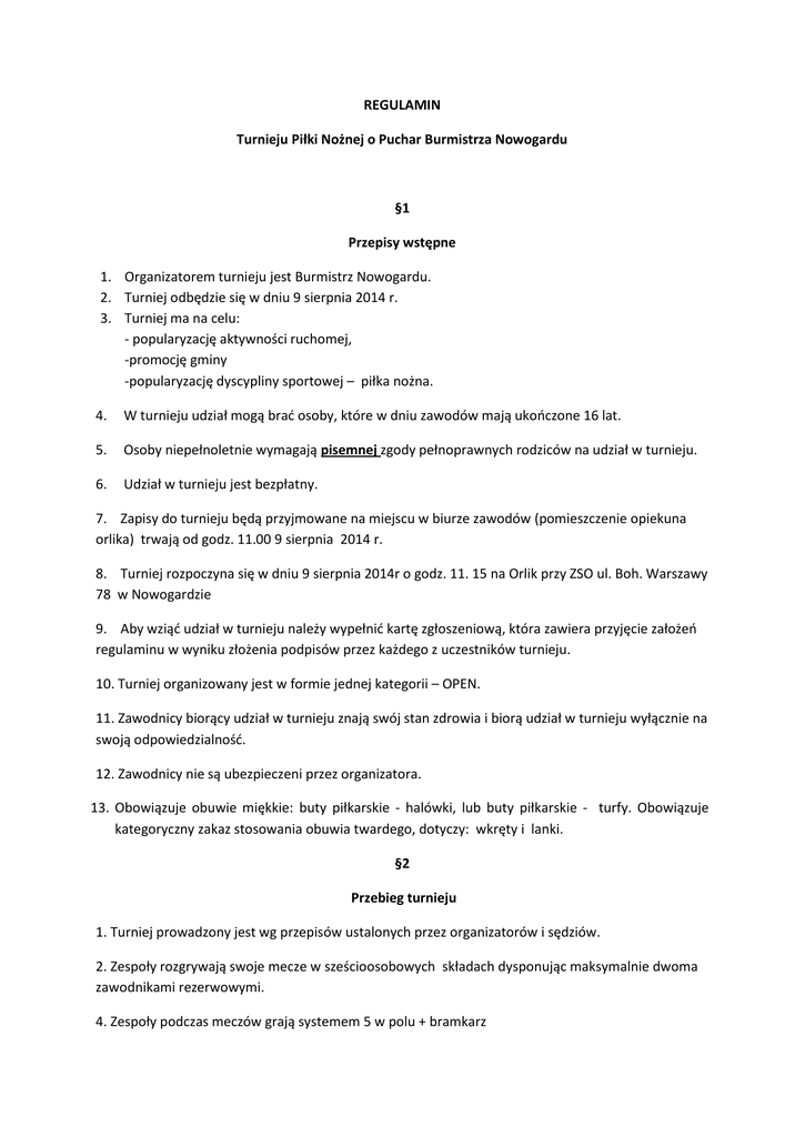 REGULAMIN Turnieju Piłki Nożnej o Puchar Burmistrza Nowogardu §1 Przepisy wstępne 1. Organizatorem turnieju jest Burmistrz Nowogardu. 2. Turniej odbędzie się w dniu 9 sierpnia 2014 r. 3. Turniej ma na celu: - popularyzację aktywności ruchomej, -promocję gminy -popularyzację dyscypliny sportowej – piłka nożna. 4. W turnieju udział mogą brać osoby, które w dniu zawodów mają ukończone 16 lat. 5. Osoby niepełnoletnie wymagają pisemnej zgody pełnoprawnych rodziców na udział w turnieju. 6. Udział w turnieju jest bezpłatny. 7. Zapisy do turnieju będą przyjmowane na miejscu w biurze zawodów (pomieszczenie opiekuna orlika) trwają od godz. 11.00 9 sierpnia 2014 r. 8. Turniej rozpoczyna się w dniu 9 sierpnia 2014r o godz. 11. 15 na Orlik przy ZSO ul. Boh. Warszawy 78 w Nowogardzie 9. Aby wziąć udział w turnieju należy wypełnić kartę zgłoszeniową, która zawiera przyjęcie założeń regulaminu w wyniku złożenia podpisów przez każdego z uczestników turnieju. 10. Turniej organizowany jest w formie jednej kategorii – OPEN. 11. Zawodnicy biorący udział w turnieju znają swój stan zdrowia i biorą udział w turnieju wyłącznie na swoją odpowiedzialność. 12. Zawodnicy nie są ubezpieczeni przez organizatora. 13. Obowiązuje obuwie miękkie: buty piłkarskie - halówki, lub buty piłkarskie - turfy. Obowiązuje kategoryczny zakaz stosowania obuwia twardego, dotyczy: wkręty i lanki. §2 Przebieg turnieju 1. Turniej prowadzony jest wg przepisów ustalonych przez organizatorów i sędziów. 2. Zespoły rozgrywają swoje mecze w sześcioosobowych składach dysponując maksymalnie dwoma zawodnikami rezerwowymi. 4. Zespoły podczas meczów grają systemem 5 w polu + bramkarz 5. Dopuszczone są powrotne zmiany zawodników w meczu. 6. System zawodów określi sędzia główny przed rozpoczęciem zawodów. 7. System kar określi sędzia zawodów przed turniejem. 8. Czas trwania meczów określi sędzia główny przed rozpoczęciem zawodów w zależności od . 9. W sytuacjach spornych decyduje sędzia zawodów. 10. Zmiany w przepisach zastrzeżone są dla sędziego zawodów. 11. Organizator zapewni niezbędny sprzęt do przeprowadzenia zawodów. 12. Nad przebiegiem turnieju i przerwami w trakcie jego trwania czuwa sędzia zawodów. 14. Podczas turnieju zawodników obowiązuje pełna odpowiedzialność cywilna zawodników. 15. Drużynę reprezentuje jedynie kapitan i to on uczestniczy w wszelkich uzgodnieniach z sędzią oraz organizatorem w trakcie turnieju. §3 Nagrody 1. Organizator przewiduje nagrody za następujące miejsca: I miejsce, II miejsce, III miejsce. 2. Nagrodą za zdobycie miejsca określonego w §3 pkt. 1 jest nagroda rzeczowa dla drużyny: I miejsce – puchar + główna nagroda rzeczowa II miejsce – puchar + nagroda rzeczowa III miejsce – puchar + nagroda rzeczowa 3. Organizator przewiduje nagrody dodatkowe w postaci nagrody dla najlepszego bramkarza i najlepszego strzelca turnieju. Nagrodę dla najlepszego bramkarza stanowi statuetka + nagroda rzeczowa. Nagrodę dla najlepszego strzelca turnieju stanowi statuetka + nagroda rzeczowa. §3 Przepisy końcowe 1. Organizator zastrzegają sobie prawo do zmiany regulaminu. W przypadku istotnych zmian zobowiązują się do powiadomienia zawodników o zmianach w regulaminie. 2. Organizator zastrzega sobie możliwość odwołania imprezy i zmianę w regulaminie bez podania przyczyny. 3. Organizator może wykorzystać dane zawodników do celów promocyjnych turnieju. 4. Wszelkich informacji o turnieju można uzyskać w Wydziale Rozwoju Lokalnego, Funduszy, Kultury i Sportu Urzędu Miejskiego w Nowogardzie pl. Wolności 5, 72-200 Nowogard, pok. 201, 209. Tel. 91 39 26 293 lub 91 39 26 237. KARTA ZGŁOSZENIOWA DO TURNIEJU PIŁKI NOŻNEJ O PUCHAR BURMISTRZA NoWOGARDU 1. Nazwa zespołu: …………………………………………………………………………………………………………………………………………………………. 2. Skład drużyny: Imię i nazwisko zawodnika ( proszę zaznaczyć kapitana drużyny) PESEL Adres Podpisy zawodników 1. 2. 3. 4. 5. 6. 7. 8. 3. Przyjęcie warunków regulaminu TURNIEJU PIŁKI NOŻNEJ O PUCHAR BURMISTRZA NOWOGARDU: 4. Oświadczam, iż akceptuję postanowienia regulaminu TURNIEJU PIŁKI NOŻNEJ O PUCHAR BURMISTRZA NOWOGARDU. Biorąc udział w turnieju wyrażam zgodę na postanowienia zawarte w regulaminie TURNIEJU PIŁKI NOŻNEJ O PUCHAR BURMISTRZA NOWOGARDU oraz wyrażam zgodę na wykorzystanie moich danych do celów promocyjnych turnieju przez organizatora.