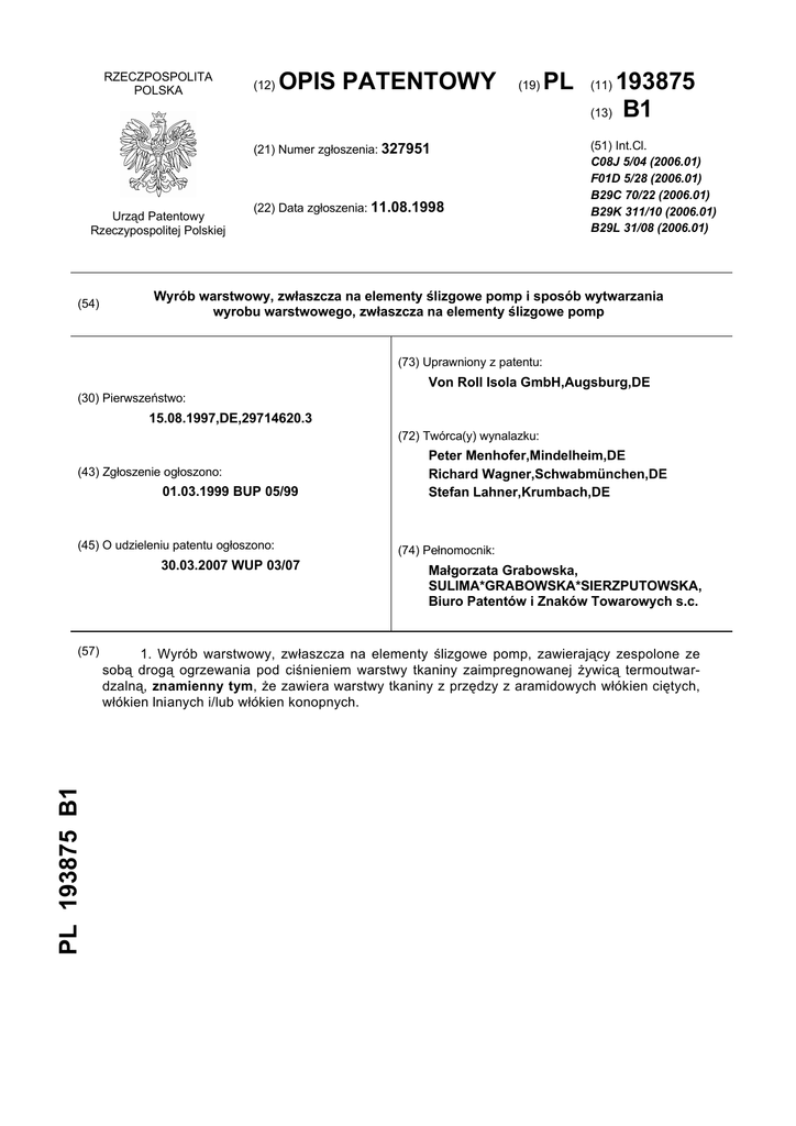 RZECZPOSPOLITA POLSKA (12) OPIS PATENTOWY (19) (21) Numer zgłoszenia: 327951 Urząd Patentowy Rzeczypospolitej Polskiej (54) (22) Data zgłoszenia: 11.08.1998 PL 193875 (13) B1 (11) (51) Int.Cl. C08J 5/04 (2006.01) F01D 5/28 (2006.01) B29C 70/22 (2006.01) B29K 311/10 (2006.01) B29L 31/08 (2006.01) Wyrób warstwowy, zwłaszcza na elementy ślizgowe pomp i sposób wytwarzania wyrobu warstwowego, zwłaszcza na elementy ślizgowe pomp (73) Uprawniony z patentu: Von Roll Isola GmbH,Augsburg,DE (30) Pierwszeństwo: 15.08.1997,DE,29714620.3 (72) Twórca(y) wynalazku: (43) Zgłoszenie ogłoszono: 01.03.1999 BUP 05/99 (45) O udzieleniu patentu ogłoszono: 30.03.2007 WUP 03/07 PL 193875 B1 (57) Peter Menhofer,Mindelheim,DE Richard Wagner,Schwabmünchen,DE Stefan Lahner,Krumbach,DE (74) Pełnomocnik: Małgorzata Grabowska, SULIMA*GRABOWSKA*SIERZPUTOWSKA, Biuro Patentów i Znaków Towarowych s.c. 1. Wyrób warstwowy, zwłaszcza na elementy ślizgowe pomp, zawierający zespolone ze sobą drogą ogrzewania pod ciśnieniem warstwy tkaniny zaimpregnowanej żywicą termoutwardzalną, znamienny tym, że zawiera warstwy tkaniny z przędzy z aramidowych włókien ciętych, włókien lnianych i/lub włókien konopnych. 2 PL 193 875 B1 Opis wynalazku Przedmiotem wynalazku jest wyrób warstwowy, zwłaszcza na elementy ślizgowe pomp i sposób wytwarzania wyrobu warstwowego, zwłaszcza na elementy ślizgowe pomp, poprzez sprasowanie w wysokiej temperaturze warstw z tkaniny zaimpregnowanej żywicą termoutwardzalną. Wyroby tego typu są znane i stosowane przykładowo w różnych częściach konstrukcji maszyn. W EP 470 155 B1 opisano tego typu wyrób, wytworzony z użyciem przędzy mającej rdzeń z włókna szklanego z otoczką z włókna aramidowego i wiskozowego, przy czym udział włókna aramidowego nie przewyższa 40% wag. przędzy użytej do wytworzenia tkaniny. Ponadto znany jest tego rodzaju materiał, wytwarzany z użyciem przędzy składającej się z rdzenia z włókna szklanego otoczonego zarówno włóknem aramidowym, jak i włóknem węglowym. Jakkolwiek element ślizgowy pompy wykonany z takiej tkaniny jest zasadniczo odpowiedni, jednak w przypadku jego zastosowania w pompie występują problemy z powodu silnej emisji szumów. Ponadto znane elementy ślizgowe pomp są bardzo podatne na zużycie. Celem wynalazku było zatem dostarczenie wyrobów bez wyżej opisanych wad przy zastosowaniu ich na elementy ślizgowe pomp oraz opracowanie sposobu wytwarzania takich wyrobów. Cel ten osiągnięto zgodnie z wynalazkiem dzięki temu, że wyrób warstwowy zawiera zespolone ze sobą drogą ogrzewania pod ciśnieniem warstwy tkaniny zaimpregnowanej żywicą termoutwardzalną, przy czym są to warstwy tkaniny z przędzy z aramidowych włókien ciętych, włókien lnianych i/lub włókien konopnych. Sposób wytwarzania wyrobu warstwowego polega na zespalaniu ze sobą warstw tkaniny zaimpregnowanej żywicą termoutwardzalną drogą ogrzewania pod ciśnieniem, a cechą tego sposobu jest to, że stosuje się tkaninę z przędzy z aramidowych włókien ciętych, włókien lnianych i/lub włókien konopnych. Przędzę stosowaną do wytwarzania tkaniny korzystnie wytwarza się z tak zwanych włókien ciętych. Włókna cięte stanowią włókno pocięte lub porozrywane na odcinki o określonej długości. Jako materiał wyjściowy do wytwarzania tkaniny na wyrób według wynalazku można stosować przędzę pozyskaną z wtórnego zastosowania tkanin i przędzy. W celu wytworzenia wyrobu warstwowego według wynalazku w postaci płaskiego materiału układa się tkaninę nasyconą żywicą termoutwardzalną w wielu warstwach leżących jedna na drugiej, utwardza się żywicę pod działaniem ciepła i ciśnienia, po czym utwardzony płaski materiał tnie się na elementy o żądanej wielkości. Jako żywice termoutwardzalne stosuje się np. żywice fenolowe, takie jak żywice fenolowo-formaldehydowe. W zależności od późniejszego zastosowania produktu można do żywicy dodać inne dodatki, np. dla zmniejszenia tarcia. Element ślizgowy pompy wytworzony z wyrobu warstwowego według wynalazku jest odporny na zużycie i na korozję oraz pozwala na pracę pompy z małą emisją szumów. Szczególną zaletą jest wytrzymałość mechaniczna na złamanie przy zginaniu/rozciąganiu i wytrzymałość na zużycie. Ponadto element ślizgowy pompy wytworzony z wyrobu warstwowego według wynalazku ma mniejszy ciężar niż znane elementy ślizgowe pomp wytwarzane z włókien szklanych, co prowadzi do oszczędności na mocy pompy. Przykład 2 Tkaninę z włókna aramidowego o gramaturze 600 g/m zaimpregnowano roztworem żywicy fenolowej tak, że po wysuszeniu w temperaturze 160°C otrzymano płaski produkt pośredni o gra2 maturze 1600 g/m . Do wytworzenia materiału o grubości 10,0 mm użyto 10 warstw płaskiego produktu pośredniego, które ułożono pomiędzy dwiema blachami stalowymi o grubości 3,0 mm i sprasowano w prasie jedno- lub wielopółkowej w temperaturze 165°C i pod ciśnieniem jednostkowym 6,5 MPa. Po 90 minutach ogrzewania ochłodzono płaski wyrób według wynalazku do temperatury otoczenia i wyjęto z blach stalowych. PL 193 875 B1 3 Zastrzeżenia patentowe 1. Wyrób warstwowy, zwłaszcza na elementy ślizgowe pomp, zawierający zespolone ze sobą drogą ogrzewania pod ciśnieniem warstwy tkaniny zaimpregnowanej żywicą termoutwardzalną, znamienny tym, że zawiera warstwy tkaniny z przędzy z aramidowych włókien ciętych, włókien lnianych i/lub włókien konopnych. 2. Sposób wytwarzania wyrobu warstwowego, zwłaszcza na elementy ślizgowe pomp, poprzez zespalanie ze sobą warstw tkaniny zaimpregnowanej żywicą termoutwardzalną drogą ogrzewania pod ciśnieniem, znamienny tym, że stosuje się tkaninę z przędzy z aramidowych włókien ciętych, włókien lnianych i/lub włókien konopnych. 4 PL 193 875 B1 Departament Wydawnictw UP RP Nakład 50 egz. Cena 2,00 zł.