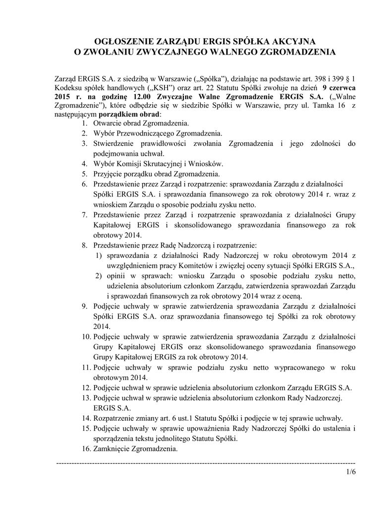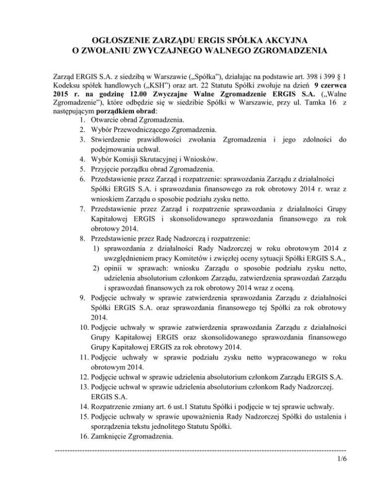 OGŁOSZENIE ZARZĄDU ERGIS SPÓŁKA AKCYJNA O ZWOŁANIU ZWYCZAJNEGO WALNEGO ZGROMADZENIA Zarząd ERGIS S.A. z siedzibą w Warszawie („Spółka”), działając na podstawie art. 398 i 399 § 1 Kodeksu spółek handlowych („KSH”) oraz art. 22 Statutu Spółki zwołuje na dzień 9 czerwca 2015 r. na godzinę 12.00 Zwyczajne Walne Zgromadzenie ERGIS S.A. („Walne Zgromadzenie”), które odbędzie się w siedzibie Spółki w Warszawie, przy ul. Tamka 16 z następującym porządkiem obrad: 1. Otwarcie obrad Zgromadzenia. 2. Wybór Przewodniczącego Zgromadzenia. 3. Stwierdzenie prawidłowości zwołania Zgromadzenia i jego zdolności do podejmowania uchwał. 4. Wybór Komisji Skrutacyjnej i Wniosków. 5. Przyjęcie porządku obrad Zgromadzenia. 6. Przedstawienie przez Zarząd i rozpatrzenie: sprawozdania Zarządu z działalności Spółki ERGIS S.A. i sprawozdania finansowego za rok obrotowy 2014 r. wraz z wnioskiem Zarządu o sposobie podziału zysku netto. 7. Przedstawienie przez Zarząd i rozpatrzenie sprawozdania z działalności Grupy Kapitałowej ERGIS i skonsolidowanego sprawozdania finansowego za rok obrotowy 2014. 8. Przedstawienie przez Radę Nadzorczą i rozpatrzenie: 1) sprawozdania z działalności Rady Nadzorczej w roku obrotowym 2014 z uwzględnieniem pracy Komitetów i zwięzłej oceny sytuacji Spółki ERGIS S.A., 2) opinii w sprawach: wniosku Zarządu o sposobie podziału zysku netto, udzielenia absolutorium członkom Zarządu, zatwierdzenia sprawozdań Zarządu i sprawozdań finansowych za rok obrotowy 2014 wraz z oceną. 9. Podjęcie uchwały w sprawie zatwierdzenia sprawozdania Zarządu z działalności Spółki ERGIS S.A. oraz sprawozdania finansowego tej Spółki za rok obrotowy 2014. 10. Podjęcie uchwały w sprawie zatwierdzenia sprawozdania Zarządu z działalności Grupy Kapitałowej ERGIS oraz skonsolidowanego sprawozdania finansowego Grupy Kapitałowej ERGIS za rok obrotowy 2014. 11. Podjęcie uchwały w sprawie podziału zysku netto wypracowanego w roku obrotowym 2014. 12. Podjęcie uchwał w sprawie udzielenia absolutorium członkom Zarządu ERGIS S.A. 13. Podjęcie uchwał w sprawie udzielenia absolutorium członkom Rady Nadzorczej. ERGIS S.A. 14. Rozpatrzenie zmiany art. 6 ust.1 Statutu Spółki i podjęcie w tej sprawie uchwały. 15. Podjęcie uchwały w sprawie upoważnienia Rady Nadzorczej Spółki do ustalenia i sporządzenia tekstu jednolitego Statutu Spółki. 16. Zamknięcie Zgromadzenia. --------------------------------------------------------------------------------------------------------------------1/6 Proponowane są następujące zmiany Statutu Spółki: 1) w art. 6 ust.1 o treści: „1. Przedmiotem przedsiębiorstwa Spółki jest: 1) Produkcja opakowań z tworzyw sztucznych - PKD 22.22.Z, 2) Produkcja wyrobów dla budownictwa z tworzyw sztucznych – PKD 22.23.Z, 3) Produkcja płyt, arkuszy, rur i kształtowników z tworzyw sztucznych - PKD 22.21.Z, 4) Produkcja pozostałych wyrobów z tworzyw sztucznych -PKD 22.29.Z, 5) Odzysk surowców z materiałów segregowanych – PKD 38.32.Z, 6) Działalność agentów specjalizujących się w sprzedaży pozostałych określonych towarów - PKD 46.18.Z, 7) Sprzedaż hurtowa wyrobów chemicznych -PKD 46.75.Z, 8) Sprzedaż hurtowa pozostałych półproduktów -PKD 46.76.Z, 9) Sprzedaż hurtowa niewyspecjalizowana -PKD 46.90.Z, 10) Pozostała sprzedaż detaliczna prowadzona w niewyspecjalizowanych sklepach – PKD 47.19.Z, 11) Transport drogowy towarów – PKD 49.41.Z, 12) Magazynowanie i przechowywanie pozostałych towarów – PKD 52.10.B, 13) Produkcja pozostałych wyrobów tekstylnych, gdzie indziej niesklasyfikowana – PKD 13.99.Z, 14) Produkcja pozostałych wyrobów, gdzie indziej niesklasyfikowana – PKD 32.99.Z, 15) Produkcja tapet – PKD 17.24.Z, 16) Produkcja papieru i tektury – PKD 17.12.Z, 17) Produkcja pozostałych wyrobów z papieru i tektury – PKD 17.29.Z, 18) Pozostałe drukowanie – PKD 18.12.Z, 19) Sprzedaż hurtowa pozostałych artykułów użytku domowego- PKD 46.49.Z, 20) Sprzedaż hurtowa drewna, materiałów budowlanych i wyposażenia sanitarnego – PKD 46.73.Z, 21) Sprzedaż detaliczna dywanów, chodników i innych pokryć podłogowych oraz pokryć ściennych prowadzona w wyspecjalizowanych sklepach – PKD 47.53.Z; 22) Sprzedaż detaliczna pozostałych nowych wyrobów prowadzona w wyspecjalizowanych sklepach – PKD 47.78.Z; 23) Produkcja klejów – PKD 20.52.Z, 24) Sprzedaż hurtowa pozostałych maszyn i urządzeń – PKD 46.69.Z., 25) Pozostałe formy udzielania kredytów – PKD 64.92.Z, 26) Wynajem i dzierżawa samochodów osobowych i furgonetek – PKD 77.11.Z, 27) Wynajem i dzierżawa pozostałych pojazdów samochodowych, z wyłączeniem motocykli – PKD 77.12.Z, 28) Wynajem i dzierżawa maszyn i urządzeń biurowych, włączając komputery – PKD 77.33.Z, --------------------------------------------------------------------------------------------------------------------2/6 29) Wynajem i dzierżawa pozostałych maszyn, urządzeń oraz dóbr materialnych, gdzie indziej niesklasyfikowane – PKD 77.39.Z.” po punkcie 29) dodaje się przecinek i punkty 30) i 31) w następującym brzmieniu: „30) Pozostałe badania i analizy techniczne – PKD 71.20.B, 31) Dzierżawa własności intelektualnej i podobnych produktów, z wyłączeniem prac chronionych prawem autorskim – PKD 77.40.Z.” Informacja dla akcjonariuszy Prawo do uczestnictwa w Walnym Zgromadzeniu Zarząd Spółki informuje, że prawo uczestnictwa w Walnym Zgromadzeniu mają, stosownie do postanowień art. 4061 i art. 4063 § 1 i 2 KSH, wyłącznie osoby, będące akcjonariuszami Spółki na szesnaście dni przed datą Walnego Zgromadzenia, tj. w dniu 24 maja 2015 r. (dzień rejestracji uczestnictwa w Walnym Zgromadzeniu, zwany dalej „Dniem Rejestracji”), które: - w okresie od dnia ogłoszenia o zwołaniu Walnego Zgromadzenia, tj. od dnia 12 maja 2015 r., do pierwszego dnia powszedniego po Dni