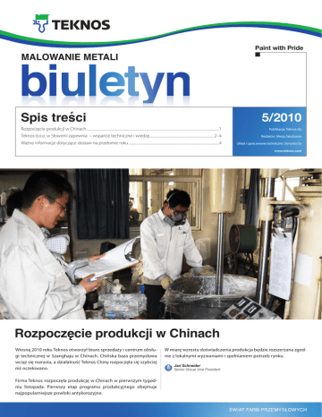 Paint with Pride Spis treści 5/2010 Rozpoczęcie produkcji w Chinach.............................................................................................................................................................1 Publikacja: Teknos Oy Teknos d.o.o. w Słowenii zapewnia – wsparcie techniczne i wiedzę.............................................................................2–4 Redaktor: Merja Jakobsson Ważne informacje dotyczące dostaw na przełomie roku............................................................................................................4 Układ i opracowanie techniczne: Dynastia Oy www.teknos.com Rozpoczęcie produkcji w Chinach Wiosną 2010 roku Teknos otworzył biuro sprzedaży i centrum obsługi technicznej w Szanghaju w Chinach. Chińska baza przemysłowa wciąż się rozrasta, a działalność Teknos Chiny rozpoczęła się szybciej niż oczekiwano. Firma Teknos rozpoczęła produkcję w Chinach w pierwszym tygodniu listopada. Pierwszy etap programu produkcyjnego obejmuje najpopularniejsze powłoki antykorozyjne. W miarę wzrostu doświadczenia produkcja będzie rozszerzana zgodnie z lokalnymi wyzwaniami i spełnianiem potrzeb rynku. Jari Schneider Senior Group Vice President Strona 2 Teknos d.o.o. w Słowenii zapewnia Wsparcie techniczne i wiedzę W 2008 roku, tuż przed załamaniem w przemyśle metalowym, firma Teknos otworzyła filię w Słowenii. Dwa lata później praca zaczęła przynosić zyski. Kilka faktów na temat Słowenii: Położenie: Europa Środkowa Populacja: 2 051 000 Powierzchnia: 20 273 km2 Stolica: Ljubljana, populacja: 265 000 Język urzędowy: słoweński Waluta: euro (EUR) od 1 stycznia 2007 Najważniejsze sektory przemysłu produkcyjnego: stal i metale, samochody, AGD, drewno, tekstylia, farmaceutyki i chemikalia, maszyny Teknos Słowenia szybko zaadoptowała wartości Teknos poprzez zdeterminowane dążenie do stania się preferowanym dostawcą dla swoich klientów. Osiągnięcie tego celu jest możliwe dzięki oferowanym przez Teknos unikalnym rozwiązaniom malarskim i doskonałej obsłudze technicznej. Chociaż większość uwagi Teknos d.o.o. jest skierowana na rynek słoweński, obsługujemy też klientów z krajów ościennych. Teknos d.o.o. pragnie przedstawić trzy ze swych najnowszych referencji jako przykłady stylu działania: niezawodności i innowacji. Strona 3 SCT d.d. Ponad 60 lat tradycji i doświadczeń SCT obejmuje główne drogi Słowenii, obiekty przemysłowe i mieszkalne oraz inne ważne budynki i konstrukcje inżynierskie. Niektóre z głównych prac inżynieryjnych w Słowenii noszą znak SCT. Jest to jednak tylko część z ponad 11 000 konstrukcji budowlanych i inżynierskich o różnym przeznaczeniu, składających się na historię działalności przedsiębiorstwa. SCT stworzyło ponad 4 500 kilometrów dróg lokalnych, regionalnych, głównych i autostrad, 15 lotnisk i ponad 55 kilometrów tuneli oraz innych prac podziemnych w Słowenii i innych krajach. Przez dziesięciolecia byliśmy obecni na rynkach zachodniej i południowo–wschodniej Europy a także Rosji, Środkowego Wschodu i Afryki. Tunel pod zamkiem w Ljubljanie W roku 2010 firma Teknos d.o.o. rozpoczęła współpracę z SCT w segmencie tuneli. Pierwszy z nich, o długości 700 m, położony pod zamkiem w Ljubljanie, został pomalowany dwuskładnikową wodorozcieńczalną farbą epoksydową TEKNOPOX AQUA 0350 w kolorze RAL 9001. Sześciomiesięczna powierzchnia betonu była malowana przy użyciu dwuwarstwowego systemu ochronnego o grubości powłoki 80 – 100 mikronów. Klient był zadowolony z dobrze wyglądającej, gładkiej powierzchni o ok. 60% połysku. Farba epoksydowa TEKNOPOX AQUA 0350 została przebadana w słoweńskim instytucie, uzyskując aprobatę lokalnych władz. Tomos d.o.o. Przez 55 lat główną działalnością Tomos d.o.o. był rozwój, produkcja i marketing własnej marki motocykli TOMOS. Od początku inwestowano w rozwój, innowacje techniczne i przyjazność dla użytkownika. W roku 1998 Tomos stał się integralną częścią słoweńskiego ogólnoświatowego przedsiębiorstwa Hidria. Marka stała się aktywna natychmiast po utworzeniu w 1954 roku, gdy motocykle Tomos zadebiutowały na rynku. Po dekadach rozwoju jakości i sukcesów, za którymi stał wykwalifikowany personel techniczny firmy, marka stała się znana prawie na całym świecie. Poza tym w ramach Hidria, Tomos jest związany z Tomos USA, założonym w 2000 roku w mieście Greenville w Południowej Karolinie w USA. Marka Tomos oznacza doskonałość, jakość, niezawodność, bezpieczeństwo, wytrzymałość, prostotę i tradycję. Wysokiej jakości system poliuretanowy Teknos Teknos i Tomos są obecnie partnerami strategicznymi. Teknos służy firmie Tomos wsparciem technicznym i wiedzą oraz dostarcza produkty wysokiej jakości, takie jak dwuskładnikowy grunt poliuretanowy o niskiej zawartości rozpuszczalnika TEKNODUR PRIMER 3411 i dwuskładnikowe powłoki nawierzchniowe TEKNODUR 3840 i TEKNODUR 0190. Główne rynki Tomos znajdują się w Holandii, USA, Słowenii, Chorwacji, Serbii i Macedonii. Tomos posiada jedną filię – Tomos Holandia – założoną w 1960 roku. World of the General Industry and Powder Coatings Strona 4 Riko Ribnica d.o.o. RIKO RIBNICA Ltd. jest przedsiębiorstwem o długoletnich tradycjach w produkcji urządzeń i maszyn drogowych. Bieżąca działalność opiera się na dwóch kategoriach - zakresie zimowym i letnim. Zakres zimowy obejmuje pługi śnieżne o różnych szerokościach, piaskarki, spychacze do śniegu oraz produkty wyposażone w systemy hydrauliczne do pługów i piaskarek. Zakres letni obejmuje zamiatarki, kosiarki trawy i liści do poboczy, urządzenia czyszczące bariery drogowe, małe słupki i znaki drogowe, urządzenia do montażu słupków, bariery, urządzenia do cięcia gałęzi, asfaltu i betonu i inne. Bardzo wytrzymały system malarski Produkty Teknos są stosowane w obu zakresac