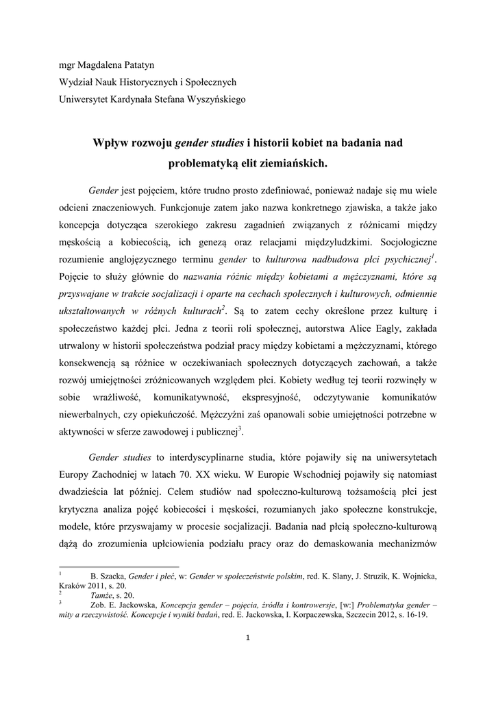 mgr Magdalena Patatyn Wydział Nauk Historycznych i Społecznych Uniwersytet Kardynała Stefana Wyszyńskiego Wpływ rozwoju gender studies i historii kobiet na badania nad problematyką elit ziemiańskich. Gender jest pojęciem, które trudno prosto zdefiniować, ponieważ nadaje się mu wiele odcieni znaczeniowych. Funkcjonuje zatem jako nazwa konkretnego zjawiska, a także jako koncepcja dotycząca szerokiego zakresu zagadnień związanych z różnicami między męskością a kobiecością, ich genezą oraz relacjami międzyludzkimi. Socjologiczne rozumienie anglojęzycznego terminu gender to kulturowa nadbudowa płci psychicznej1. Pojęcie to służy głównie do nazwania różnic między kobietami a mężczyznami, które są przyswajane w trakcie socjalizacji i oparte na cechach społecznych i kulturowych, odmiennie ukształtowanych w różnych kulturach2. Są to zatem cechy określone przez kulturę i społeczeństwo każdej płci. Jedna z teorii roli społecznej, autorstwa Alice Eagly, zakłada utrwalony w historii społeczeństwa podział pracy między kobietami a mężczyznami, którego konsekwencją są różnice w oczekiwaniach społecznych dotyczących zachowań, a także rozwój umiejętności zróżnicowanych względem płci. Kobiety według tej teorii rozwinęły w sobie wrażliwość, komunikatywność, ekspresyjność, odczytywanie komunikatów niewerbalnych, czy opiekuńczość. Mężczyźni zaś opanowali sobie umiejętności potrzebne w aktywności w sferze zawodowej i publicznej3. Gender studies to interdyscyplinarne studia, które pojawiły się na uniwersytetach Europy Zachodniej w latach 70. XX wieku. W Europie Wschodniej pojawiły się natomiast dwadzieścia lat później. Celem studiów nad społeczno-kulturową tożsamością płci jest krytyczna analiza pojęć kobiecości i męskości, rozumianych jako społeczne konstrukcje, modele, które przyswajamy w procesie socjalizacji. Badania nad płcią społeczno-kulturową dążą do zrozumienia upłciowienia podziału pracy oraz do demaskowania mechanizmów 1 B. Szacka, Gender i płeć, w: Gender w społeczeństwie polskim, red. K. Slany, J. Struzik, K. Wojnicka, Kraków 2011, s. 20. 2 Tamże, s. 20. 3 Zob. E. Jackowska, Koncepcja gender – pojęcia, źródła i kontrowersje, [w:] Problematyka gender – mity a rzeczywistość. Koncepcje i wyniki badań, red. E. Jackowska, I. Korpaczewska, Szczecin 2012, s. 16-19. 1 wykluczenia kulturowych i społecznych. Studia te obejmują szeroki zakres różnorodnych, wielowymiarowych ujęć naukowych: od badań psychologicznych, socjologicznych i socjobiologicznych, historycznych, przez badania lingwistyczne i literaturoznawcze po analizy filmoznawcze, medioznawcze i krytyczne studia nad sztuką. Łączą się one z założeniami tzw. nowej humanistyki4. Na płaszczyźnie polityki gender studies zakładają projektowanie zmian społecznych niwelujących wykluczenie, stereotypizację i hierarchizację mężczyzn i kobiet. Jak podkreśla Ewa Domańska, nowa humanistyka wskazuje na niekończącą się walkę o sprawiedliwość, dlatego też w centrum tworzonej przez nią wiedzy stoi problem władzy5. W innym miejscu zaznacza zaś, że w nowej humanistyce nie ma miejsca na kontemplację; jest ona bowiem dyskursem interwencyjnym i walczącym, nastawionym na powodowanie zmian6. W przypadku studiów nad tożsamością płciową podkreśla się ich wymiar etyczny, który ukazuje istniejące nierówności społeczne, oraz polityczny – polegający na projektowaniu zmian społecznych znoszących wykluczenie, stereotypizację i hierarchizację mężczyzn i kobiet. Przedstawiciele studiów genderowych przyjmują jednogłośnie, że nauka powinna mieć charakter krytyczny. Studia genderowe zaczęły się rozwijać, jak to zostało już zasygnalizowane, w polskich ośrodkach naukowych w latach 90., choć już dziesięć lat wcześniej, we współpracy z aktywistkami feministycznymi, odbywały się różnego rodzaju odczyty i spotkania naukowe dotyczące tożsamości płciowej. Demokratyzacja społeczeństwa polskiego oraz możliwość swobodnego zdobywania wiedzy za granicą wzmocniły rozwój i kształtowanie się studiów genderowych. Dlatego też w ciągu ostatnich dwudziestu lat polska nauka musiała zaadaptować zarówno pojęcie gender, jak również jego krytykę7. Proces ten opisała Joanna Mizielińska: Pojawiają się u nas jednocześnie teorie, które rozwijały się latami w innych warunkach kulturowych i do siebie odwoływały. My dostaliśmy je wszystkie niejako naraz i z całego tego chaosu próbujemy wydobyć to, co u nas może się sprawdzić i będzie stanowić użyteczne narzędzie badawcze8. Obecnie studia dotyczące kobiecości, męskości i seksualności są częścią kanonu wiedzy humanistycznej. Problematyka gender jest obecna w wielu 4 Gender w społeczeństwie polskim i na polskich uczelniach, red. E. Krzaklewska, A. Ratecka, J. Struzik i in., „Alma Mater”, nr 122-123, s. 96-98. 5 E. Domańska, Historie niekonwencjonalne, Poznań 2006, s. 17. 6 K. Więckowska, O nowej humanistyce. Z prof. dr hab. Ewą Domańską rozmawia Katarzyna Więckowska, „Litteraria Copernicana” 2011, nr 1(7), s. 220. 7 Gender w społeczeństwie..., s. 96. 8 J. Mizielińska, Płeć, ciało, seksualność. Od feminizmu do teorii queer, Kraków 2006, s. 124–125. 2 ośrodkach akademickich w Polsce – np. Zespół Badań nad Kobietami i Rodziną Instytutu Filozofii i Socjologii Polskiej Akademii Nauk, Ośrodek Naukowo-Badawczy Problematyki Kobiet na Uniwersytecie Łódzkim, Pracownia Krytyki Feministycznej Uniwersytetu Adama Mickiewicza czy Interdyscyplinarna Grupa Gender Studies Uniwersytetu Wrocławskiego. Warto wspomnieć także o Feministycznym Salonie Historycznym, którego członkinie badają kobiece aspekty historii. W polskiej humanistyce ostatnich dwóch dekad obserwujemy równoległy rozwój historii kobiet i studiów gender, miedzy którymi w niewielkim stopniu dochodzi