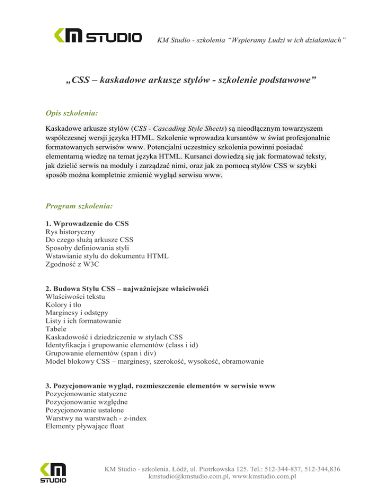 „CSS – kaskadowe arkusze stylów - szkolenie podstawowe” Opis szkolenia: Kaskadowe arkusze stylów (CSS - Cascading Style Sheets) są nieodłącznym towarzyszem współczesnej wersji języka HTML. Szkolenie wprowadza kursantów w świat profesjonalnie formatowanych serwisów www. Potencjalni uczestnicy szkolenia powinni posiadać elementarną wiedzę na temat języka HTML. Kursanci dowiedzą się jak formatować teksty, jak dzielić serwis na moduły i zarządzać nimi, oraz jak za pomocą stylów CSS w szybki sposób można kompletnie zmienić wygląd serwisu www. Program szkolenia: 1. Wprowadzenie do CSS Rys historyczny Do czego służą arkusze CSS Sposoby definiowania styli Wstawianie stylu do dokumentu HTML Zgodność z W3C 2. Budowa Stylu CSS – najważniejsze właściwośći Właściwości tekstu Kolory i tło Marginesy i odstępy Listy i ich formatowanie Tabele Kaskadowość i dziedziczenie w stylach CSS Identyfikacja i grupowanie elementów (class i id) Grupowanie elementów (span i div) Model blokowy CSS – marginesy, szerokość, wysokość, obramowanie 3. Pozycjonowanie wygląd, rozmieszczenie elementów w serwisie www Pozycjonowanie statyczne Pozycjonowanie względne Pozycjonowanie ustalone Warstwy na warstwach - z-index Elementy pływające float Figury geometryczne Animacje Właściwości drukowania Metodoliogia: - mini wykłady w Power Point - ćwiczenia przy komputerach (każdy uczestnik pracuje na osobnym komputerze) - mini filmiki szkoleniowe Informacje organizacyjne: Ilość godzin szkolenia: 14 Godziny szkolenia: 9:15-16:15 Miejsce szkolenia: Łódź, ul Piotrkowska 125 – KM Studio - szkolenia