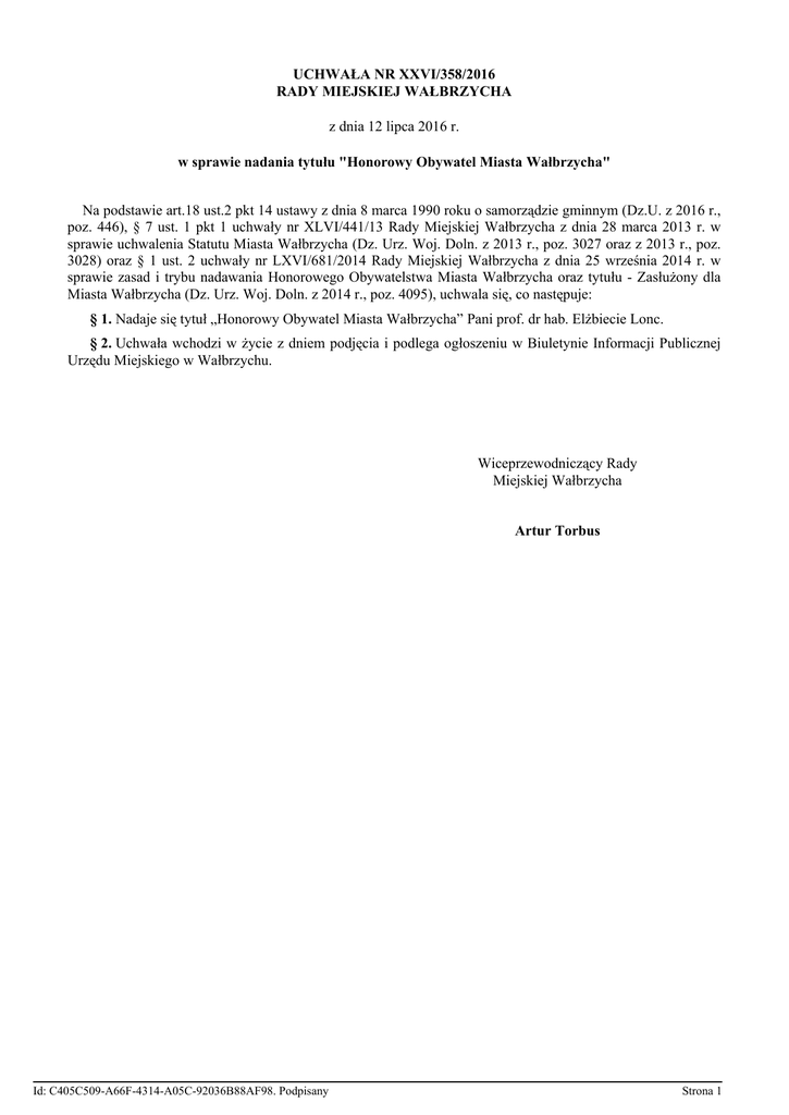 UCHWAŁA NR XXVI/358/2016 RADY MIEJSKIEJ WAŁBRZYCHA z dnia 12 lipca 2016 r. w sprawie nadania tytułu "Honorowy Obywatel Miasta Wałbrzycha" Na podstawie art.18 ust.2 pkt 14 ustawy z dnia 8 marca 1990 roku o samorządzie gminnym (Dz.U. z 2016 r., poz. 446), § 7 ust. 1 pkt 1 uchwały nr XLVI/441/13 Rady Miejskiej Wałbrzycha z dnia 28 marca 2013 r. w sprawie uchwalenia Statutu Miasta Wałbrzycha (Dz. Urz. Woj. Doln. z 2013 r., poz. 3027 oraz z 2013 r., poz. 3028) oraz § 1 ust. 2 uchwały nr LXVI/681/2014 Rady Miejskiej Wałbrzycha z dnia 25 września 2014 r. w sprawie zasad i trybu nadawania Honorowego Obywatelstwa Miasta Wałbrzycha oraz tytułu - Zasłużony dla Miasta Wałbrzycha (Dz. Urz. Woj. Doln. z 2014 r., poz. 4095), uchwala się, co następuje: § 1. Nadaje się tytuł „Honorowy Obywatel Miasta Wałbrzycha” Pani prof. dr hab. Elżbiecie Lonc. § 2. Uchwała wchodzi w życie z dniem podjęcia i podlega ogłoszeniu w Biuletynie Informacji Publicznej Urzędu Miejskiego w Wałbrzychu. Wiceprzewodniczący Rady Miejskiej Wałbrzycha Artur Torbus Id: C405C509-A66F-4314-A05C-92036B88AF98. Podpisany Strona 1 Uzasadnienie Prof. dr hab. Elżbieta Lonc urodziła się w 1951 r. w Kłodzku. Z wykształcenia biolog, specjalność parazytologia. Dyplom magistra otrzymała w 1974 roku na Uniwerytecie Wrocławskim. Bezpośrednio po ukończeniu studiów rozpoczęła pracę na swojej macierzystej uczelni począwszy od stanowiska asystenta, następnie adiunkta i profesora nadzwyczajnego, aż po profesurę zwyczajną. Jednocześnie podjęła studia doktorskie, uzyskując w 1979 roku stopień naukowy doktora. W celu prowadzenia dalszych badań naukowych wyjechała na stypendium naukowe do Stanów Zjednoczonych. W 1988 roku Rada Wydziału Nauk Przyrodniczych Uniwersytetu Wrocławskiego nadała jej stopień naukowy doktora habilitowanego. W 1999 roku otrzymała tytuł profesora nauk biologicznych. Na swojej macierzystej uczelni Elżbieta Lonc poza działalnością dydaktyczno-naukową pełniła wiele istotnych funkcji organizacyjnych. Od 1990 do 1996 roku sprawowała funkcję prodziekana do spraw dydaktycznych Wydziału Nauk Przyrodniczych. W latach 1997-2005 członek Uczelnianej Komisji Akredytacyjnej dla studiów z zakresu ochrony środowiska, zaś w latach 2005 - 2007 członek Państwowej Komisji Akredytacyjnej w zespole ds. kierunków przyrodniczych. Od 1995 r. członek Europejskiego Stowarzyszenia Dziekanów Wydziałów Przyrodniczych (EADS), zaś od 1998 r. krajowy koordynator w unijnym programie ESSENCE. Prof. Elżbieta Lonc od 2000 r. związana jest zawodowo z Państwową Wyższą Szkołą Zawodową im. Angelusa Silesiusa w Wałbrzychu.Jest członkiem wielu towarzystw oraz stowarzyszeń, m.in. Polskiego Towarzystwa Biometrycznego, Polskiego Towarzystwa Parazytologicznego, Komitetu Parazytologii PAN i Wrocławskiego Towarzystwa Naukowego, przewodnicząca Sekcji Parazytologii Ogólnej PTP, a takze sekretarz i członek Rady redakcyjnej "Wiadomości Parazytologicznych". Jej dorobek naukowy, doświadczenie oraz zaangażowanie w pracę zostało wielokrotnie dostrzeżone przez władze uczelni, czego najlepszym dowodem są nagrody rektora Uniwersytetu Wrocławskiego i PWSZ oraz Ministra Nauki i Szkolnictwa Wyższego (2008-2013), Złoty Krzyż Zasługi (1995) oraz medal Komisji Edukacji Narodowej (1997). Dorobek naukowy Pani prof. Lonc obejmuje łącznie ponad 200 publikacji, w których skłąd wchodzą m.in. oryginalne prace twórcze (86) oraz inne, w tym przeglądowe, materiały konferencyjne (89), podręczniki i skrypty, rozdziały książek (19), niepublikowane raporty (9). Autorka podreczników i skryptów z zakresu parazytologii, protozoologii, redaktor obszrnego wydania zbiorowego pt. ”Parazytologia w ochronie środowiska i zdrowia" oraz współautorka podręcznika "Ekologia i ochrona Środowiska". Od 2008 r. prof. Elżbita Lonc pełni funkcję rektora Państwowej Wyższej Szkoły Zawodowej im. Angelusa Silesiusa. Przez ten czas dała się poznać jako doskonały organizator wielu inicjatyw realziowanych wraz ze studentami, pracownikami oraz partnerami samorządowymi, gospodarczymi i kulturalnymi na terenie Dolnego Śląska. Pani Profesor przyczyniła się do poszerzenia oferty edukacyjnej o inżynierskie kierunki przyrodniczo-techniczne oraz kierunki magisterskie. Rezultatem intensywnie poszerzanej oferty studiów był wzrost liczby studentów kształacących sie na wałbrzyskiej uczelni. Efektem ogromengo wysiłku organizacyjnego jest internacjonlizacja procesu kształcenia i ukierunkowanie procesu dydaktycznego na praktyczne przygotowanie absolwentów do wymagań regionalnego rynku pracy. Biorąc powyższe pod uwagę, prof. dr hab.Elżbieta Lonc w pełni zasługuje na tytuł „Honorowy Obywatel Miasta Wałbrzycha”. Podjęcie uchwały zostało poprzedzone realizacją procedury wynikającej z uchwały nr LXVI/681/2014 Rady Miejskiej Wałbrzycha z dnia 25 września 2014 r. w sprawie zasad i trybu nadawania Honorowego Obywatelstwa Miasta Wałbrzycha oraz tytułu - Zasłużony dla Miasta Wałbrzycha. Wiceprzewodniczący Rady Miejskiej Wałbrzycha Artur Torbus Id: C405C509-A66F-4314-A05C-92036B88AF98. Podpisany Strona 1