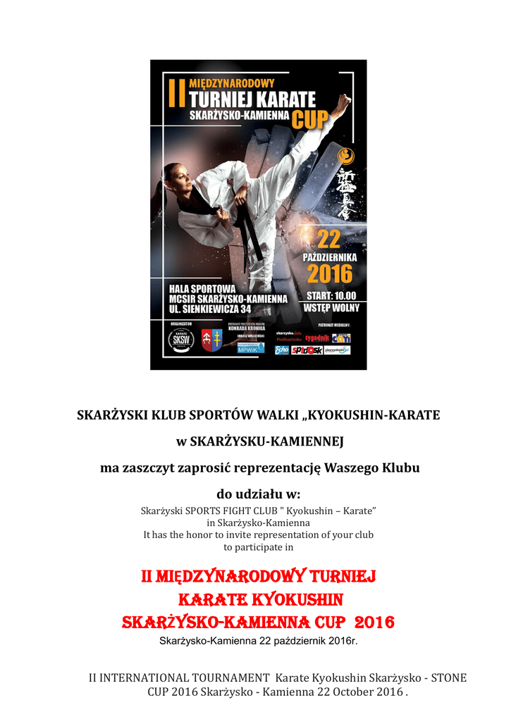 SKARŻYSKI KLUB SPORTÓW WALKI „KYOKUSHIN-KARATE w SKARŻYSKU-KAMIENNEJ ma zaszczyt zaprosić reprezentację Waszego Klubu do udziału w: Skarżyski SPORTS FIGHT CLUB " Kyokushin – Karate” in Skarżysko-Kamienna It has the honor to invite representation of your club to participate in II MIĘDZYNARODOWY TURNIEJ KARATE KYOKUSHIN SKARŻYSKO-KAMIENNA CUP 2016 Skarżysko-Kamienna 22 październik 2016r. II INTERNATIONAL TOURNAMENT Karate Kyokushin Skarżysko - STONE CUP 2016 Skarżysko - Kamienna 22 October 2016 . 1.ORGANIZATOR Skarżyski Klub Sportów Walki „Kyokushin-Karate” 26-110 Skarżysko-Kamienna, ul. Sezamkowa 23 tel. kom. 601 206 812 e-mail: [email protected] 2.WSPÓŁORGANIZATOR Prezydent Miasta Konrad Kroning 3. TERMIN I MIEJSCE 22. październik 2016r.(sobota) Hala sportowo – widowiskowa Miejskiego Centrum Sportu i Rekreacji Ul. Sienkiewicza , 26-110 Skarżysko-Kamienna DATE AND PLACE 22 October 2016 . (Saturday ) Candlestick Park - a scenic Municipal Sports and Recreation Centre Ul . Sienkiewicz, 26-110 Skarżysko - Kamienna 4. KATEGORIE KUMITE FULL CONTACT I SEMI KONTAKT Młodzieżowcy 18-21 lat Kumite mężczyzn: -65 kg; -75 kg; +75 kg Kumite kobiet: -55 kg; -60 kg; +60 kg Młodzieżowcy 18-21 Kumite male -65 kg; -75 Kg ; 75 kg Women Kumite -55 kg; -60 Kg ; 60 kg Junior 16 – 17 lat (1999 – 2000) Kumite chłopców w kategoriach wagowych: -60, -70, +70 kg Kumite dziewcząt w kategoriach wagowych: -60, +60 kg Junior 16 - 17 years (1999 - 2000) Kumite boys in the weight categories : -60 , -70 , 70 kg Kumite girls weight categories : -60 , 60 kg Młodzik 14 – 15 lat (2001 – 2002) Kumite chłopców w kategoriach wagowych: -55, -60, +60 kg Kumite dziewcząt w kategoriach wagowych: -55, -60, +60 kg The youth 14 - 15 years ( 2001-2002 ) Kumite boys in the weight categories : -55 , -60 , 60 kg Kumite girls weight categories : -55 , -60 , 60 kg Kadet 12 – 13 lat (2003 – 2004) Kumite chłopców w kategoriach wagowych: -40, -50, +50 kg Kumite dziewcząt w kategoriach wagowych: -40, -50, +50 kg Cadet 12 - 13 years (2003 - 2004) Kumite boys in the weight categories : -40 , -50 , 50 kg Kumite girls weight categories : -40 , -50 , 50 kg Dzieci 10-11 lat (2005 – 2006) Kumite chłopców w kategoriach wagowych: -30, -35, +35 kg Kumite dziewcząt w kategoriach wagowych: -30, -35, +35 kg Children 10-11 years (2005 - 2006) Kumite boys in the weight categories : -30 , -35 , 35 kg Kumite girls weight categories : -30 , -35 , 35 kg Dzieci 8 – 9 lat (2007 – 2008) Kumite chłopców w kategoriach wagowych: -30, +30 kg Kumite dziewcząt w kategoriach wagowych: -30, +30 kg Children 8 - 9 years (2007 - 2008) Kumite boys in the weight categories : -30 , 30 kg Kumite girls weight categories : -30 , 30 kg Dzieci 6 – 7 lat (2009 – 2010) Kumite chłopców w kategoriach wagowych: - 25, +25 kg Kumite dziewcząt w kategoriach wagowych: -20, +20 kg Children 6 - 7 years (2009 - 2010) Kumite boys in the weight categories : -25 , +25 kg Kumite girls weight categories : -20 , +20 kg Zawodnicy przed walką ubierają: Kumite full kontakt – Młodzieżowcy. Ochraniacze na nogi (stopa goleń) Kumite semi kontakt – Juniorzy. Kaski, ochraniacze na nogi (stopa goleń) Kumite semi kontakt – Młodziki i kadeci. Kaski, hogo, ochraniacze na nogi (stopa goleń), piąstkówki Kumite semi kontakt – Kategoria „Dzieci”. Kaski z kratką lub szybką, ochraniacze na nogi (stopa goleń), piąstkówki Players dress before the fight : Kumite full contact - Młodzieżowcy . Shin ( shin foot ) Kumite semi contact - Juniors . Helmets , shin ( shin foot ) Kumite semi contact - youngster and cadets . Helmets , hogo , shin ( shin foot ) piąstkówki Kumite semi contact - Category "Children " . Helmets grille or fast, shin ( shin foot ) piąstkówki Każdy zawodnik powinien mieć swoje suspensoria, założone pod kimonem. Kadeci i dzieci mogą stosować mawashi geri gedan. Wszelkie techniki obrotowe i opadające na strefę jodan nie wolno stosować. Uwaga: Nie dotyczy to młodzieżowców. Przy weryfikacji, po stwierdzeniu wagi wyższej od deklarowanej ponad 1 kg nastąpi dyskwalifikacja zawodnika. W zgłoszeniu proszę podać dokładną wagę zawodnika. Each player should have their Groin , established under the kimono . Cadets and children can not use mawashi geri gedan . Any technique rotating and falling on the area iodate can be used. Note: does not apply to young riders . At verification , after finding a higher weight than declared more than 1 kg will be disqualification . In the application , please provide the exact weight of a player. Czas walki: Młodzieżowcy 2 dogrywka 2, waga, 2 min. Juniorzy 2 min, dogrywka 2 min. Młodziki i kadeci 1,5 minuty, dogrywka 1 min. Dzieci 1 minuta, bez dogrywki. Fight time : Młodzieżowcy 2 2 overtime , weight, 2 min . Juniors 2 minutes , extra time 2 min . Youngsters and cadets 1.5 minutes , extra time 1 minute . Children 1 minute, excluding overtime . 5. WARUNKI UCZESTNICTWA I INFORMACJE OGÓLNE W Turnieju mogą brać udział zaproszone reprezentacje klubów składające się z dowolnej liczby zawodników w poszczególnych kategoriach wiekowych. W przypadku zgłoszenia się niedostatecznej ilości zawodników minimum 4, dana kategoria może być odwołana lub połączona z inną. 5. CONDITIONS OF PARTICIPATION AND GENERAL INFORMATION The tournament is open to invited teams of clubs made up of any number of players in each age category . If the application is insufficient competitors for a minimum 4 , a category may be canceled or merged with another Startowe od zawodnika wynosi – 20,00 złotych, które należy wpłacić w dniu zawodów w kasie klubu. W opłatę startową wliczony jest obiad. Sędziowie otrzymują obiad gratis. Do zawodów będą dopuszczeni zawodnicy zgłoszeni w terminie i zweryfikowani, którzy posiadają: - aktualną kartę zdrowia sportowca - aktualną legitymację szkolną - zgodę rodziców na start w zawodach (dotyczy zawodników nie pe