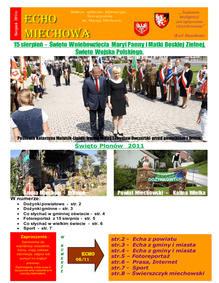 Sierpień 2011r. Biuletyn społeczno- informacyjny. Stowarzyszenia im. Macieja Miechowity „ Zadaniem inteligencji jest opisywanie i krytykowanie” Echo Miechowa (Karl Mannheim) 15 sierpień - Święto Wniebowzięcia Maryi Panny i Matki Boskiej Zielnej, Święto Wojska Polskiego. Posłowie Katarzyna Matusik-Lipiec, Ireneusz Raś i Zbysław Owczarski przed pomnikiem z Orłem. Święto Plonów 2011 Gmina Miechów - Jaksice Powiat Miechowski - Kalina Wielka W numerze: Dożynki powiatowe - str. 2 Dożynki gminne – str. 3 Co słychać w gminnej oświacie - str. 4 Fotoreportaż z 15 sierpnia - str. 5 Co słychać w wielkim świecie - str. 6 Sport - str. 7 Zaproszenie : Zapraszamy do współpracy wszystkich, którzy mają ciekawe informacje, zdjęcia lub pomysł na artykuł prasowy. Zastrzegamy sobie praw o dysponow ania nadesłanymi pocztą materiałami. W N U M E R Z E ECHO 08/11 (57) str.2 str.3 str.4 str.5 – str.6 str.7 str.8 – Echa z powiatu Echa z gminy i miasta Echa z gminy i miasta Fotoreportaż Prasa, Internet Sport Świerszczyk miechowski ECHA Z POWIATU Powiatowe Swięto Plonów ad 2011 - Kalina Wielka – gm. Słaboszów. W ostatnią niedzielę sierpnia odbyło się jedenaste już Św ięto Plonów pow iatu m iechow skiego. Gospodarzem dożynek była gm ina Słaboszów a m iejscem uroczystości Kalina Wielka. W czasie uroczystej Mszy św. odprawiający mszę ks. proboszcz Adam Bucki pośw ięcił bochen chleba w ypieczony z tegorocznych zbiorów i w ieńce dożynkowe poszczególnych gmin naszego pow iatu. Po mszy, korow ód prow adzony przez kapelę ,,Słaboszanie" oraz starostów dożynkow ych, Tom asza Wolskiego z Nieszkow a gm. Słaboszów i Wioletty Pluty z Górki Kościejow skiej gm. Racław ice, pomaszerował na stadion sportowy, gdzie gości i uczestników witał współorganizator imprezy Zbigniew Kita, w ójt gminy Słaboszów . Potem głos zabierali przybyli na uroczystość parlamentarzyści i oficjele. Wszyscy w yrażali uznanie dla ciężkiej pracy rolników i życzyli im w szystkiego najlepszego. Cieszę się, że w naszym powiecie kontynuowana jest tradycja urządzania dożynek, która trwale związana jest z rolniczym charak terem tutejszej ziemi. Dożynki nadal są najlepszą i sprawdzoną formą publicznego podziękowania rolnikom za całoroczny trud - pow iedział starosta Marian Gam rat w swym w ystąpieniu. Potem starostowie dożynkow i - przekazali staroście bochen chleba - symbol całorocznej pracy miejscow ych rolników . Starosta zapew nił o jego spraw iedliw ym podziale i w asyście starostów i w ójta obdzielił nim gości i w idow nię. Dalszą część dożynkow ego obrzędu w ypełniły prezentacje wieńców wykonanych przez KGW ze w szystkich gmin. Później na dożynkowej estradzie prezentowali swe umiejętności uczniowie i artyści ludow i. Imprezę zakończył atrakcyjny w ystęp zespołu „Yagooar”. Kolejne dożynki pow iatow e w 2012r. odbędą się w gminie Racław ice. Barw ny korowód dożynkowy, prowadzony przez miejscową kapelę „Słaboszanie”, udał się na stadion sportow y, gdzie Wójt Słabos zow a Zbigniew Kita i Starosta Miechow ski Marian Gam rat otw arli oficjalnie uroczystości. W asyście Starostów dożynek i Kapuścianej Pary Królewskiej Starosta przyjął bochen chleba wypieczony z tegorocznych zbiorów , którym potem spraw iedliw ie dzielił dożynkow ych gości. Zaproszeni goście i m iejscowi oficjele, w tym wszyscy trzej dotychczasowi Starostow ie naszego pow iatu – Mieczysław Bertek, Zygm unt Szopa i Marian Gam rat – oglądali prezentacje wieńców dożynkowych poszczególnych gmin powiatu m iechowskiego. Licznie przybyłe dzieci baw iły się w parku rozryw ki a kandydaci na posłów (na zdj. Andrzej Klim czak) zbierali przedw yborcze punkty. Gmina Kozłów stawia na oświatę ?! #/ Hasło zam ieszczone w tytule wydaje się być oczywiste. Zarówno w ójt jak i jego m ałżonka są z wykształcenia nauczycielami. Rów nież dw ie siostry żony w ójta trudnią się tą profesją. Stąd w ydawałoby się oczywisty w niosek, że jednym z priorytetów działań gospodarza gm iny jest szeroko rozum iana ośw iata gm inna. Z pow yżej w yłuszczonych pow odów m oże to także zatrącać o politykę prorodzinną. Niestety! Na zdjęciach, wykonanych 19 sierpnia, w idać, że now a i jedyna gm inna szkoła to ciągle jeszcze jeden w ielki plac budow y. Trw ają gorączkow e prace w ykończeniow e, malarskie i sprzątania. Jednocześnie zw ożone jest w yposażenie ze zlikw idow anych szkół gminnych. Trochę to niepokojące bo w ójt publicznie deklarow ał, że inw estycja zostanie oddana do użytku 22 lipca. Jednak jesteśmy przekonani, że now y rok szkolny rozpocznie się zgodnie z planem. Choćby nie w szystko w now ym budynku było zapięte na ostatni guzik. To kw estia prestiżu gminnych w ładz. My tylko zw yczajnie po ludzku w spółczujemy tym maluchom, które będą zmuszone zasiąść w now ych salach lekcyjnych. Znajomy budow laniec informuje nas, że zgodnie ze standardami now y budynek, jeśli pełni funkcje mieszkalne, biurow e lub inne zw iązane z długotrw ałym przebywaniem w nowo wybudowanych pomieszczeniach ludzi, pow inny mieć kilkumiesięczny okres „karencji” użytkow ania. Chodzi o to aby materiały budow lane, malarskie, stolarskie, w ykładzinowe i inne miały czas, jak to ujął fachowiec, „w ydobrzeć”. Aby czyte lnikom uśw iadomić o co chodzi proponujemy następujący eksperyment: proszę spróbować przez kilka godzin pracow ać w św ieżo pomalow anym pomieszczeniu. W w ypadku budynku szkolnego w charakterze mimow olnych uczestników podobnego eksperymentu mogą zostać użyte kilkuletnie dzieci! #/ Na sesji Rady Gm iny, jeden z radnych oświadczył, że po analizie polityki inwestycyjnej władz gm innych, doszedł do w niosku, że gm ina tonie! Sam w ójt przyznaje, że zadłużenie gminy sięga 7 m ilionów zł. ale nie w ygląda na zmartwionego takim stanem 