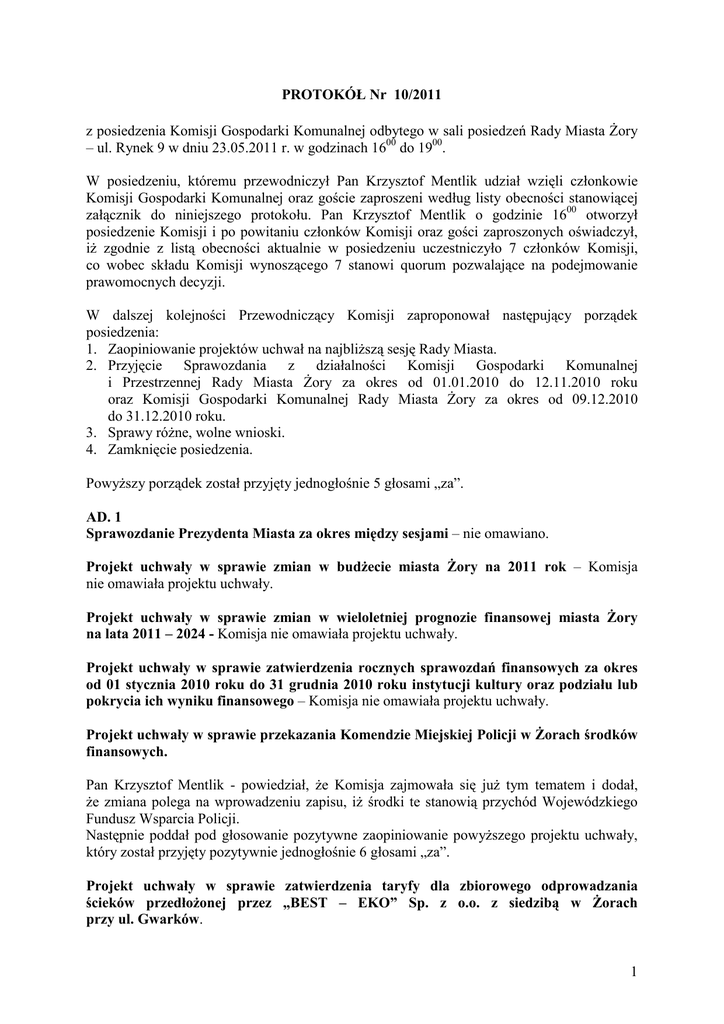PROTOKÓŁ Nr 10/2011 z posiedzenia Komisji Gospodarki Komunalnej odbytego w sali posiedzeń Rady Miasta śory – ul. Rynek 9 w dniu 23.05.2011 r. w godzinach 1600 do 1900. W posiedzeniu, któremu przewodniczył Pan Krzysztof Mentlik udział wzięli członkowie Komisji Gospodarki Komunalnej oraz goście zaproszeni według listy obecności stanowiącej załącznik do niniejszego protokołu. Pan Krzysztof Mentlik o godzinie 1600 otworzył posiedzenie Komisji i po powitaniu członków Komisji oraz gości zaproszonych oświadczył, iŜ zgodnie z listą obecności aktualnie w posiedzeniu uczestniczyło 7 członków Komisji, co wobec składu Komisji wynoszącego 7 stanowi quorum pozwalające na podejmowanie prawomocnych decyzji. W dalszej kolejności Przewodniczący Komisji zaproponował następujący porządek posiedzenia: 1. Zaopiniowanie projektów uchwał na najbliŜszą sesję Rady Miasta. 2. Przyjęcie Sprawozdania z działalności Komisji Gospodarki Komunalnej i Przestrzennej Rady Miasta śory za okres od 01.01.2010 do 12.11.2010 roku oraz Komisji Gospodarki Komunalnej Rady Miasta śory za okres od 09.12.2010 do 31.12.2010 roku. 3. Sprawy róŜne, wolne wnioski. 4. Zamknięcie posiedzenia. PowyŜszy porządek został przyjęty jednogłośnie 5 głosami „za”. AD. 1 Sprawozdanie Prezydenta Miasta za okres między sesjami – nie omawiano. Projekt uchwały w sprawie zmian w budŜecie miasta śory na 2011 rok – Komisja nie omawiała projektu uchwały. Projekt uchwały w sprawie zmian w wieloletniej prognozie finansowej miasta śory na lata 2011 – 2024 - Komisja nie omawiała projektu uchwały. Projekt uchwały w sprawie zatwierdzenia rocznych sprawozdań finansowych za okres od 01 stycznia 2010 roku do 31 grudnia 2010 roku instytucji kultury oraz podziału lub pokrycia ich wyniku finansowego – Komisja nie omawiała projektu uchwały. Projekt uchwały w sprawie przekazania Komendzie Miejskiej Policji w śorach środków finansowych. Pan Krzysztof Mentlik - powiedział, Ŝe Komisja zajmowała się juŜ tym tematem i dodał, Ŝe zmiana polega na wprowadzeniu zapisu, iŜ środki te stanowią przychód Wojewódzkiego Fundusz Wsparcia Policji. Następnie poddał pod głosowanie pozytywne zaopiniowanie powyŜszego projektu uchwały, który został przyjęty pozytywnie jednogłośnie 6 głosami „za”. Projekt uchwały w sprawie zatwierdzenia taryfy dla zbiorowego odprowadzania ścieków przedłoŜonej przez „BEST – EKO” Sp. z o.o. z siedzibą w śorach przy ul. Gwarków. 1 Pan Krzysztof Mentlik – powiedział, Ŝe na jednym z ostatnich posiedzeń Komisji szeroko omówiono ten temat. Pan Bronisław Pruchnicki – powiedział, Ŝe podwyŜka jest tylko 4,41 zł z czego 5% stanowi podwyŜka płac. Pan Krzysztof Mentlik – zapytał, jak stawki BEST – EKO kształtują się w porównaniu z PWiK śory Sp. z o.o.? Pan Bronisław Pruchnicki – powiedział, Ŝe BEST – EKO ma troszkę niŜsze stawki. Pan Krzysztof Mentlik poddał pod głosowanie pozytywne zaopiniowanie projektu uchwały w sprawie zatwierdzenia taryfy dla zbiorowego odprowadzania ścieków przedłoŜonej przez „BEST – EKO” Sp. z o.o. z siedzibą w śorach przy ul. Gwarków, który przyjęto pozytywnie jednogłośnie 6 głosami „za”. Projekt uchwały w sprawie nadania imienia Przedszkolu nr 13 w śorach - Komisja nie omawiała projektu uchwały. Projekt uchwały w sprawie likwidacji I Liceum Profilowanego, II Liceum Profilowanego im. ks. prof. Józefa Tischnera oraz I Uzupełniającego Liceum Ogólnokształcącego dla Dorosłych - Komisja nie omawiała projektu uchwały. Projekt uchwały w sprawie przeprowadzenia konsultacji z mieszkańcami. Pan Daniel Wawrzyczek – powiedział, Ŝe chodzi o 3 działki będące własnością miasta Rybnika o łącznej powierzchni 2601 m2 na granicy śor i Rybnika w ciągu drogi która będzie stanowiła bajpas łączący obwiednię północną w kierunku ul. Rybnickiej. Miasto Rybnik zwróciło się z wnioskiem o skorygowanie granicy na rzecz Miasta śory. Jest to projekt uchwały kierunkowej rozpoczynającej cały tryb konsultacji. Cała procedura trwa dosyć długo. Ostateczną decyzję o powiększeniu granic Miasta podejmuje Prezes Rady Ministrów. Pani Jadwiga Kempny – dodała, Ŝe jest to pozytywna informacja, poniewaŜ miasto trochę się powiększy. Projekt uchwały w sprawie zmiany Uchwały Nr 482/XLIV/10 Rady Miasta śory z dnia 11.02.2010 r., który został przesłany celem konsultacji. Pan Krzysztof Mentlik – zapytał, czy są to nowe stawki? Pan Bronisław Pruchnicki – powiedział, Ŝe jest to zupełnie nowa propozycja. Polega ona na tym, Ŝe firma zewnętrzna wybudowałaby na własny koszt nowe wiaty autobusowe, których powierzchnia byłaby wynajmowana na reklamy. Pan Krzysztof Mentlik – zapytał, jak wyglądają takie wiaty autobusowe? Pan Daniel Wawrzyczek – powiedział, Ŝe wygląda to w ten sposób, Ŝe z boku wiaty autobusowej jest panel z reklamą. 2 Pan Krzysztof Mentlik – zapytał, gdzie zostaną ustawione te wiaty autobusowe? Pan Daniel Wawrzyczek – powiedział, Ŝe podejrzewa iŜ raczej w mieście ze względu na powierzchnie reklamowe. Pan Krzysztof Mentlik – zapytał, co z wiatami autobusowymi, które znajdują się w miastach? Pan Bronisław Pruchnicki – powiedział, Ŝe na pewno zostaną one zagospodarowane. Pan Krzysztof Mentlik – powiedział, Ŝe trudno się odnieść jeśli chodzi o stawki. Zapytał, jak wygląda to w innych miastach? Dodał, Ŝe w projekcie uchwały jest mowa o stawce dziennej za wynajęcie 1 m2. Zapytał, kto będzie wiaty utrzymywał po wybudowaniu? Pani Jadwiga Kempny – powiedziała, Ŝe z informacji uzyskanych na posiedzeniu Klubu śorskie Porozumienie i Waldemar Socha wynikało, Ŝe firma będzie wiaty utrzymywała. Pan Krzysztof Mentlik - powiedział, Ŝe chciałby znać więcej szczegółów dotyczących projektu uchwały i zaproponował, aby nie opiniować jej w dniu dzisiejszym tylko przed sesją,