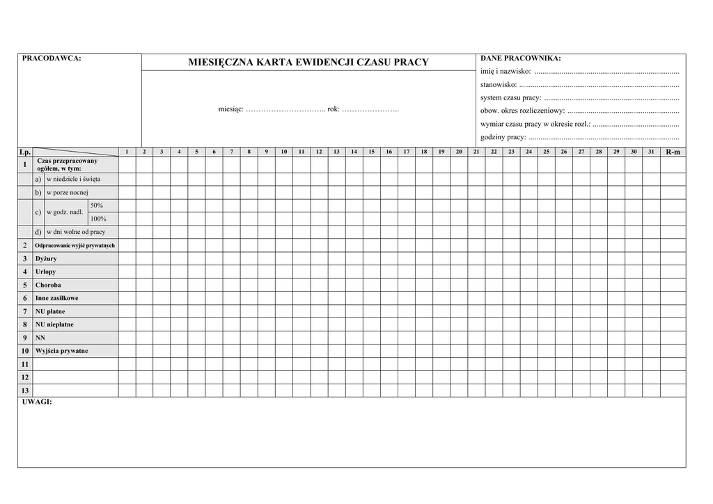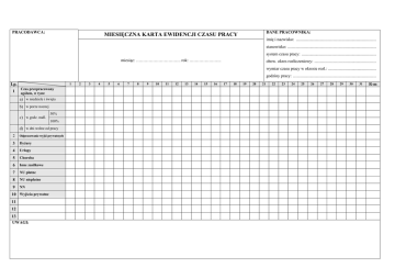 PRACODAWCA: DANE PRACOWNIKA: MIESIĘCZNA KARTA EWIDENCJI CZASU PRACY imię i nazwisko: ........................................................................... stanowisko: ................................................................................... system czasu pracy: ...................................................................... miesiąc: ………………………….. rok: ………………….. obow. okres rozliczeniowy: .......................................................... wymiar czasu pracy w okresie rozl.: ............................................. godziny pracy: .............................................................................. Lp. 1 1 Czas przepracowany ogółem, w tym: a) w niedziele i święta b) w porze nocnej 50% c) w godz. nadl. 100% d) w dni wolne od pracy 2 Odpracowanie wyjść prywatnych 3 Dyżury 4 Urlopy 5 Choroba 6 Inne zasiłkowe 7 NU płatne 8 NU niepłatne 9 NN 10 Wyjścia prywatne 11 12 13 UWAGI: 2 3 4 5 6 7 8 9 10 11 12 13 14 15 16 17 18 19 20 21 22 23 24 25 26 27 28 29 30 31 R-m