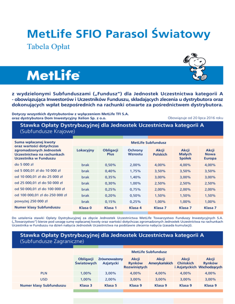 MetLife SFIO Parasol Światowy Tabela Opłat z wydzielonymi Subfunduszami („Fundusz”) dla Jednostek Uczestnictwa kategorii A - obowiązująca Inwestorów i Uczestników Funduszu, składających zlecenia u dystrybutora oraz dokonujących wpłat bezpośrednich na rachunki otwarte za pośrednictwem dystrybutora. Dotyczy wszystkich dystrybutorów z wyłączeniem MetLife TFI S.A. oraz dystrybutora Dom Inwestycyjny Xelion Sp. z o.o. Obowiązuje od 20 lipca 2016 roku Stawka Opłaty Dystrybucyjnej dla Jednostek Uczestnictwa kategorii A (Subfundusze Krajowe) Suma wpłacanej kwoty oraz wartości dotychczas zgromadzonych Jednostek Uczestnictwa na rachunkach Uczestnika w Funduszu MetLife Subfundusz Lokacyjny Obligacji Plus Ochrony Wzrostu Akcji Polskich Akcji Małych Spółek Akcji Nowa Europa do 5 000 zł brak 0,50% 2,00% 4,00% 4,00% 4,00% od 5 000,01 zł do 10 000 zł brak 0,40% 1,75% 3,50% 3,50% 3,50% od 10 000,01 zł do 25 000 zł brak 0,35% 1,40% 3,00% 3,00% 3,00% od 25 000,01 zł do 50 000 zł brak 0,30% 1,00% 2,50% 2,50% 2,50% od 50 000,01 zł do 100 000 zł brak 0,25% 0,75% 2,00% 2,00% 2,00% od 100 000,01 zł do 250 000 zł brak 0,20% 0,50% 1,50% 1,50% 1,50% powyżej 250 000 zł brak 0,15% 0,25% 1,00% 1,00% 1,00% Klasa 0 Klasa 1 Klasa 4 Klasa 7 Klasa 7 Klasa 7 Numer klasy Subfunduszu Do ustalenia stawki Opłaty Dystrybucyjnej za zbycie Jednostek Uczestnictwa MetLife Towarzystwo Funduszy Inwestycyjnych S.A. („Towarzystwo”) bierze pod uwagę sumę wpłacanej kwoty oraz wartości dotychczas zgromadzonych Jednostek Uczestnictwa na rachunkach Uczestnika w Funduszu na dzień nabycia Jednostek Uczestnictwa na podstawie zlecenia nabycia (zasada kumulacji). Stawka Opłaty Dystrybucyjnej dla Jednostek Uczestnictwa kategorii A (Subfundusze Zagraniczne) MetLife Subfundusz Obligacji Zrównoważony Azjatycki Światowych Akcji Akcji Akcji Akcji Rynków Amerykańskich Chińskich Rynków Rozwiniętych i Azjatyckich Wschodzących 4,00% PLN 1,00% 3,00% 4,00% 4,00% 4,00% USD 1,00% 2,00% 3,00% 3,00% 3,00% 3,00% Numer klasy Subfunduszu Klasa 3 Klasa 5 Klasa 9 Klasa 9 Klasa 9 Klasa 9 Opłata Umorzeniowa Za odkupienie Jednostek Uczestnictwa Subfunduszy MetLife SFIO Parasola Światowego, Towarzystwo nie pobiera Opłaty Umorzeniowej. Zamiana Jednostek Uczestnictwa Za dokonanie zamiany Towarzystwo pobiera opłatę składającą się z dwóch części: stałą Opłatę za Zamianę oraz zmienną Opłatę za Zamianę. Stała Opłata za Zamianę nie jest pobierana. Zmienna Opłata za Zamianę jest równa iloczynowi kwoty zamiany i stawki zmiennej Opłaty za Zamianę. Zmienna Opłata za Zamianę pobierana jest przez Towarzystwo w Subfunduszu, w którym nabywane są Jednostki Uczestnictwa. Stawka zmiennej Opłaty za Zamianę stanowi różnicę pomiędzy stawką Opłaty Dystrybucyjnej w Subfunduszu docelowym i stawką Opłaty Dystrybucyjnej w Subfunduszu źródłowym. W przypadku gdy różnica ta jest wartością ujemną stawka Zmiennej opłaty za Zamianę wynosi 0%. Zasada kumulacji przy naliczaniu zmiennej Opłaty za Zamianę przy Zamianie W przypadku zamiany dokonywanej do Subfunduszu Krajowego podstawą ustalenia stawek Opłat Dystrybucyjnych w Subfunduszu źródłowym i docelowym, dla potrzeb obliczenia stawki zmiennej Opłaty za Zamianę, jest wartość aktywów netto Subfunduszu źródłowego przypadających na Jednostki Uczestnictwa zapisane na rachunkach Uczestnika przed zamianą, powiększone o wartość aktywów netto Subfunduszu docelowego przypadających na Jednostki Uczestnictwa zapisane na rachunkach Uczestnika przed zamianą. W przypadku zamiany dokonywanej w walucie PLN do Subfunduszu Zagranicznego stawka Opłaty Dystrybucyjnej w Subfunduszu źródłowym jest równa maksymalnej stawce Opłaty Dystrybucyjnej w Subfunduszu źródłowym określonej w Tabeli Opłat. Zasada pobierania zmiennej Opłaty za Zamianę Każdy z Subfunduszy Funduszu oznaczony został numerem klasy wskazanym w niniejszej Tabeli. Uczestnicy Funduszu dokonujący zamiany Jednostek Uczestnictwa danego Subfunduszu na Jednostki Uczestnictwa innego Subfunduszu oznaczonego wyższym numerem klasy, zobowiązani są jedynie do jednorazowego poniesienia zmiennej Opłaty za Zamianę, od aktywów odpowiadających tym Jednostkom Uczestnictwa, za dokonanie zamiany do Subfunduszu o danym wyższym numerze klasy. Oznacza to, że w przypadku posiadania przez Uczestnika Jednostek Uczestnictwa danego Subfunduszu oznaczonego danym numerem klasy każda kolejna zamiana aktywów odpowiadających tym Jednostkom Uczestnictwa w ramach Funduszu, o ile nie zostanie dokonana do Subfunduszu o wyższym niż w danym Subfunduszu numerze klasy, będzie zwolniona ze zmiennej Opłaty za Zamianę. W przypadku dokonania zamiany do Subfunduszu oznaczonego tym samym numerem klasy zmienna Opłata za Zamianę nie zostanie pobrana. Przykład (dla uproszczenia założono stałą cenę J.U. poszczególnych Subfunduszy): 1. Wpłata Uczestnika (MetLife Subfundusz Obligacji Plus, klasa 1): 10 000,00 zł Cena Jednostki Uczestnictwa MetLife Subfunduszu Obligacji Plus: 10,00 zł Stawka Opłaty Dystrybucyjnej: 0,40 % Kwota Opłaty Dystrybucyjnej: 10 000,00 zł x 0,40% = 40,00 zł Kwota zainwestowana: 10 000,00 zł – 40,00 zł = 9 960,00 zł Liczba nabytych Jednostek Uczestnictwa: 9 960,00 zł : 10 zł = 996,000000 J.U. Powyższe aktywa Uczestnika znalazły się w Subfunduszu oznaczonym numerem klasy 1. 2. Zamiana z MetLife Subfunduszu Obligacji Plus (klasa 1) do MetLife Subfunduszu Akcji Polskich (klasa 7): 9 960,00 zł Cena Jednostki Uczestnictwa MetLife Subfunduszu Akcji Polskich: 20,00 zł Stawka Opłaty Dystrybucyjnej (MetLife Subfundusz Obligacji Plus) dla tej kwoty: 0,40 % Stawka Opłaty Dystrybucyjnej (MetLife Subfundusz Akcji Polskich) dla tej kwoty: 3,50 % Stawka zmiennej Opłaty za Zamianę: 3,50% – 0,40% = 3,10 % Kwota zmiennej Opłaty za Zamianę: 9 960,00 zł x 3,10% = 308,76 zł Kwota po zamianie: 9 960,00 zł – 308,76 zł = 9 651,24 zł 9 651,24 zł : 20 zł = 48